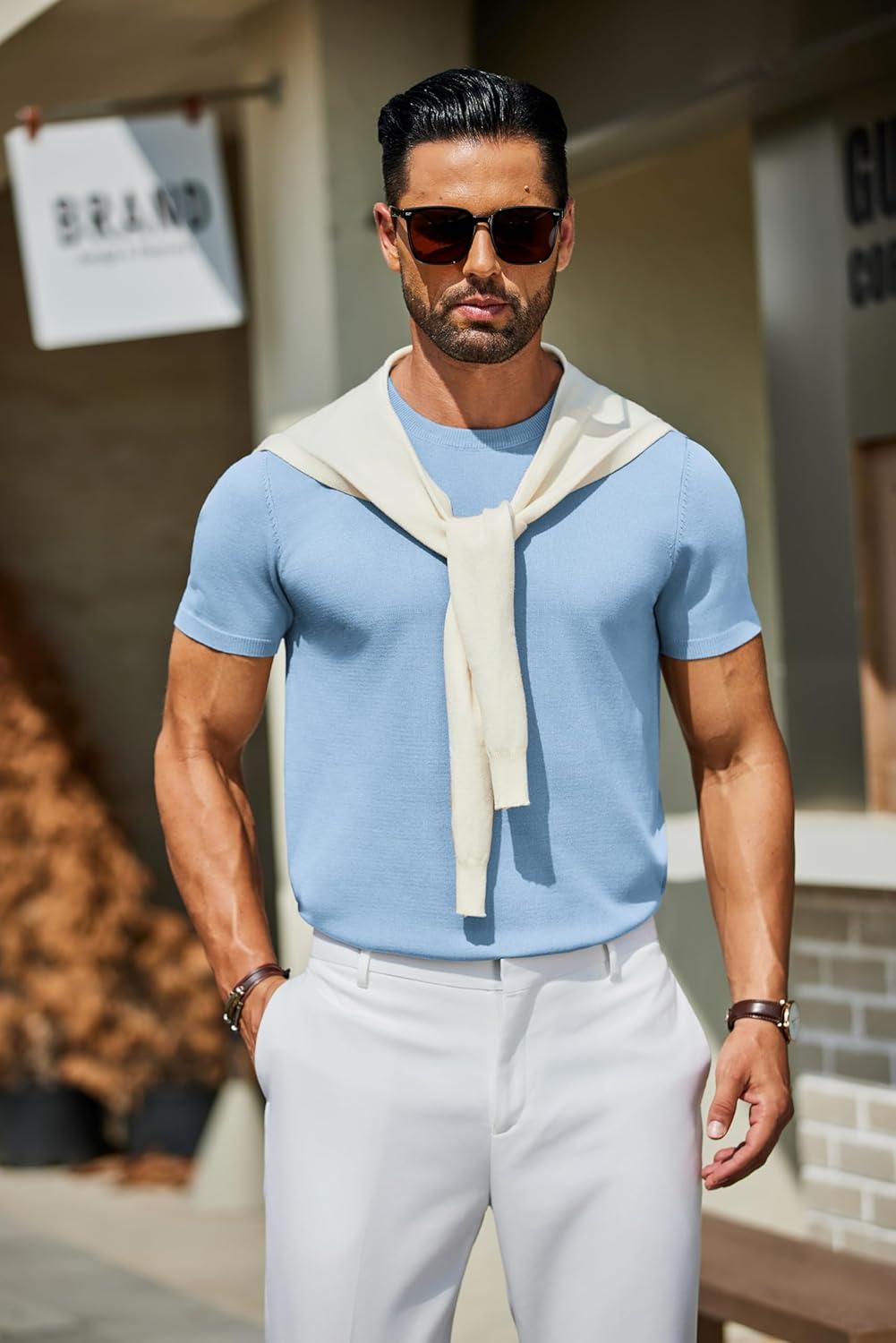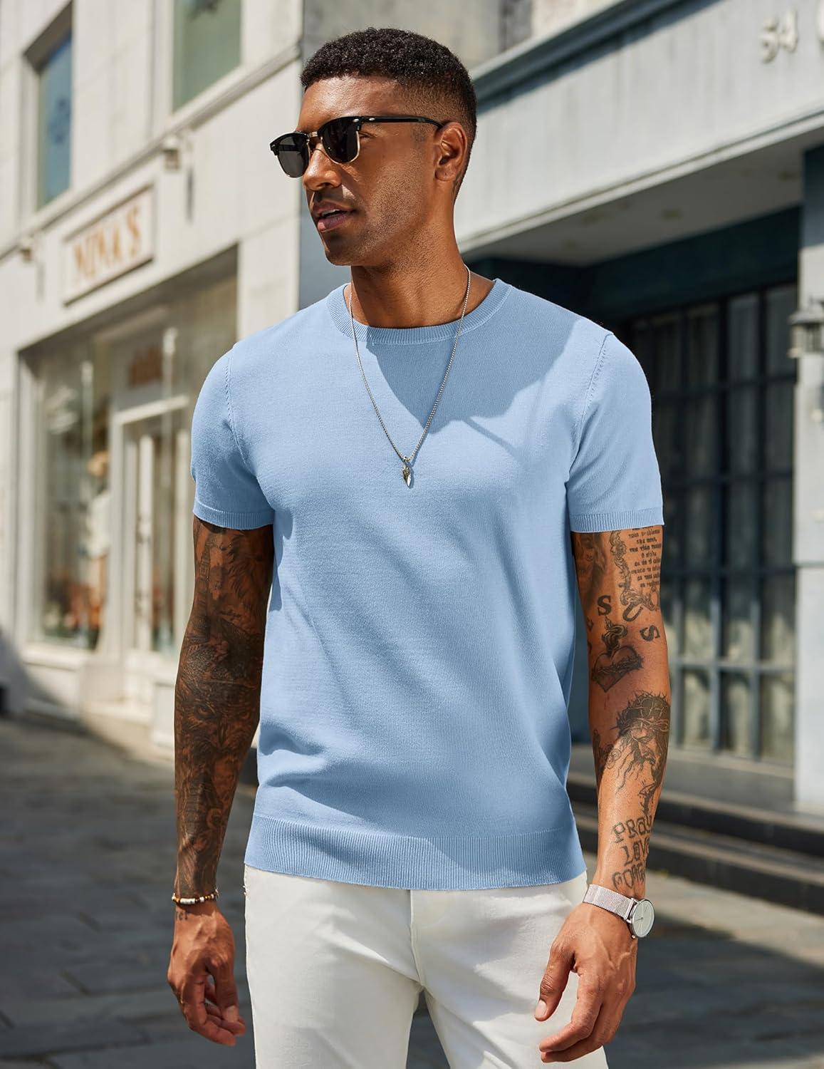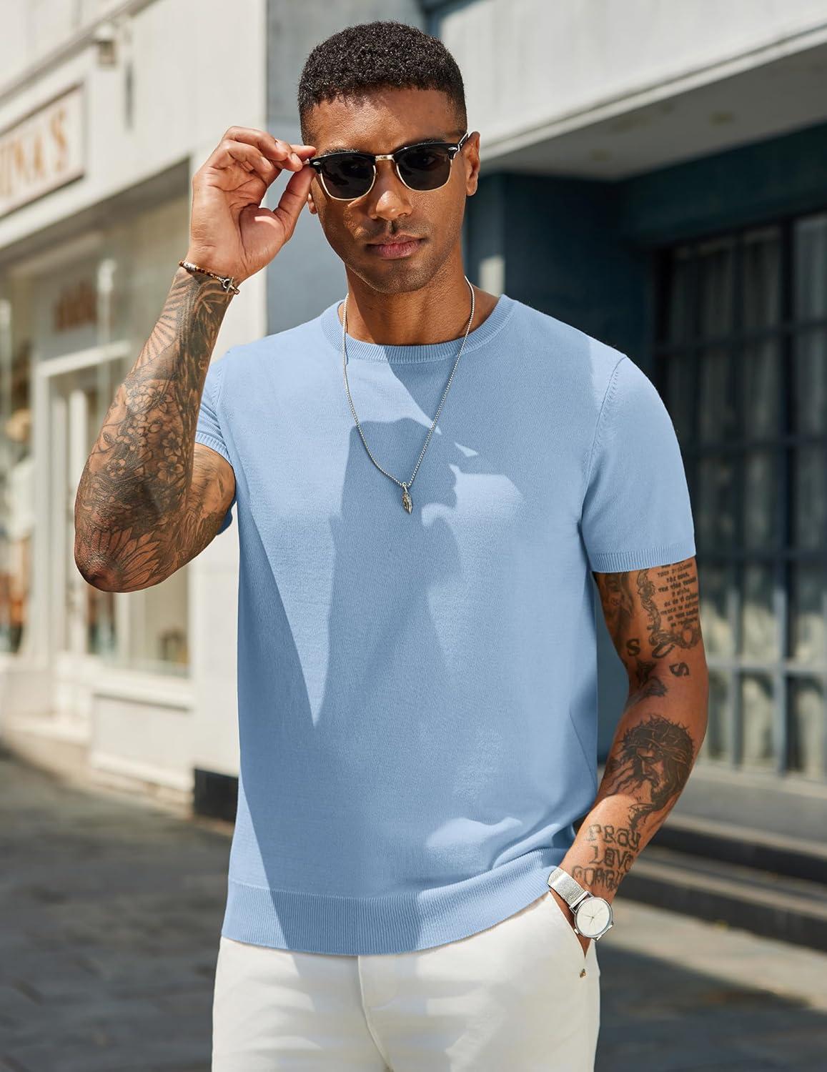 COOFANDY Men’s Crewneck Sweater Short Sleeve Casual Basic Tops Classic Fashion Knit Pullover Tees(Light Blue)