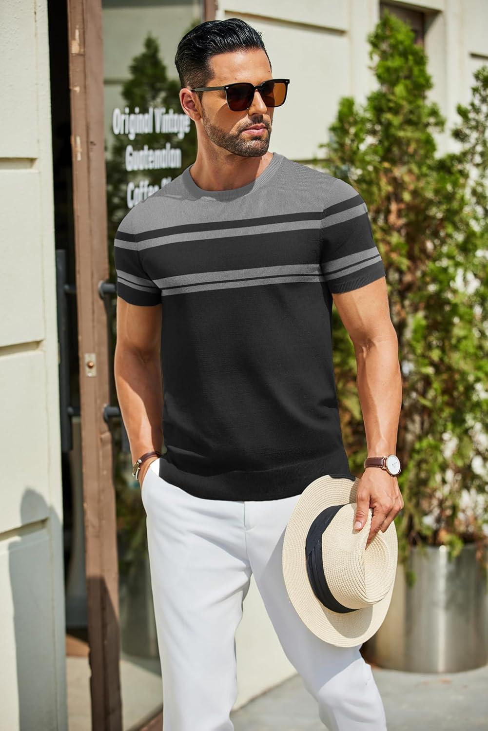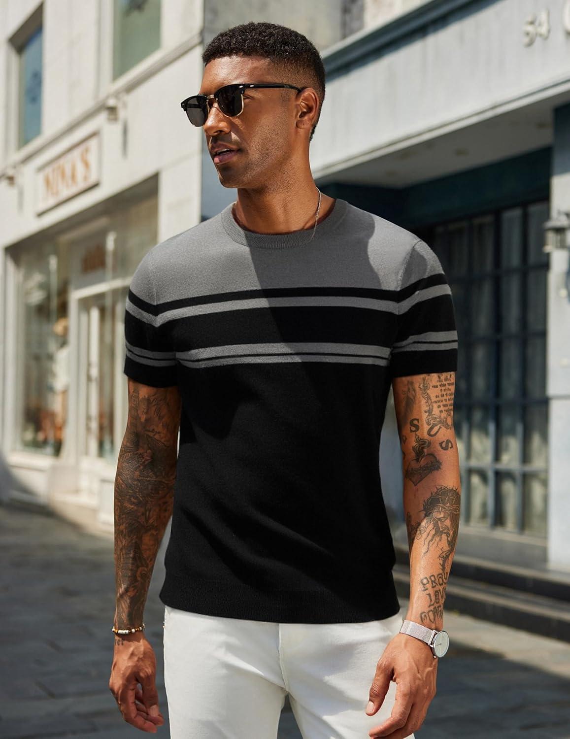 COOFANDY Men’s Crewneck Sweater Short Sleeve Casual Basic Tops Classic Fashion Knit Pullover Tees(Stripe – Black & Grey)