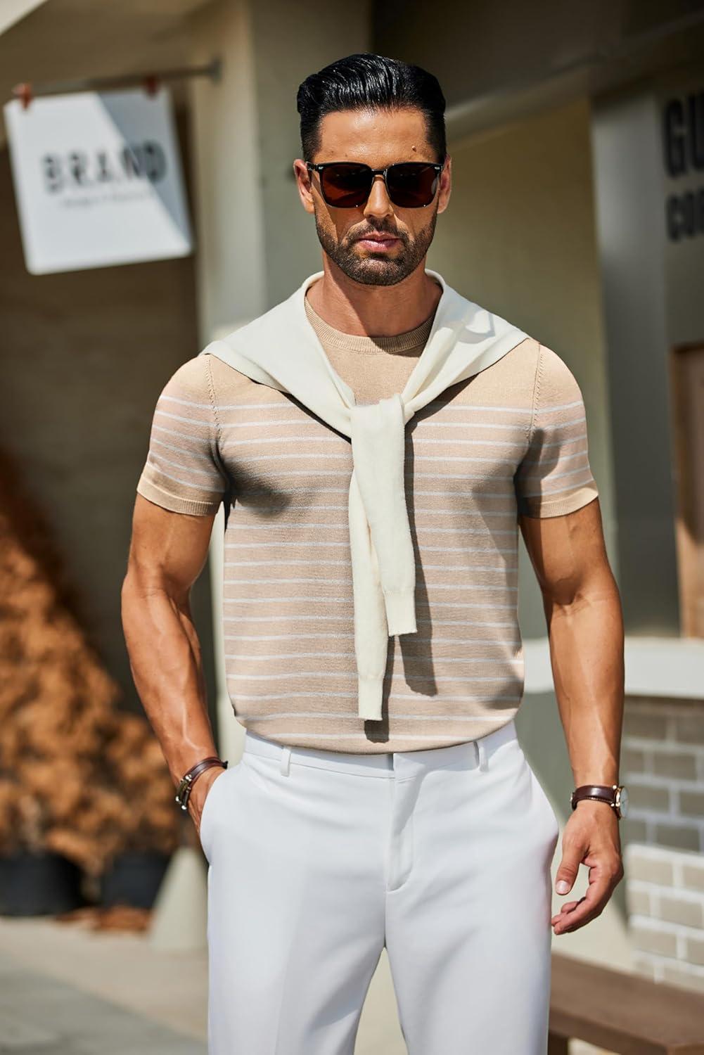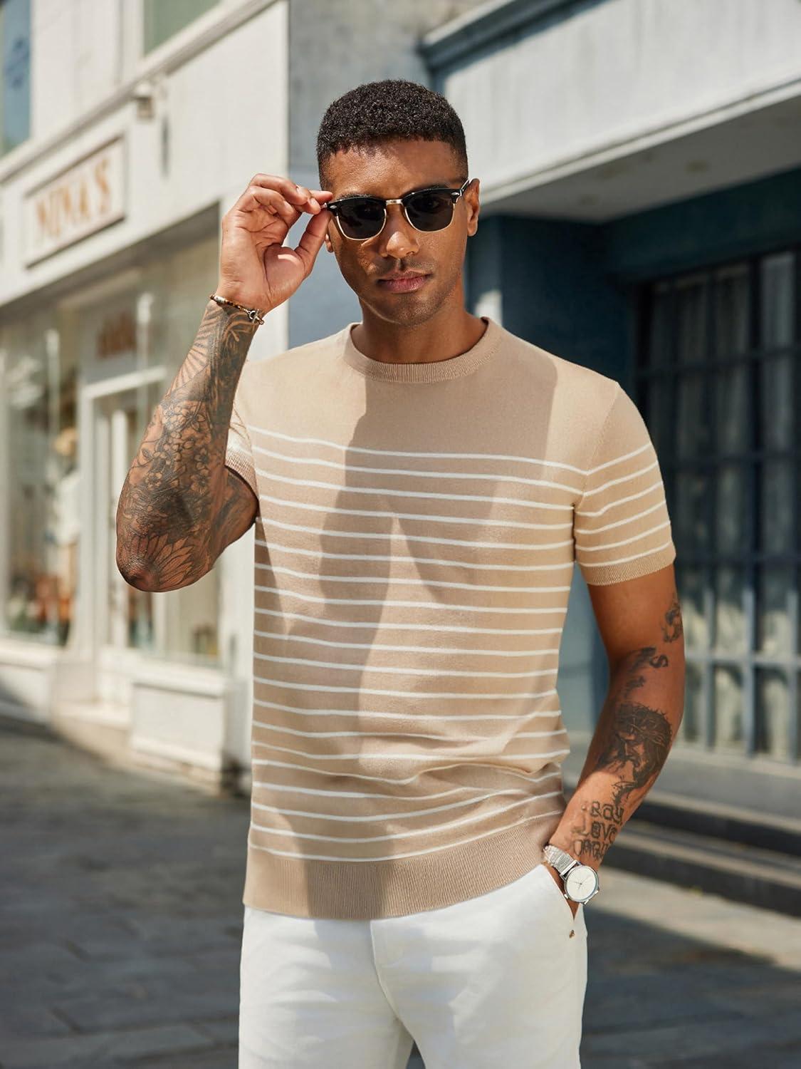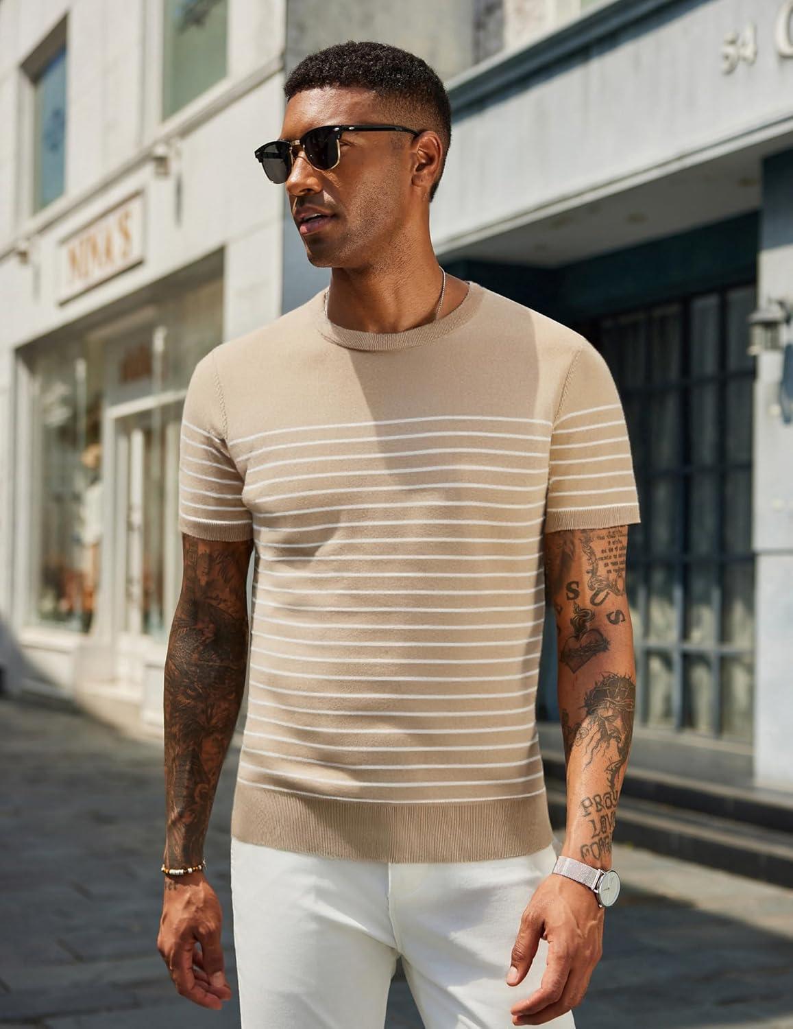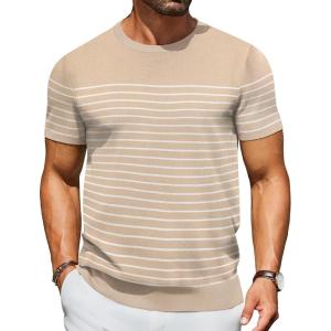 COOFANDY Men’s Crewneck Sweater Short Sleeve Casual Basic Tops Classic Fashion Knit Pullover Tees(Stripe – Khaki)