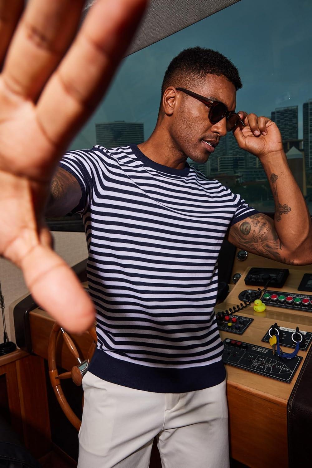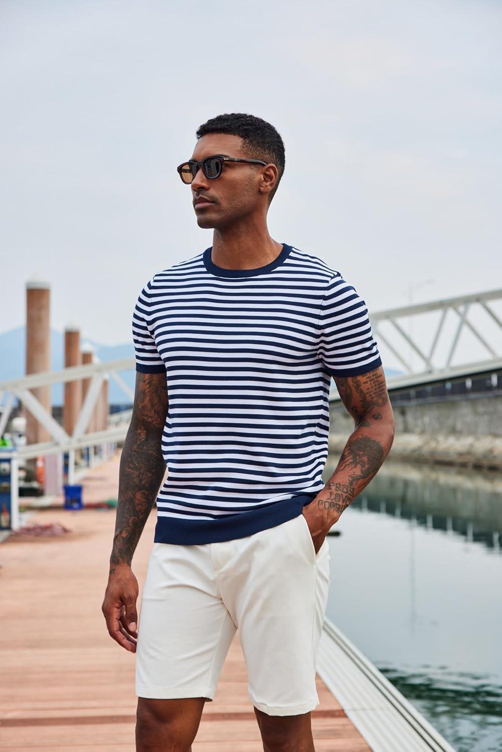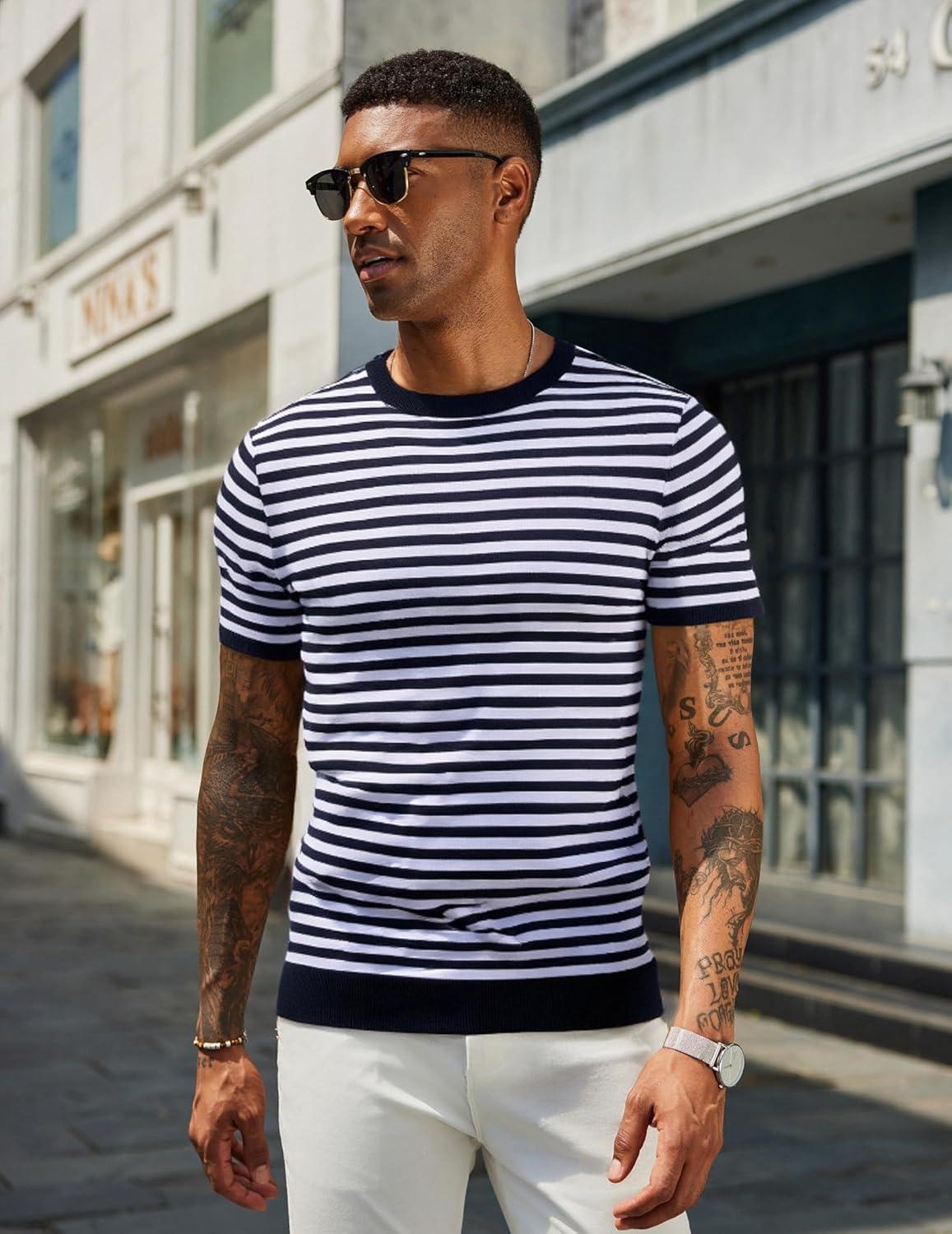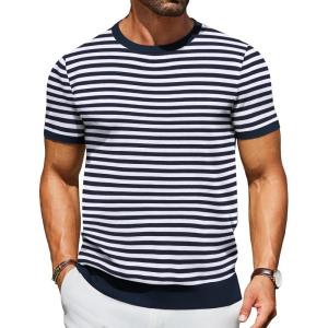 COOFANDY Men’s Crewneck Sweater Short Sleeve Casual Basic Tops Classic Fashion Knit Pullover Tees(Stripe – Navy)