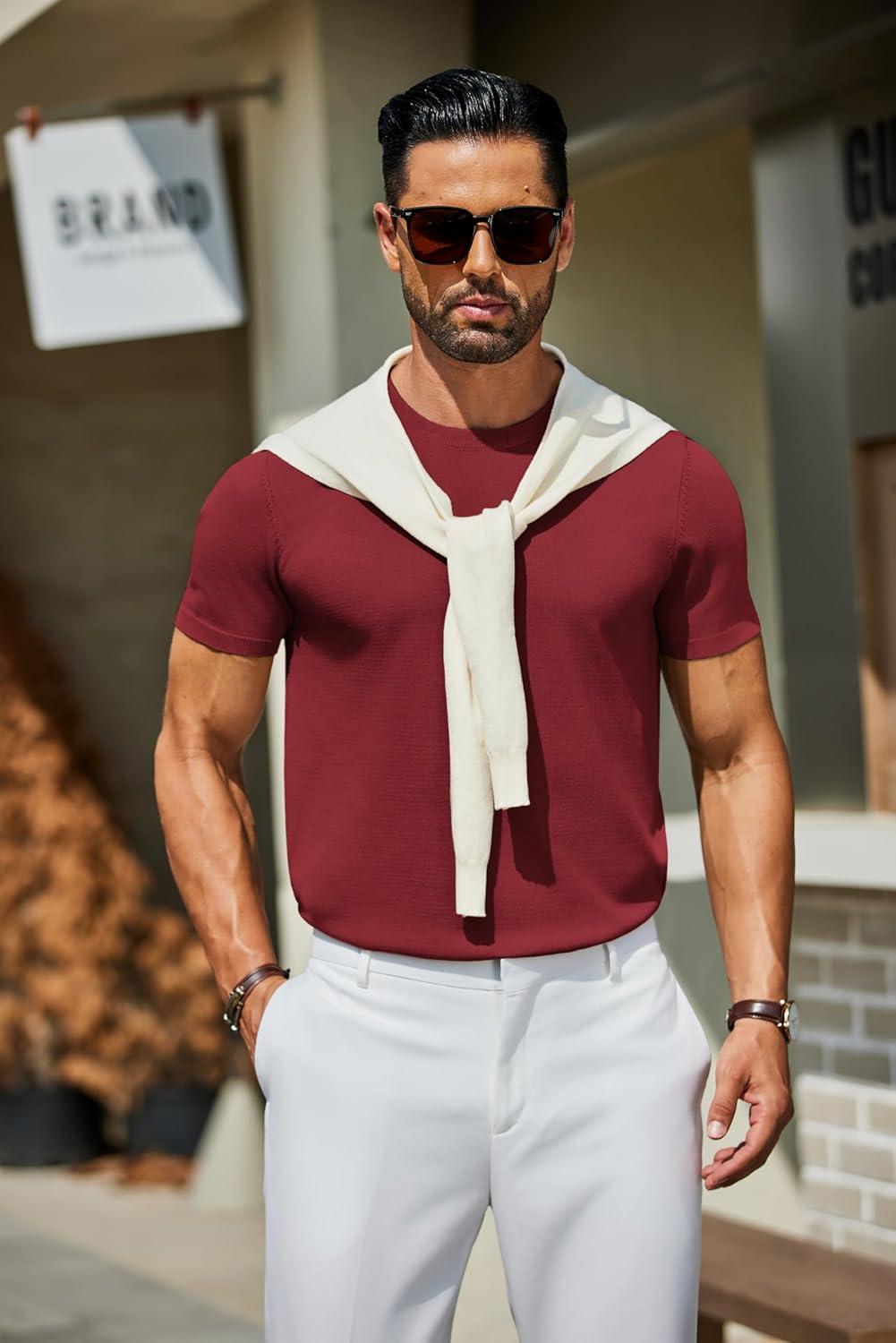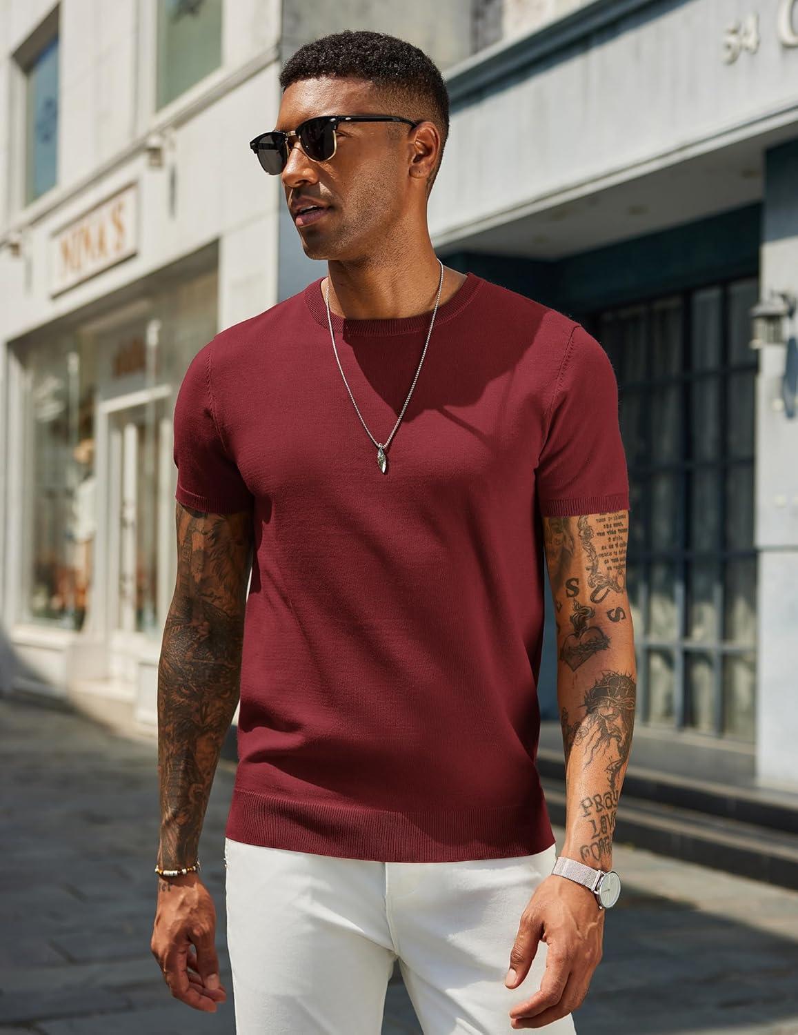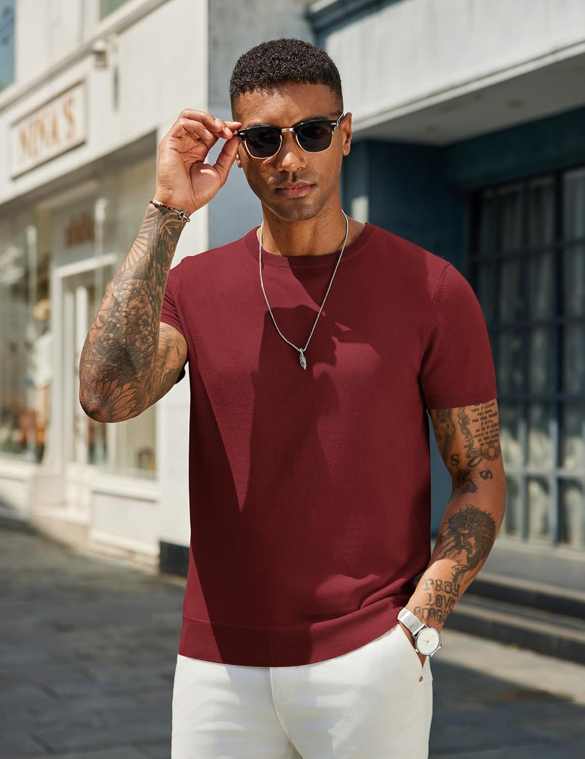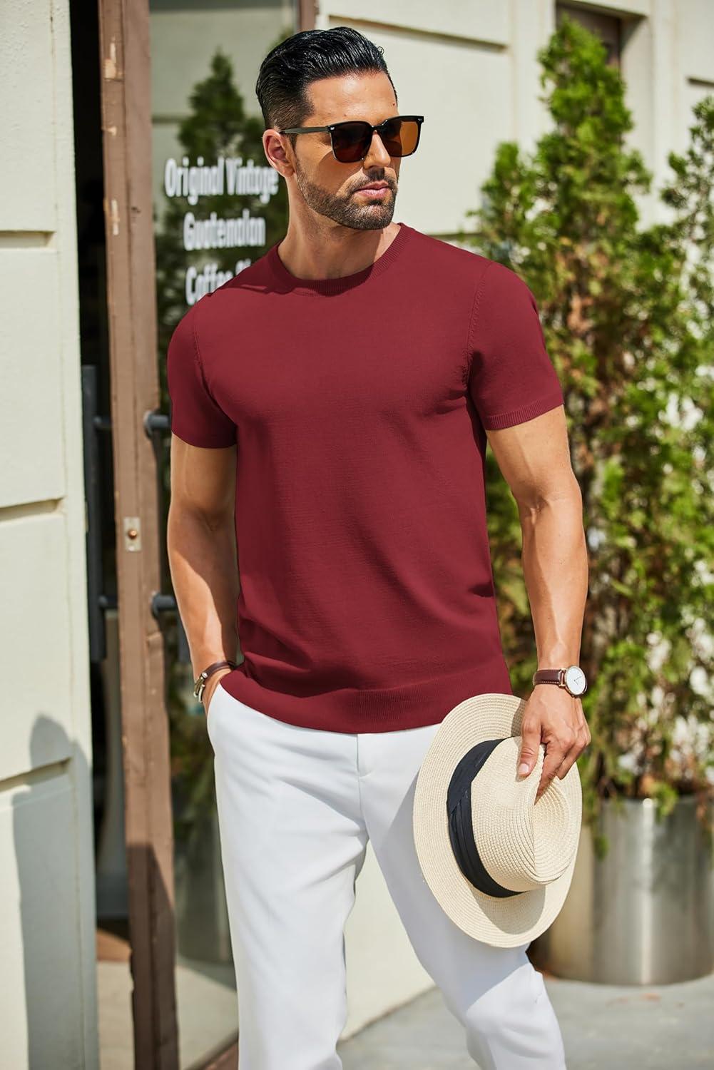 COOFANDY Men’s Crewneck Sweater Short Sleeve Casual Basic Tops Classic Fashion Knit Pullover Tees(Wine Red)
