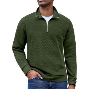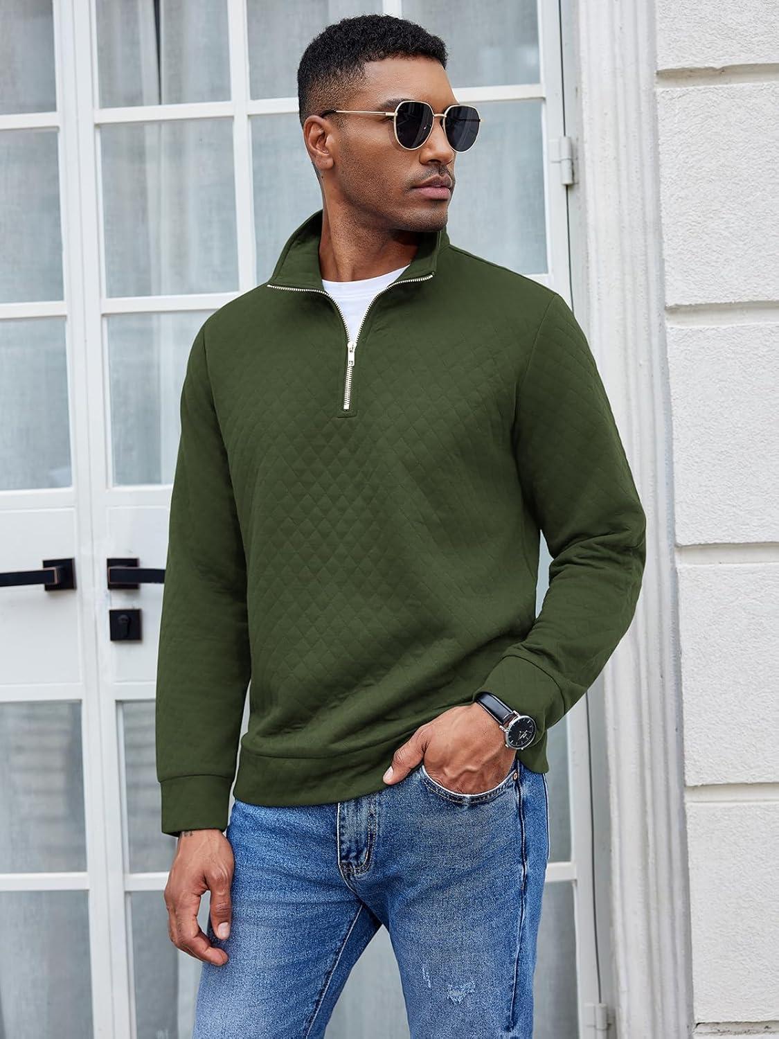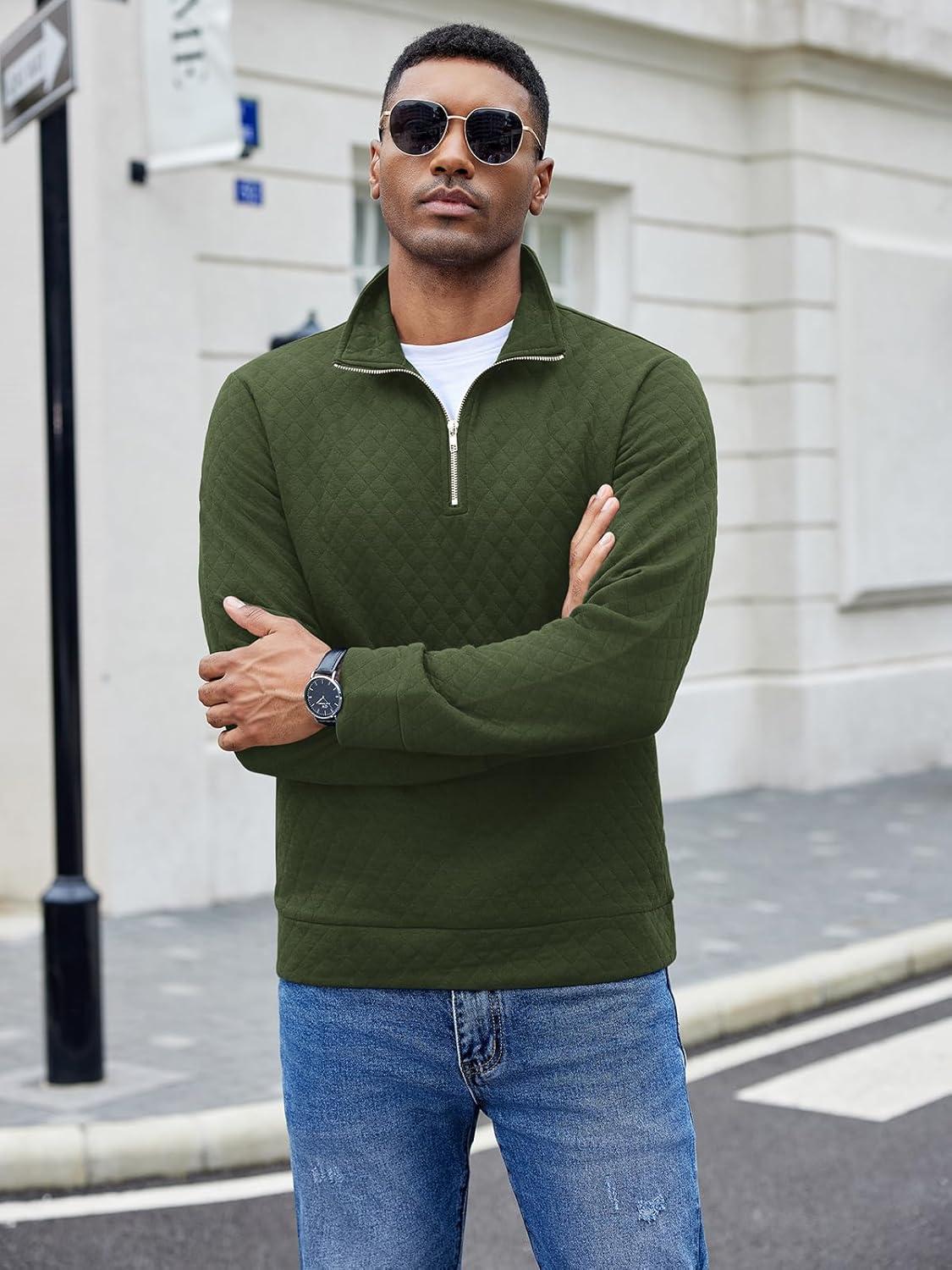 COOFANDY Men’s Fashion Quarter Zip Pullover Long Sleeve Quilted Sweatshirt Plaid Jacquard Polo Mock Neck Sweaters(Army Green)