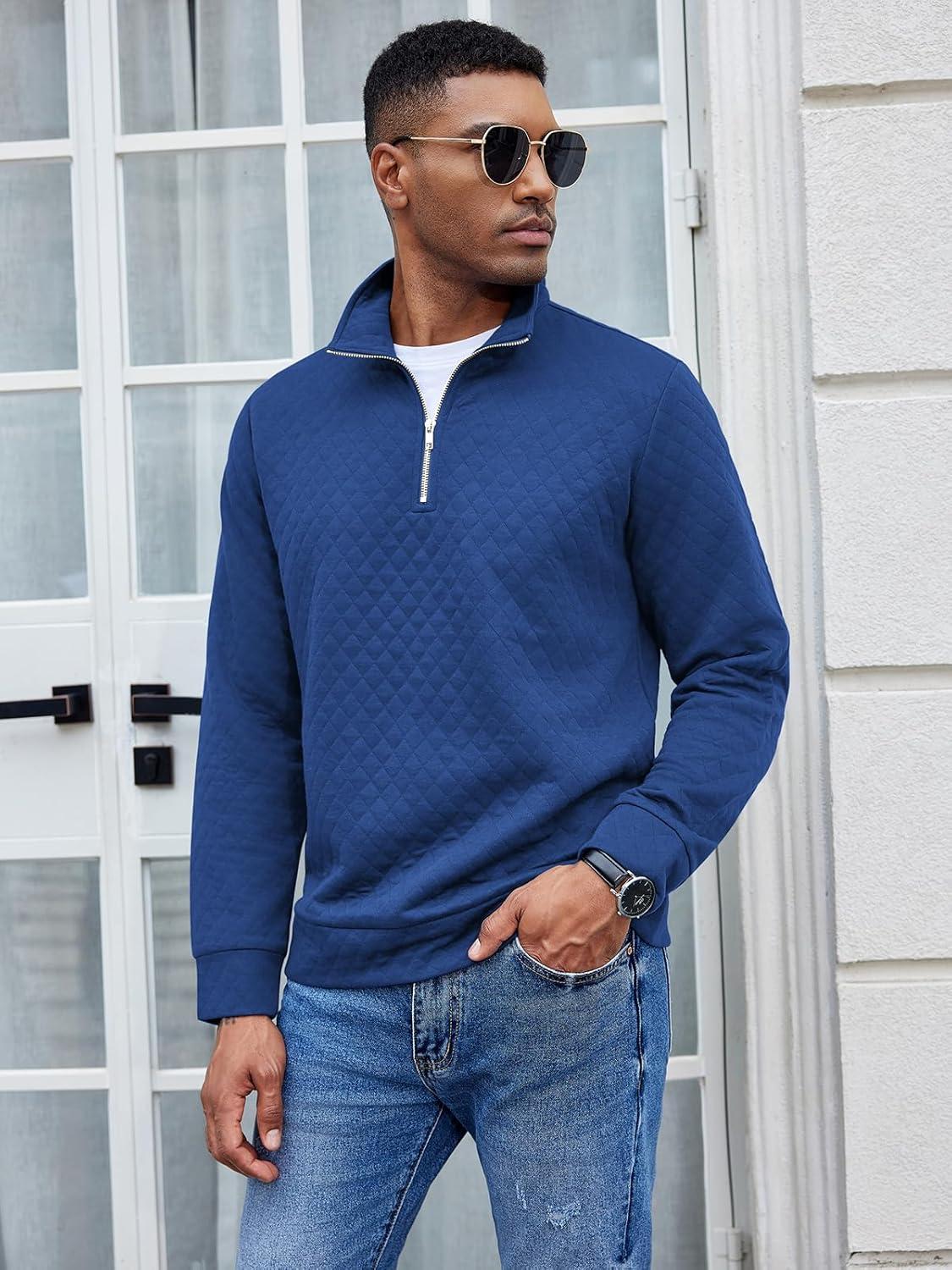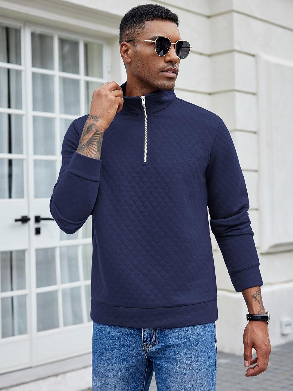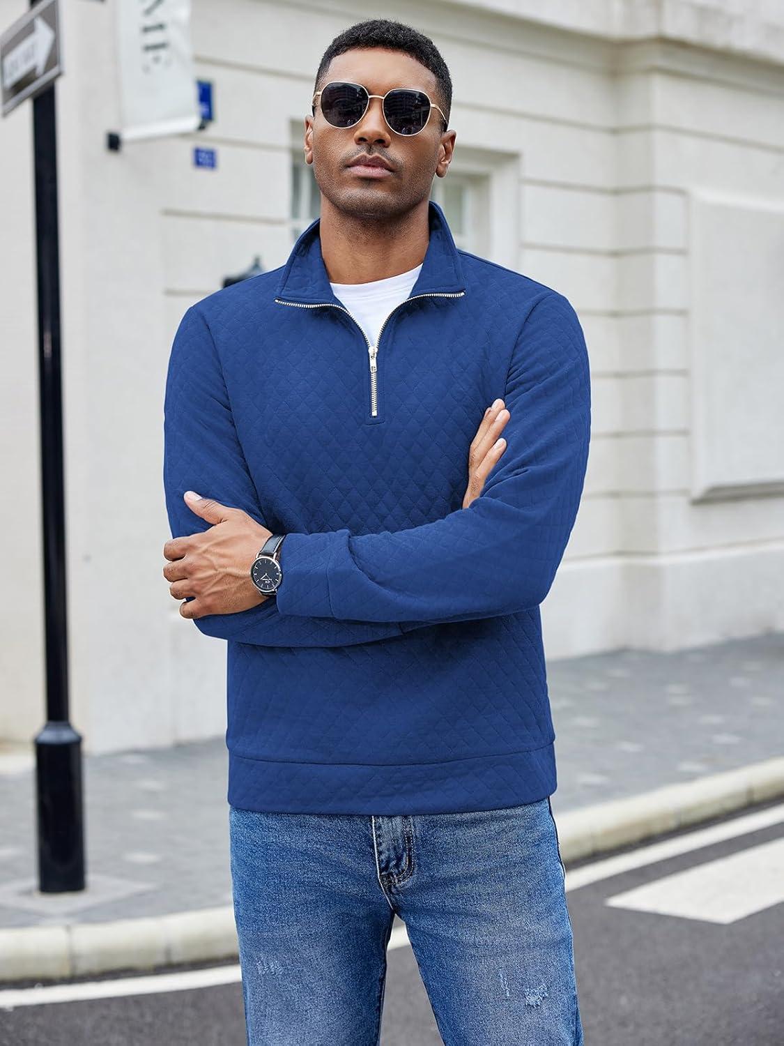 COOFANDY Men’s Fashion Quarter Zip Pullover Long Sleeve Quilted Sweatshirt Plaid Jacquard Polo Mock Neck Sweaters(Dark Blue)