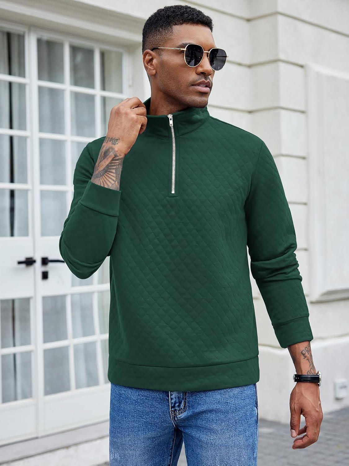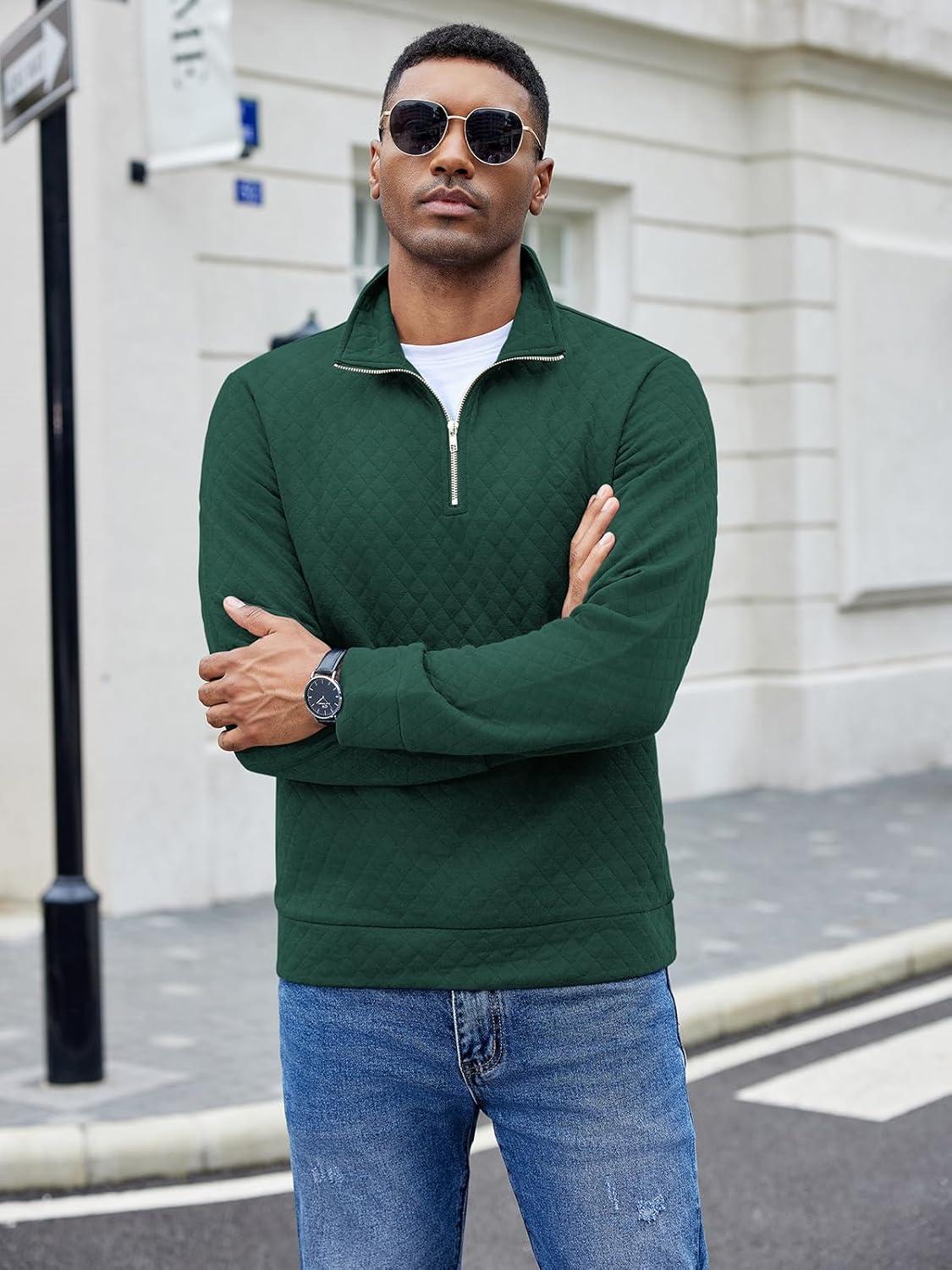 COOFANDY Men’s Fashion Quarter Zip Pullover Long Sleeve Quilted Sweatshirt Plaid Jacquard Polo Mock Neck Sweaters(Dark Green)