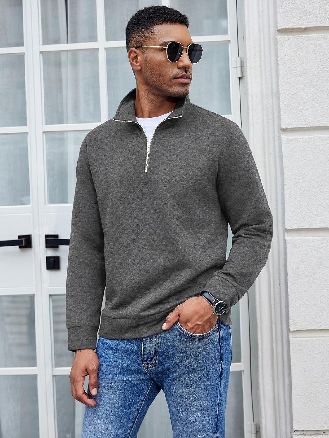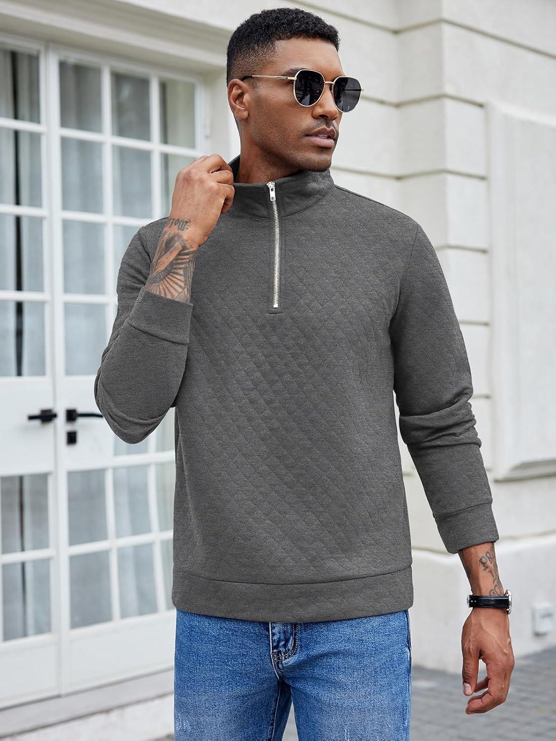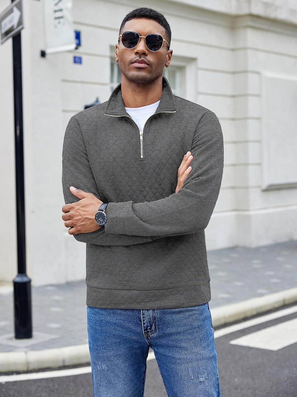 COOFANDY Men’s Fashion Quarter Zip Pullover Long Sleeve Quilted Sweatshirt Plaid Jacquard Polo Mock Neck Sweaters(Dark Grey)