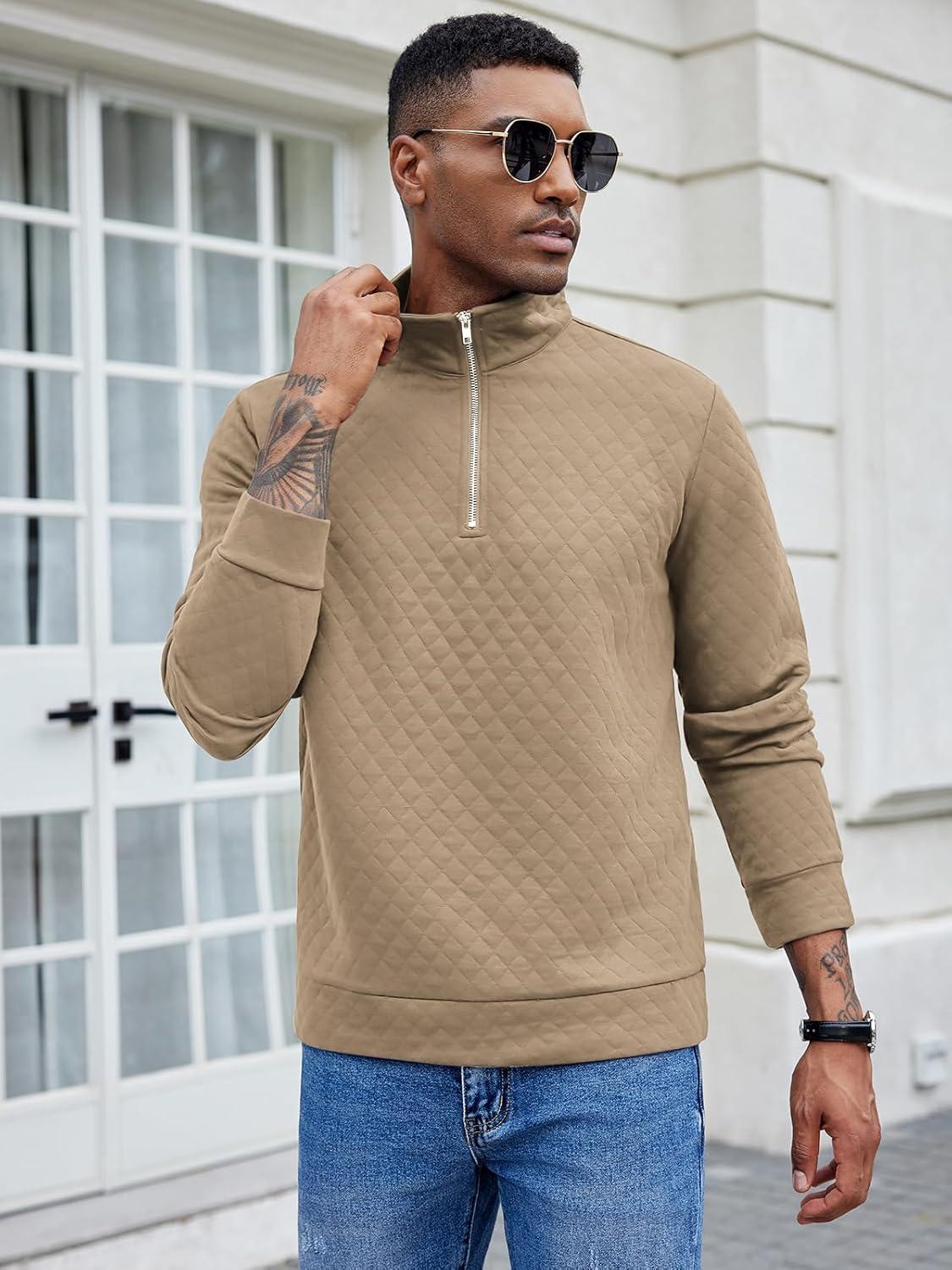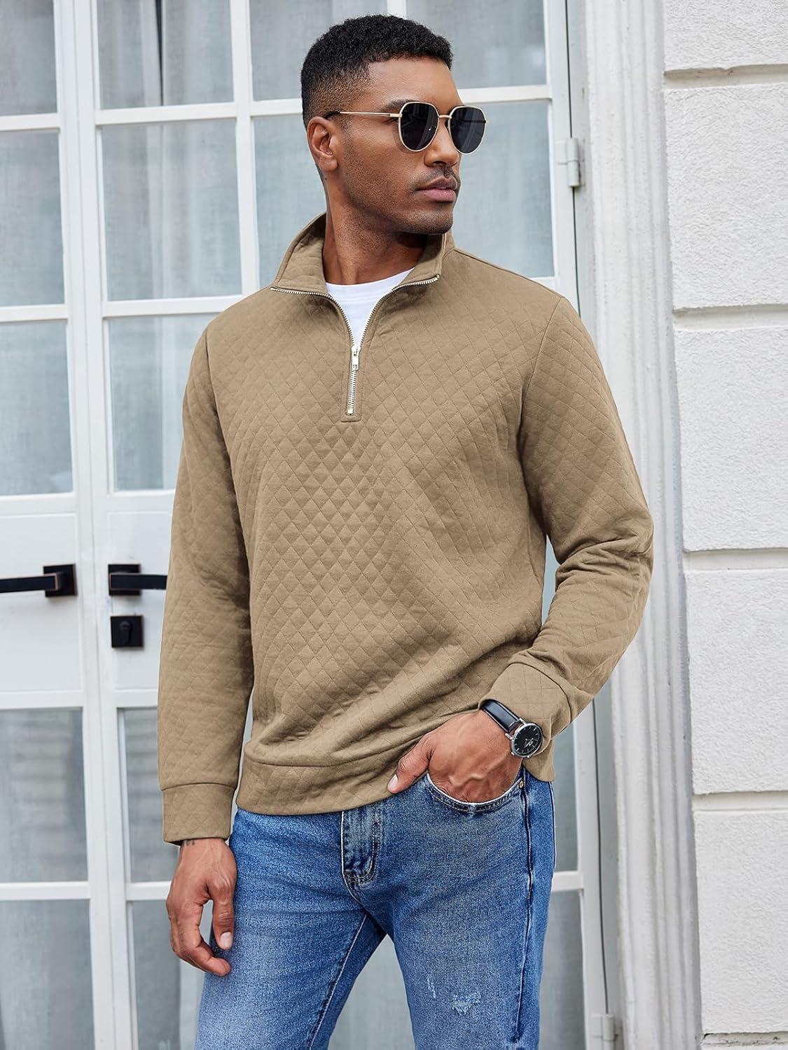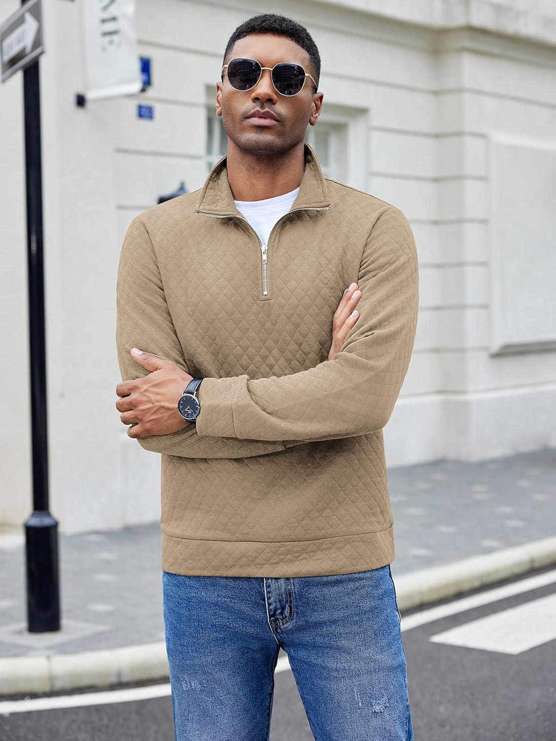 COOFANDY Men’s Fashion Quarter Zip Pullover Long Sleeve Quilted Sweatshirt Plaid Jacquard Polo Mock Neck Sweaters(Khaki)