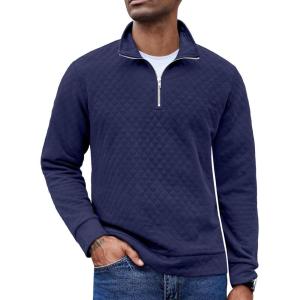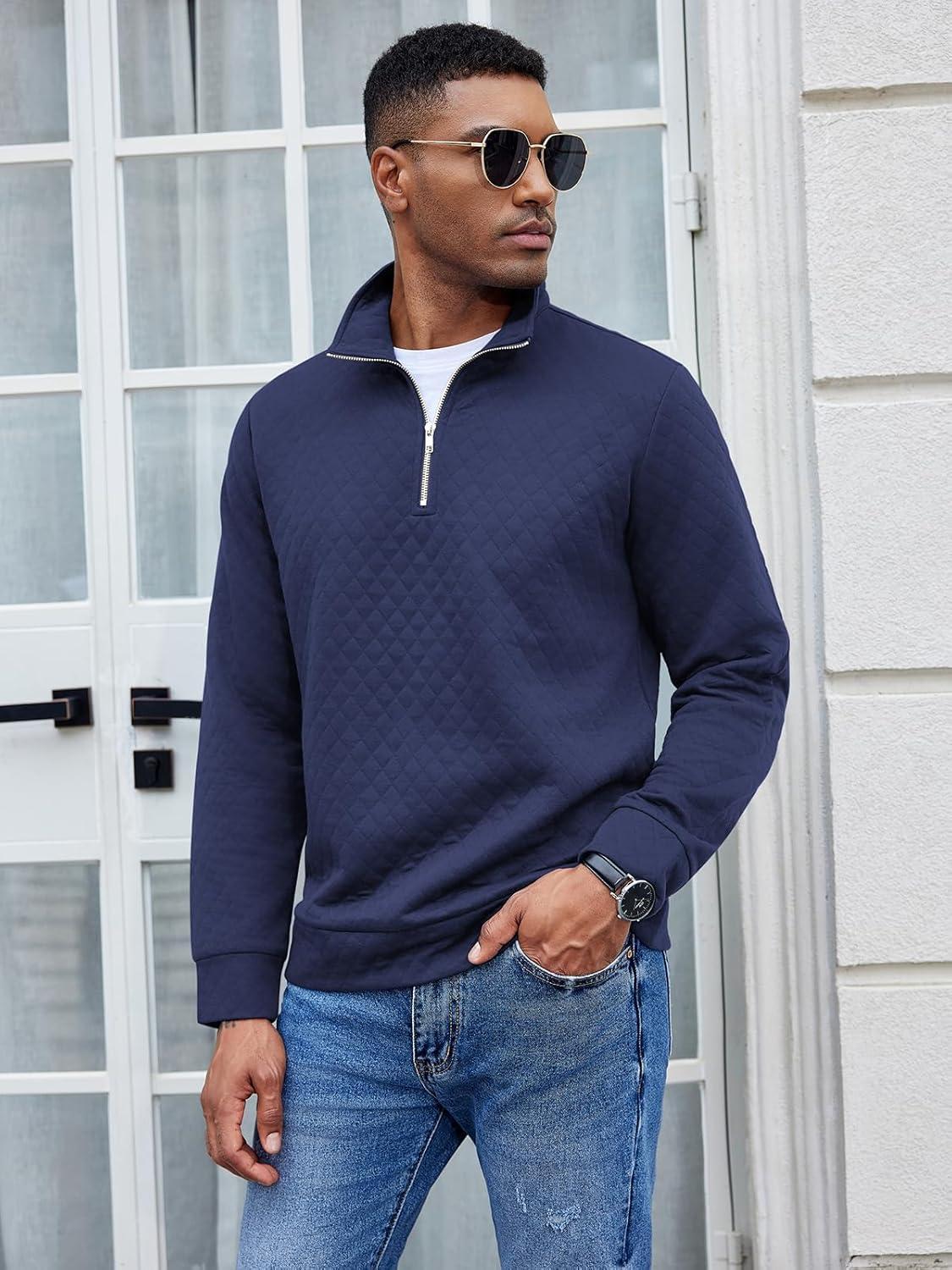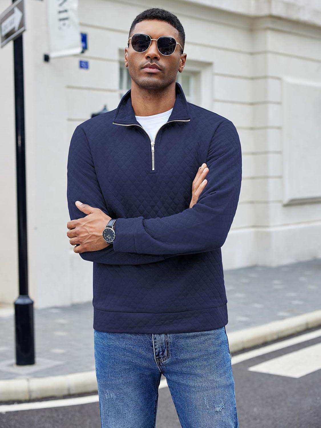 COOFANDY Men’s Fashion Quarter Zip Pullover Long Sleeve Quilted Sweatshirt Plaid Jacquard Polo Mock Neck Sweaters(Navy Blue)
