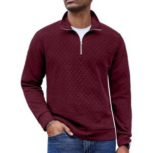 COOFANDY Men’s Fashion Quarter Zip Pullover Long Sleeve Quilted Sweatshirt Plaid Jacquard Polo Mock Neck Sweaters(Wine Red)