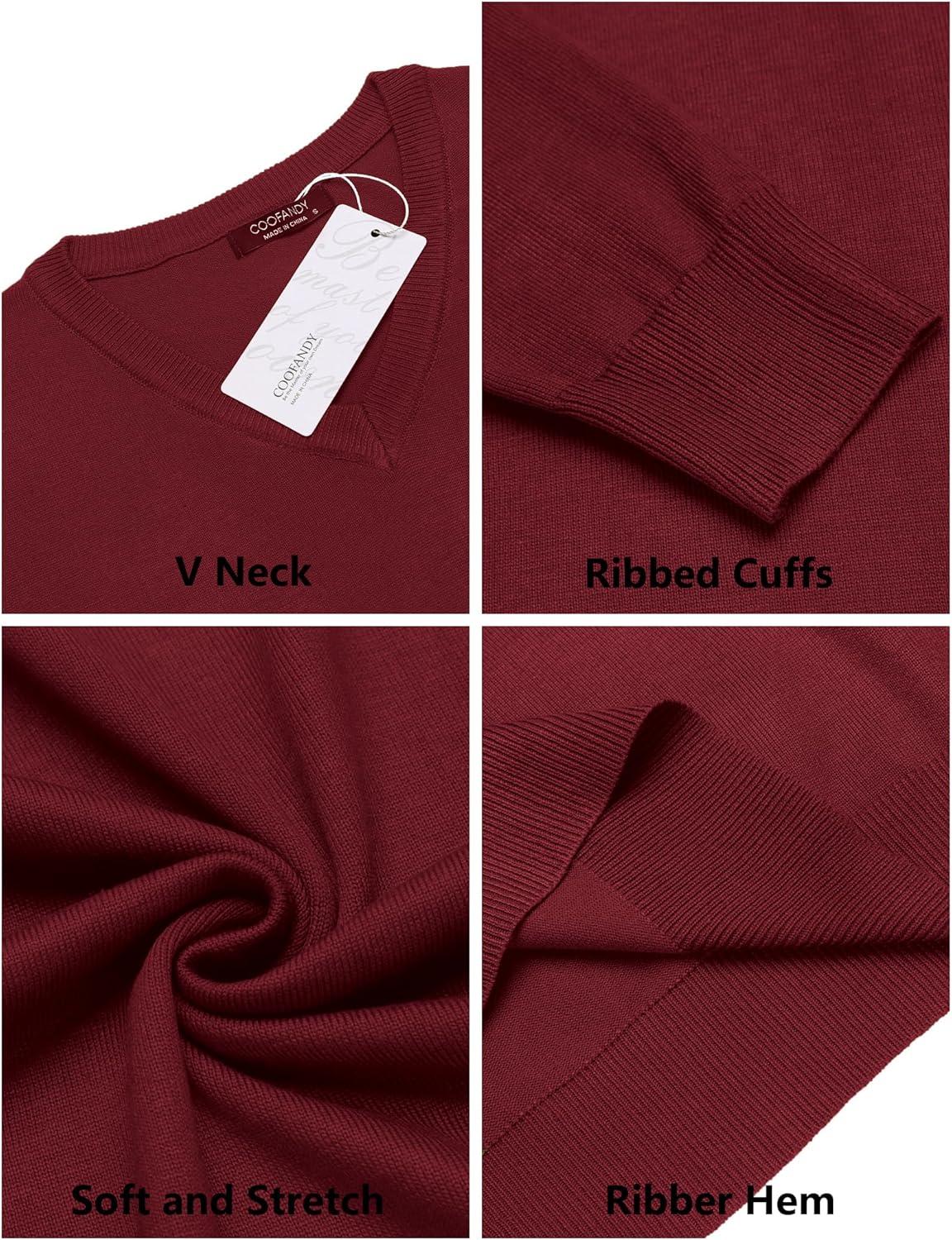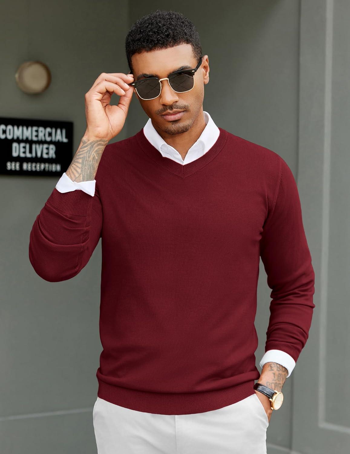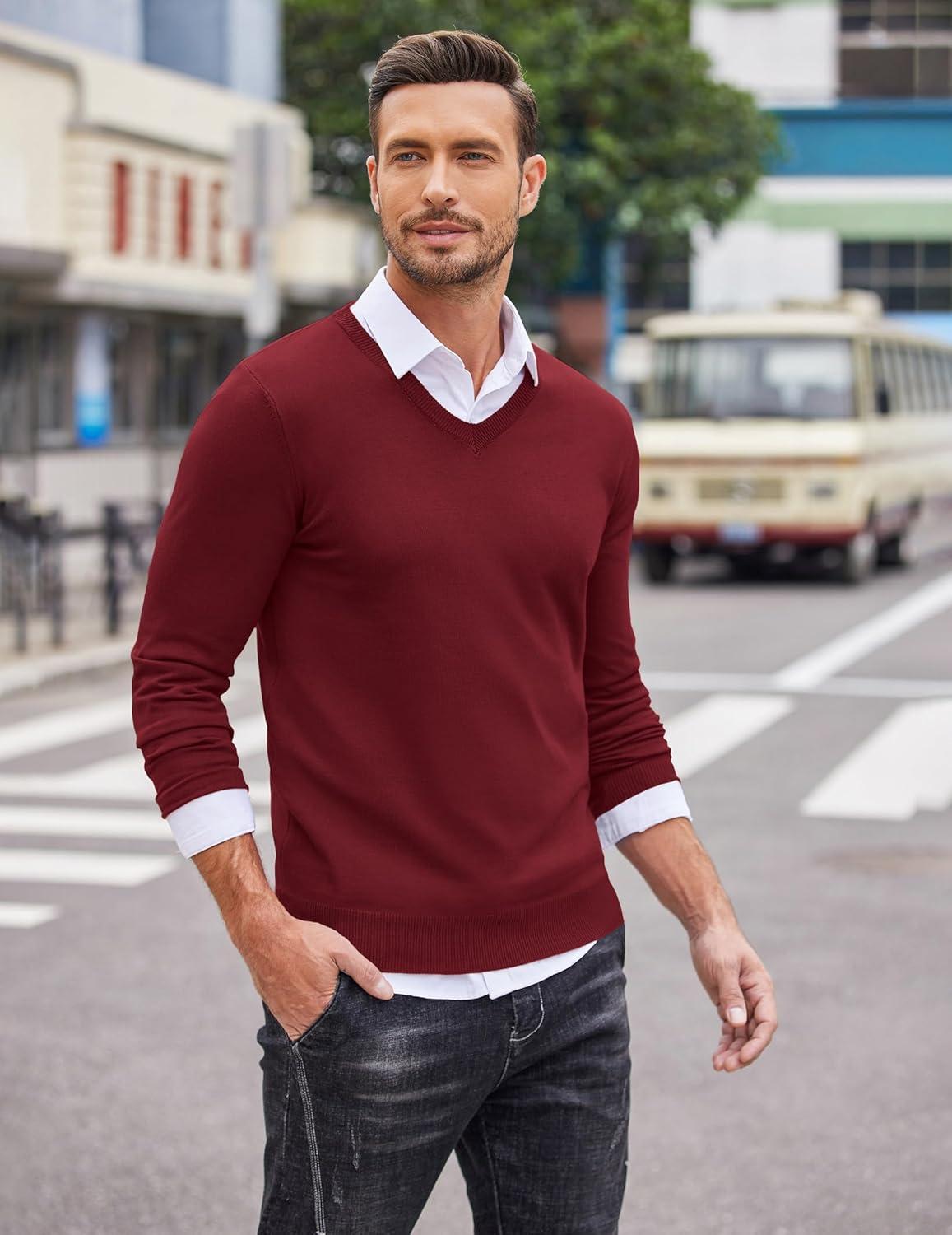 COOFANDY Men Casual V Neck Sweater Ribbed Knit Slim Fit Long Sleeve Pullover Top(Wine Red)