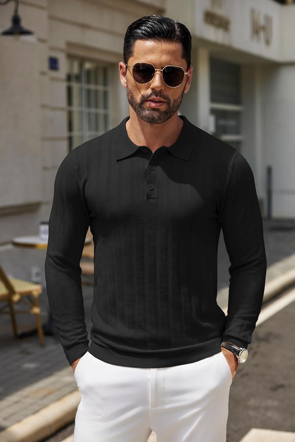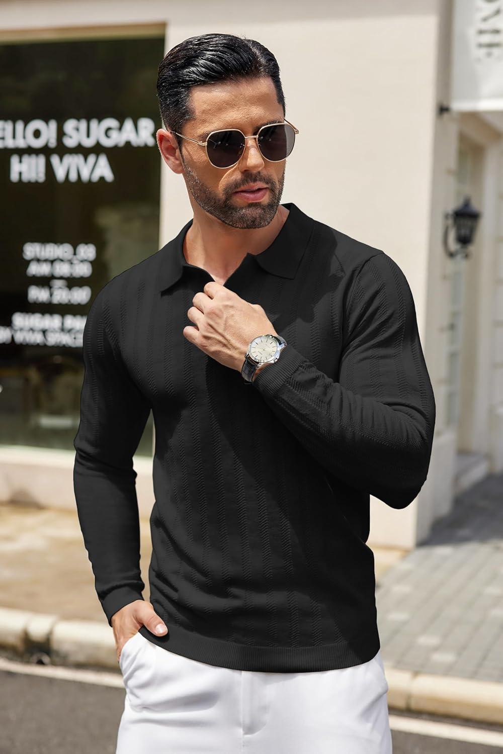 COOFANDY Long Sleeve Polo Shirts for Men Knit Polo Sweater Lightweight Ribbed Pullover Sweater(Black)