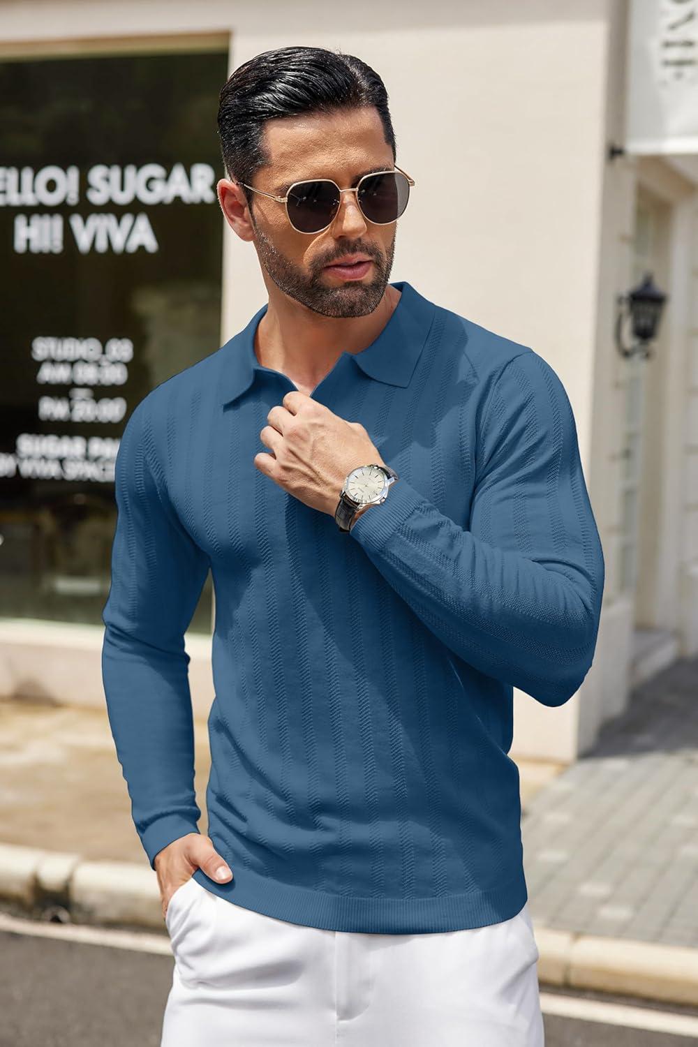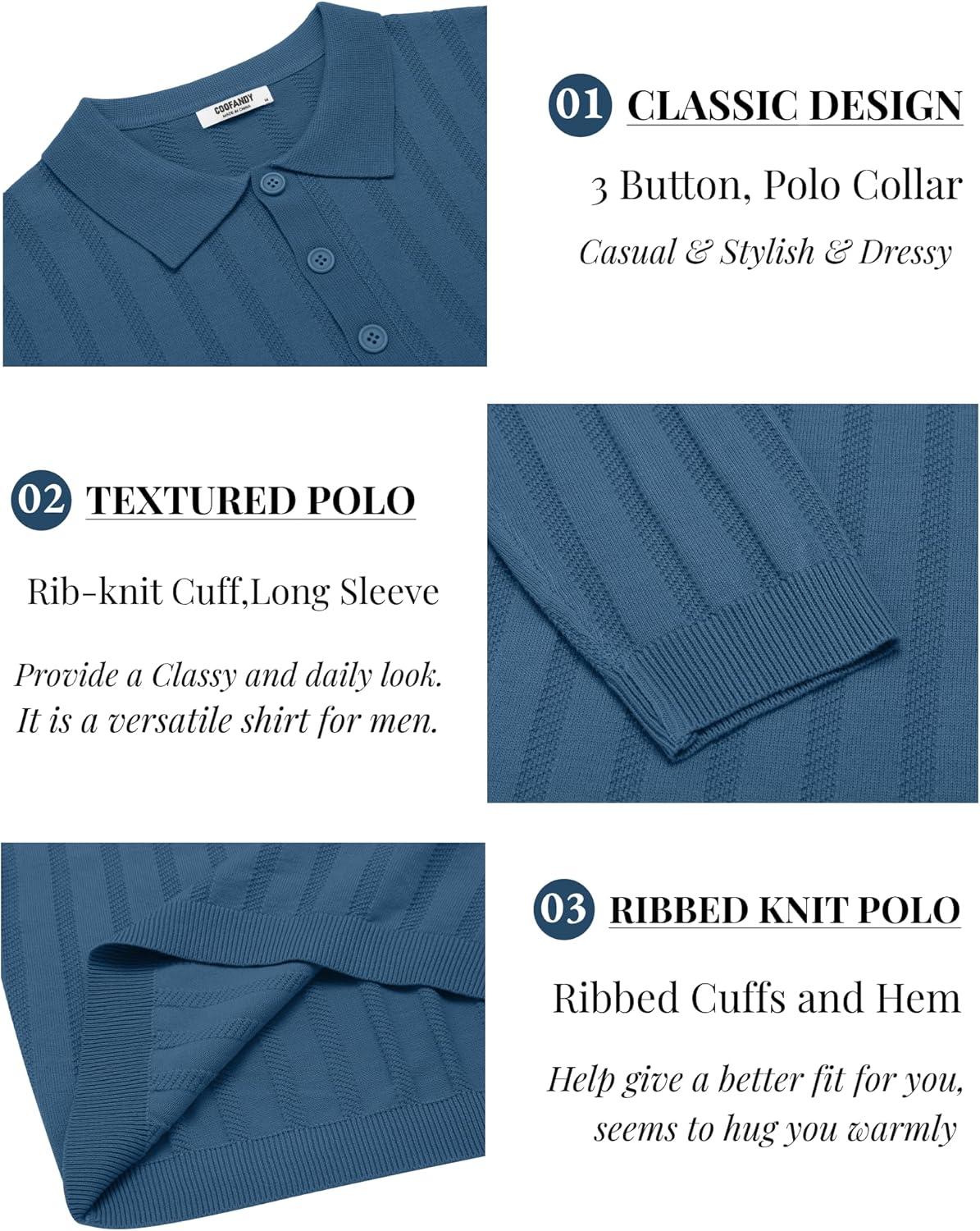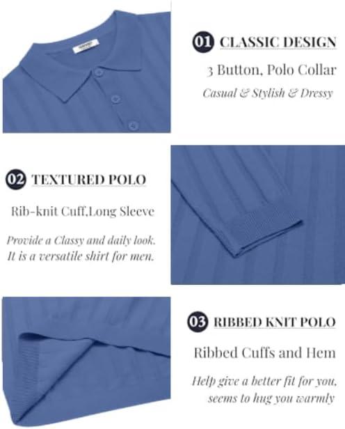 COOFANDY Men Knit Long Sleeve Polo Shirts Casual Dress Collared Sweater Pullover Button Down Golf Polo Shirts(Blue)