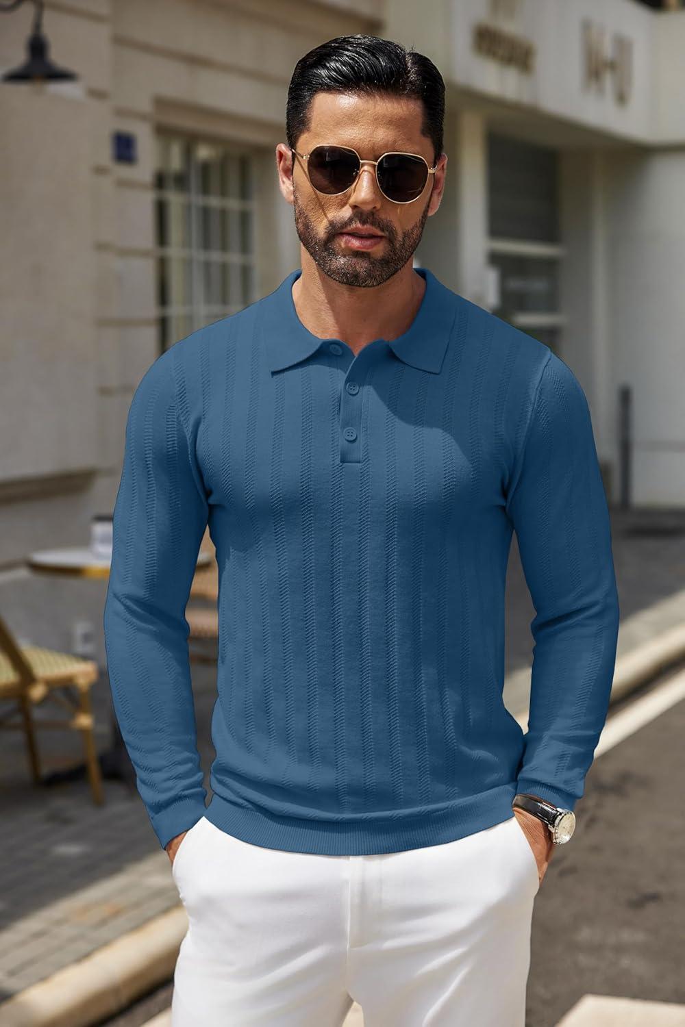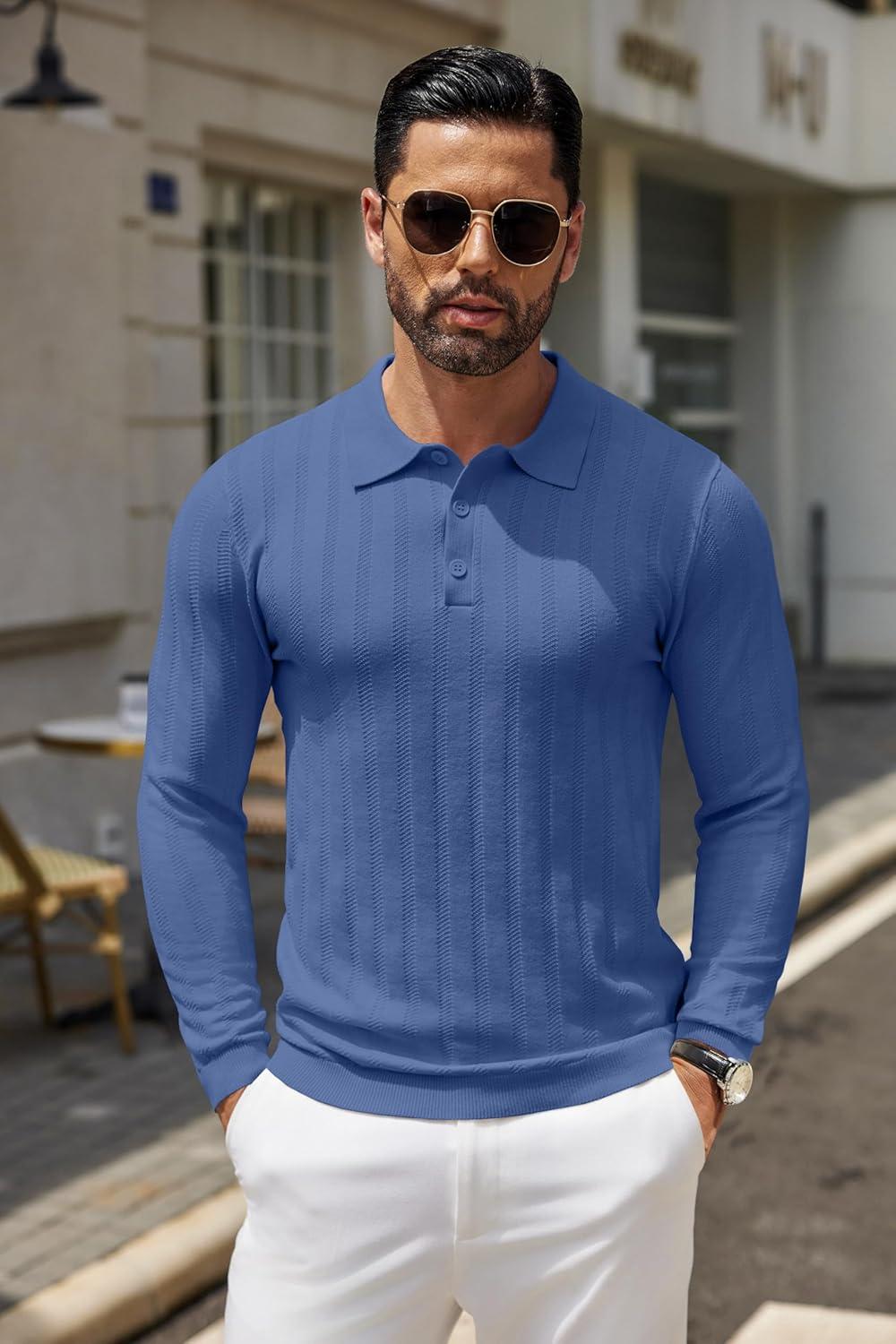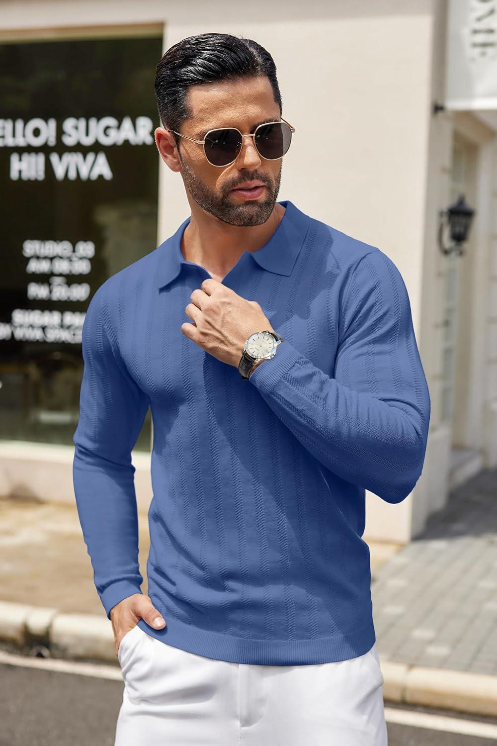 COOFANDY Men Knit Long Sleeve Polo Shirts Casual Dress Collared Sweater Pullover Button Down Golf Polo Shirts(Blue)