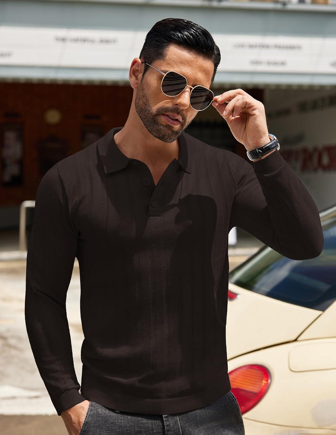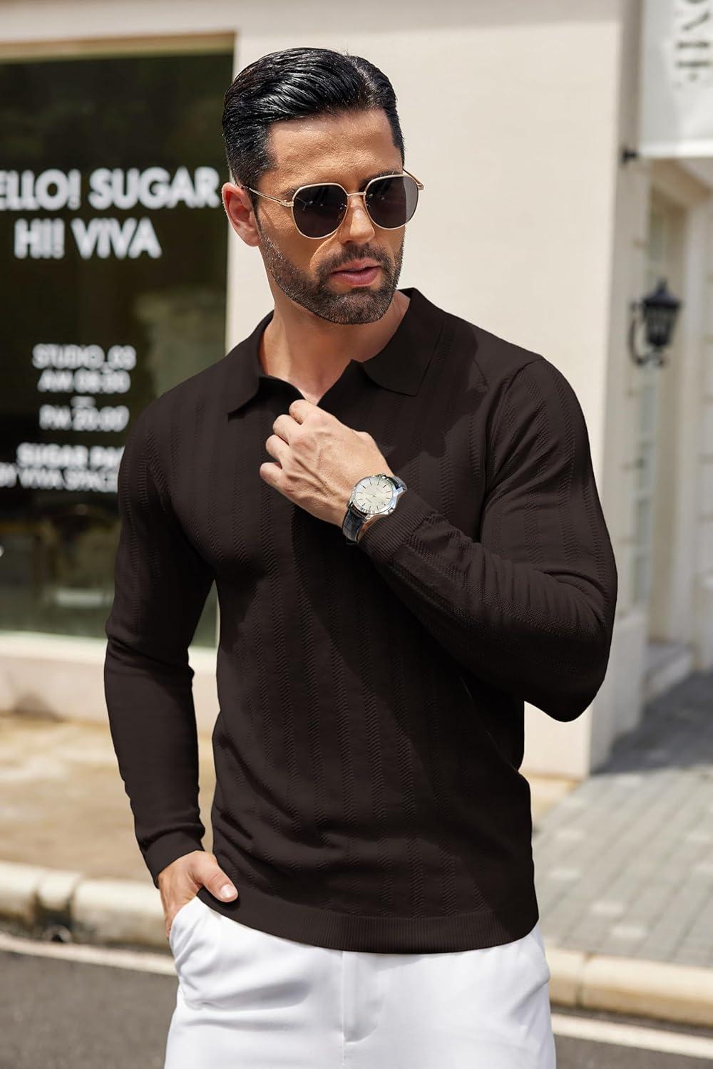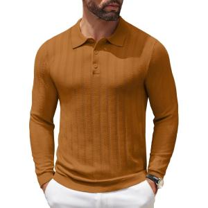 COOFANDY Long Sleeve Polo Shirts for Men Knit Polo Sweater Lightweight Ribbed Pullover Sweater(Brown)