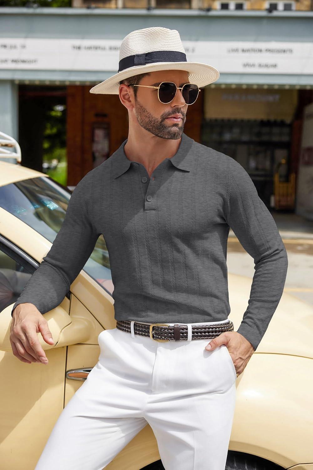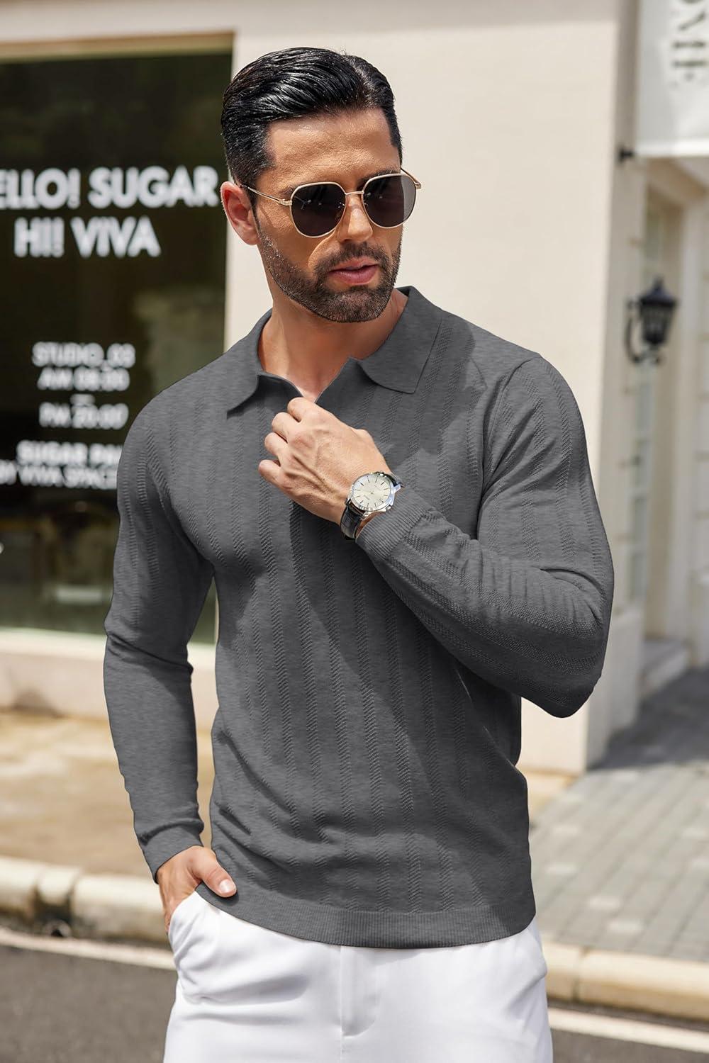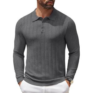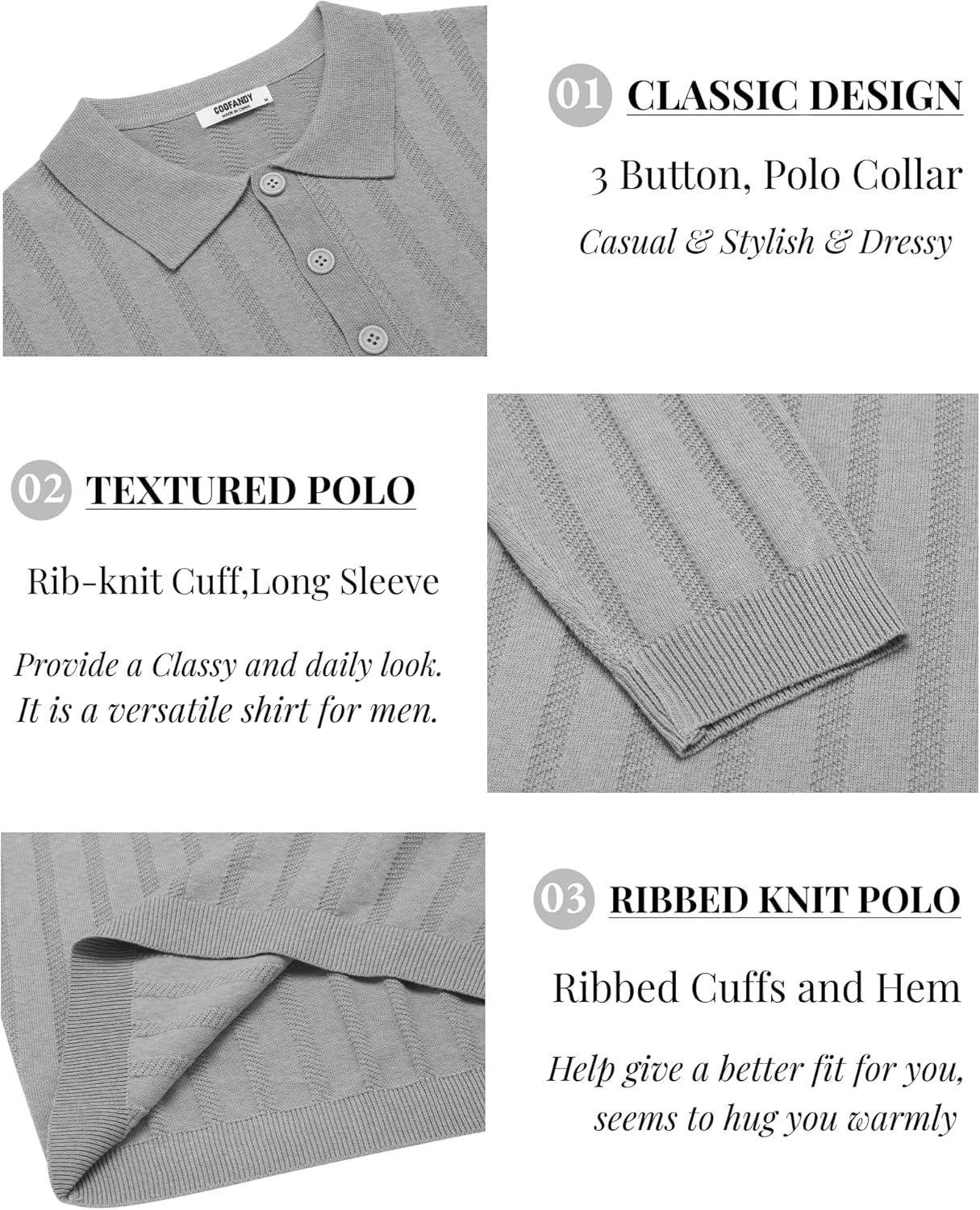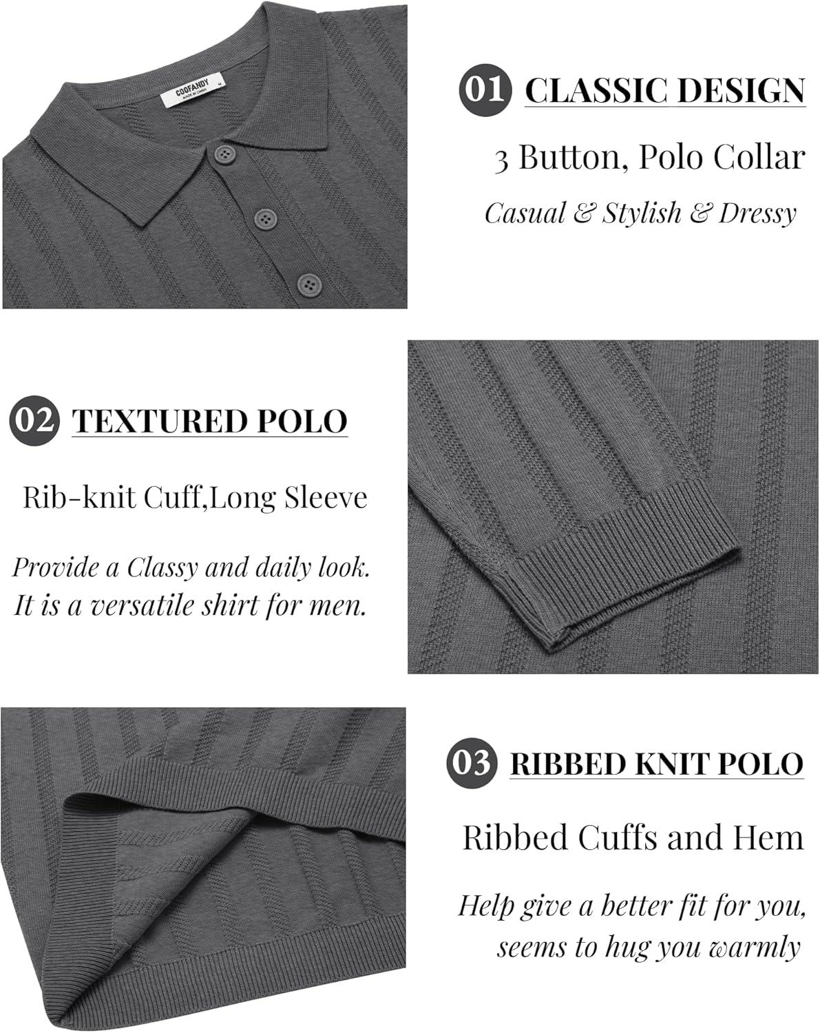 COOFANDY Long Sleeve Polo Shirts for Men Knit Polo Sweater Lightweight Ribbed Pullover Sweater(Dark Gray)