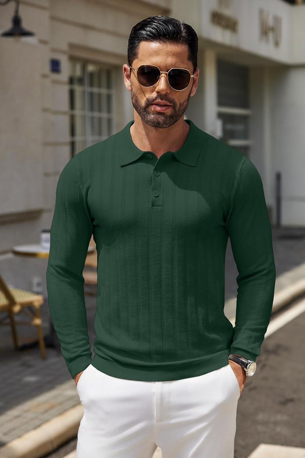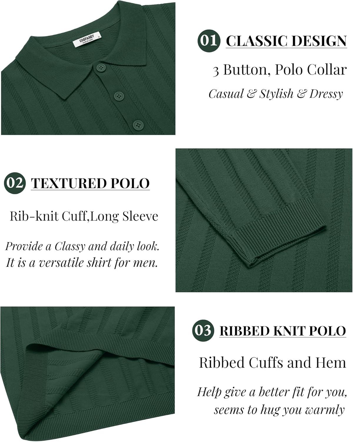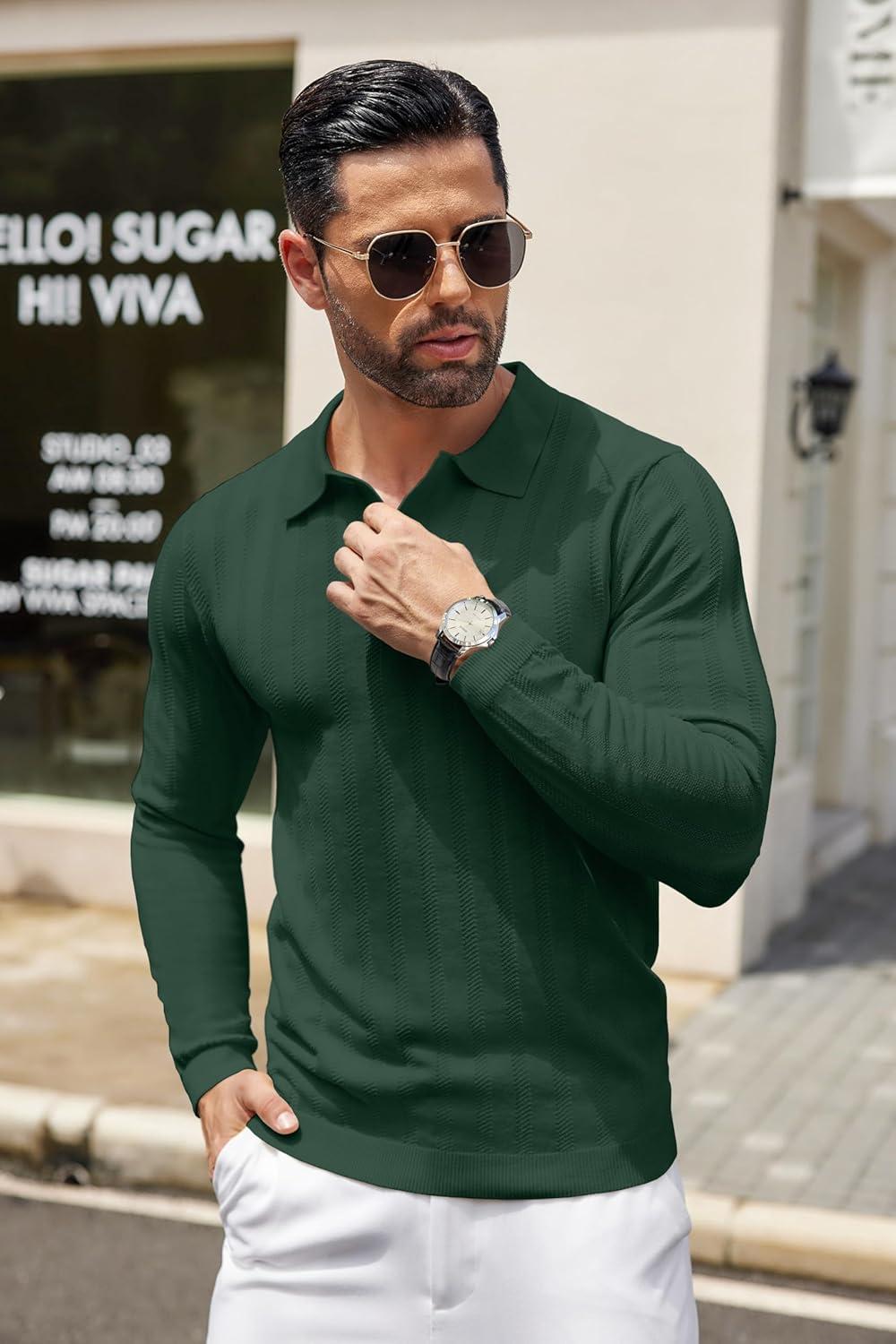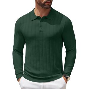 COOFANDY Long Sleeve Polo Shirts for Men Knit Polo Sweater Lightweight Ribbed Pullover Sweater(Dark Green)