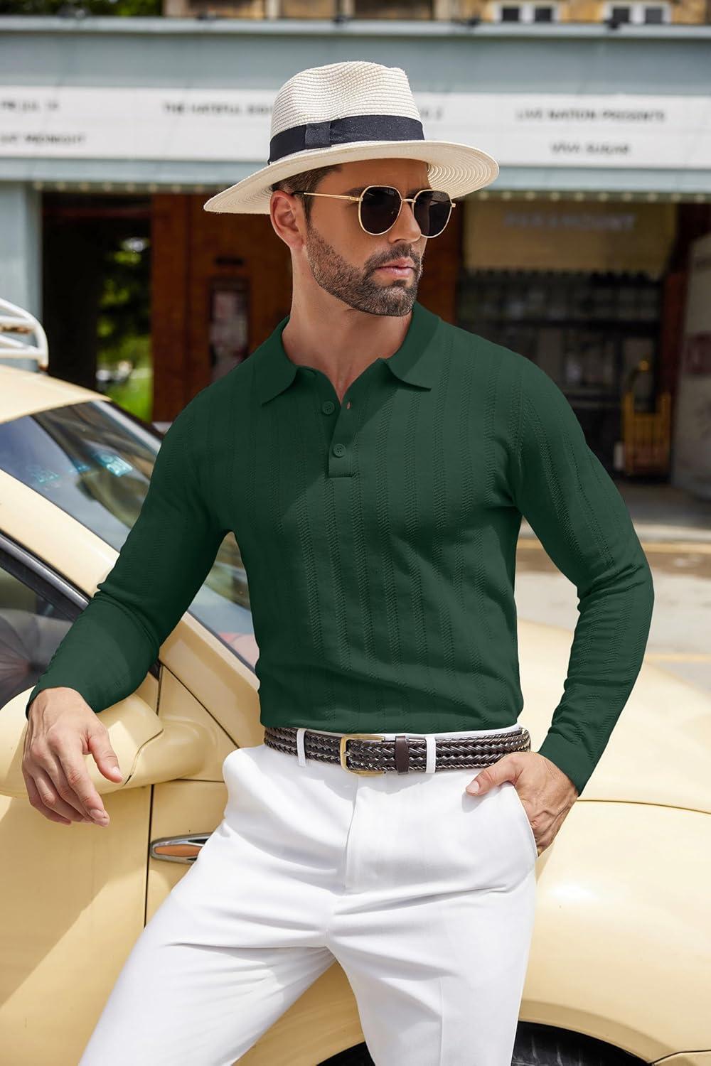 COOFANDY Men Knit Long Sleeve Polo Shirts Casual Dress Collared Sweater Pullover Button Down Golf Polo Shirts(Green)