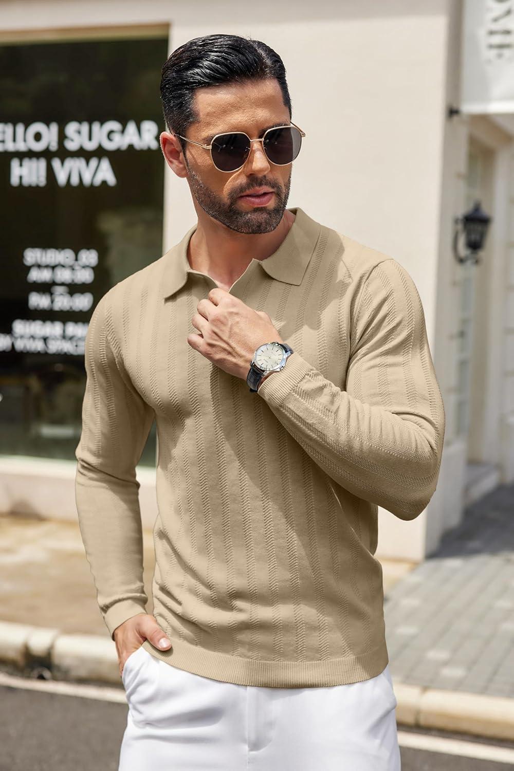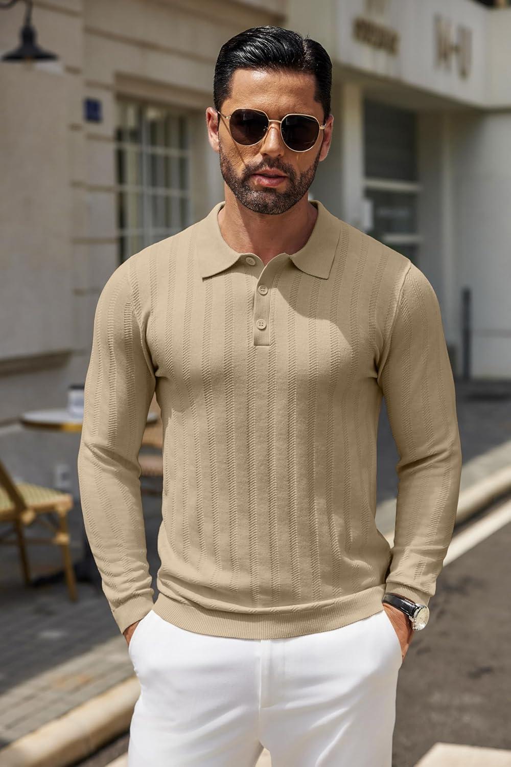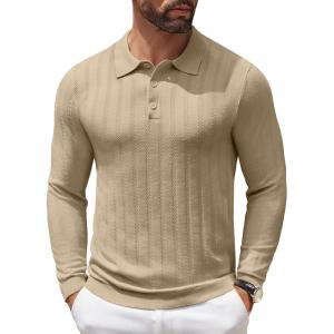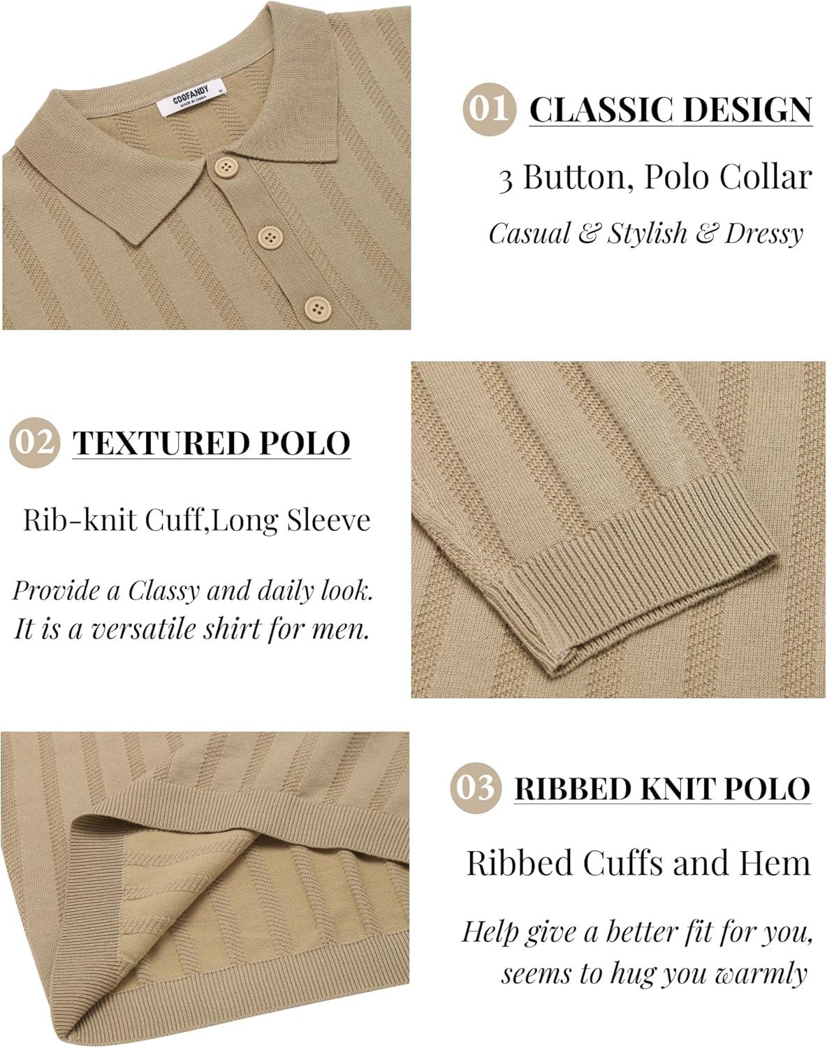COOFANDY Men Knit Long Sleeve Polo Shirts Casual Dress Collared Sweater Pullover Button Down Golf Polo Shirts(Khaki)
