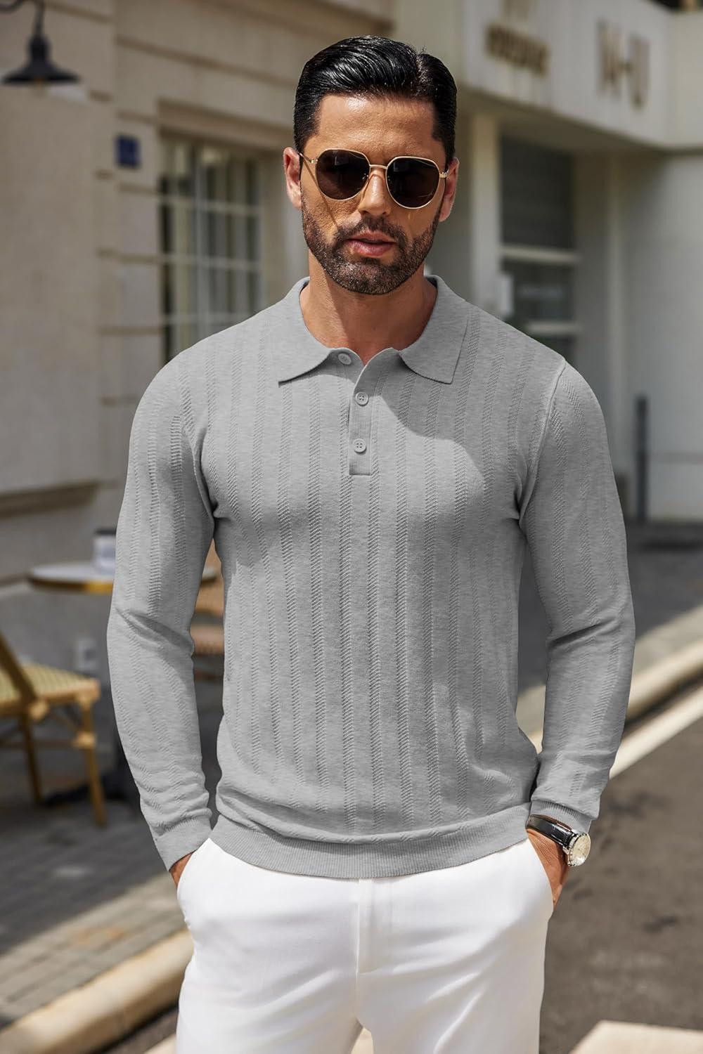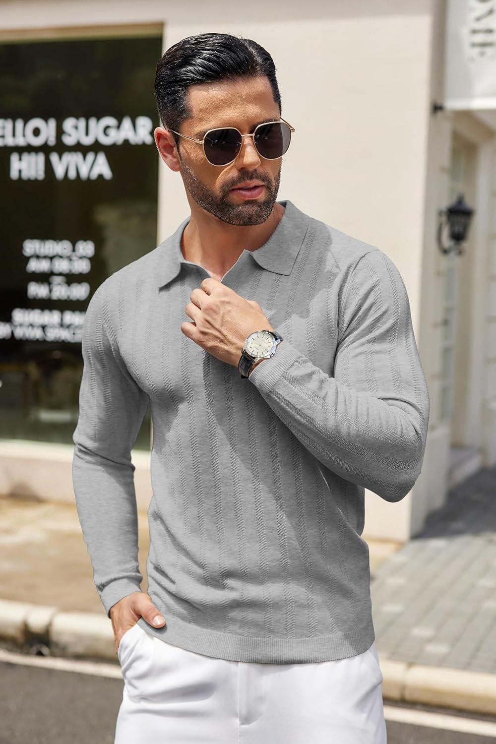 COOFANDY Long Sleeve Polo Shirts for Men Knit Polo Sweater Lightweight Ribbed Pullover Sweater(Light Gray)