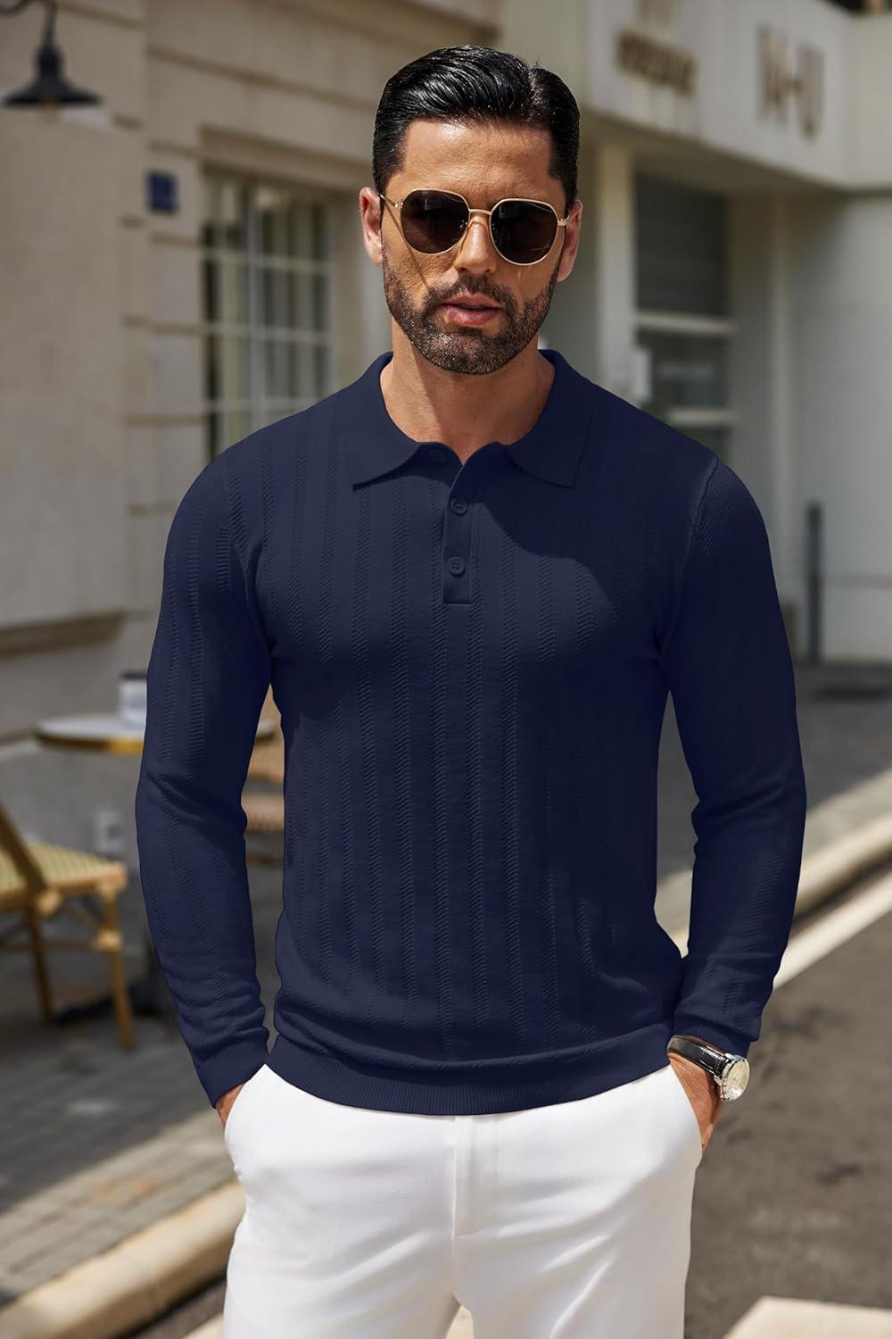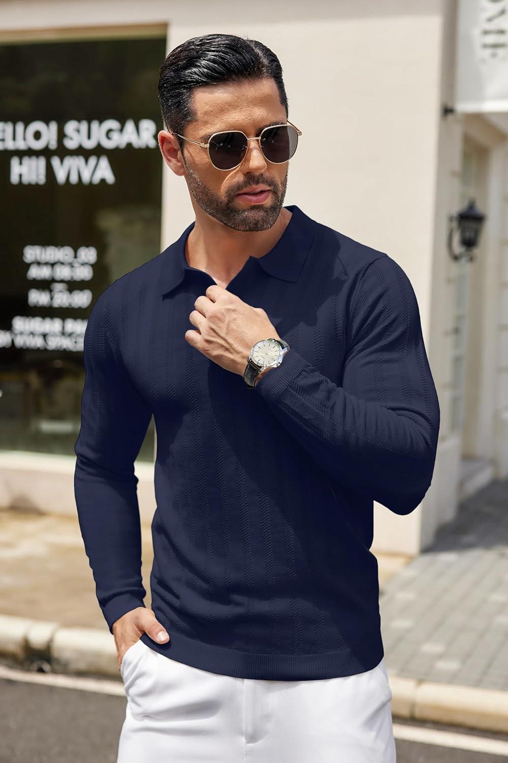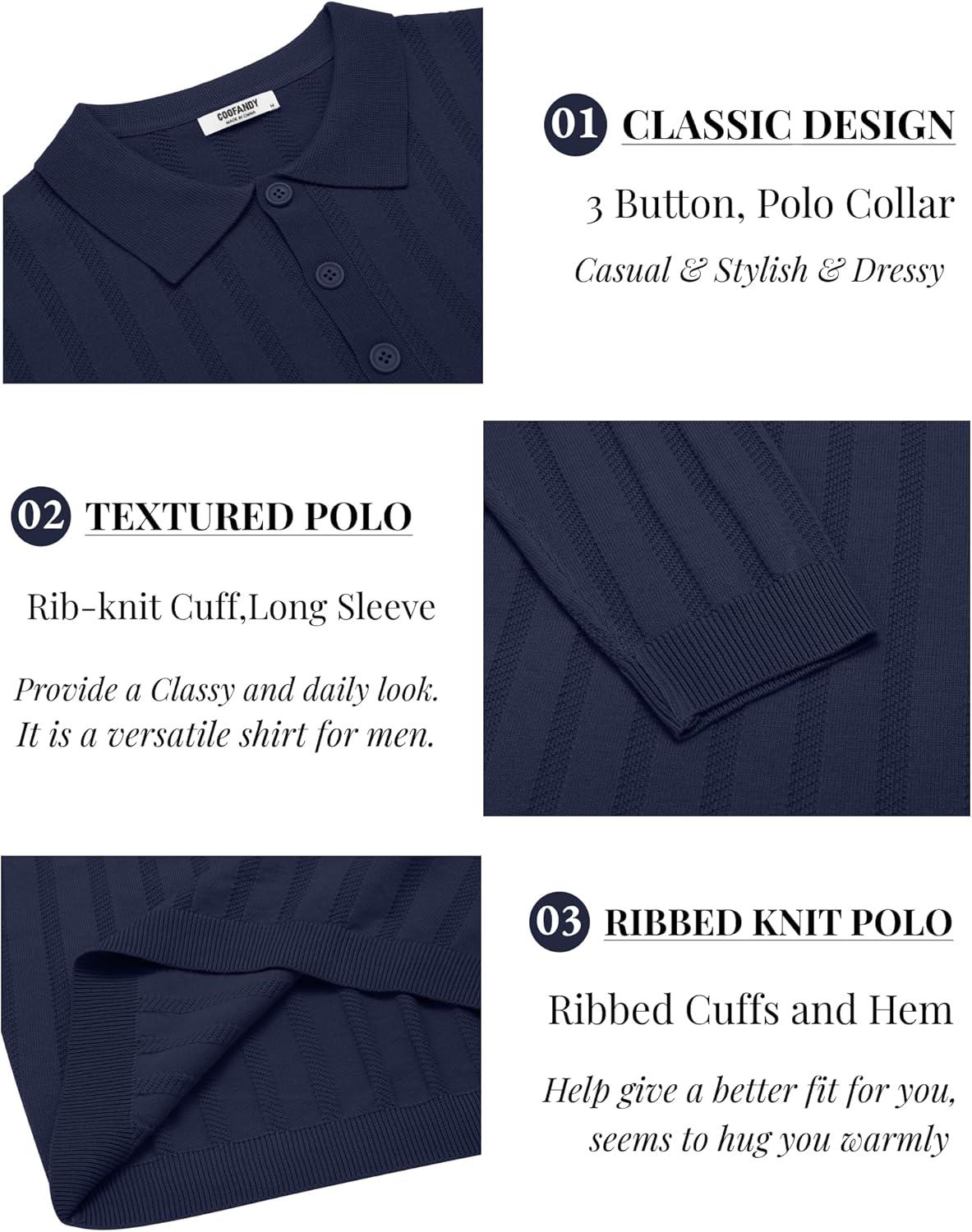 COOFANDY Long Sleeve Polo Shirts for Men Knit Polo Sweater Lightweight Ribbed Pullover Sweater(Navy Blue)