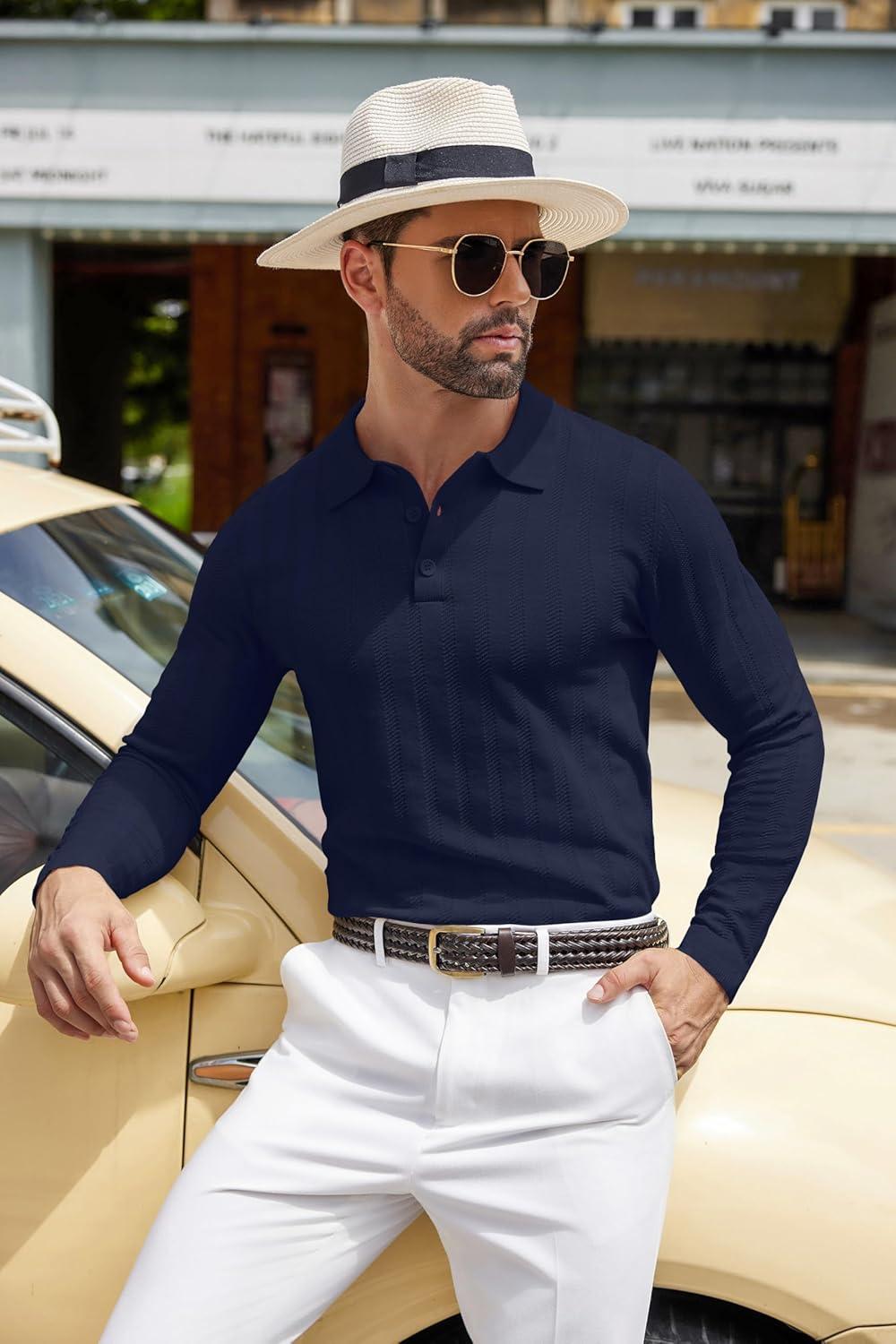 COOFANDY Men Knit Long Sleeve Polo Shirts Casual Dress Collared Sweater Pullover Button Down Golf Polo Shirts(Navy Blue)