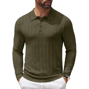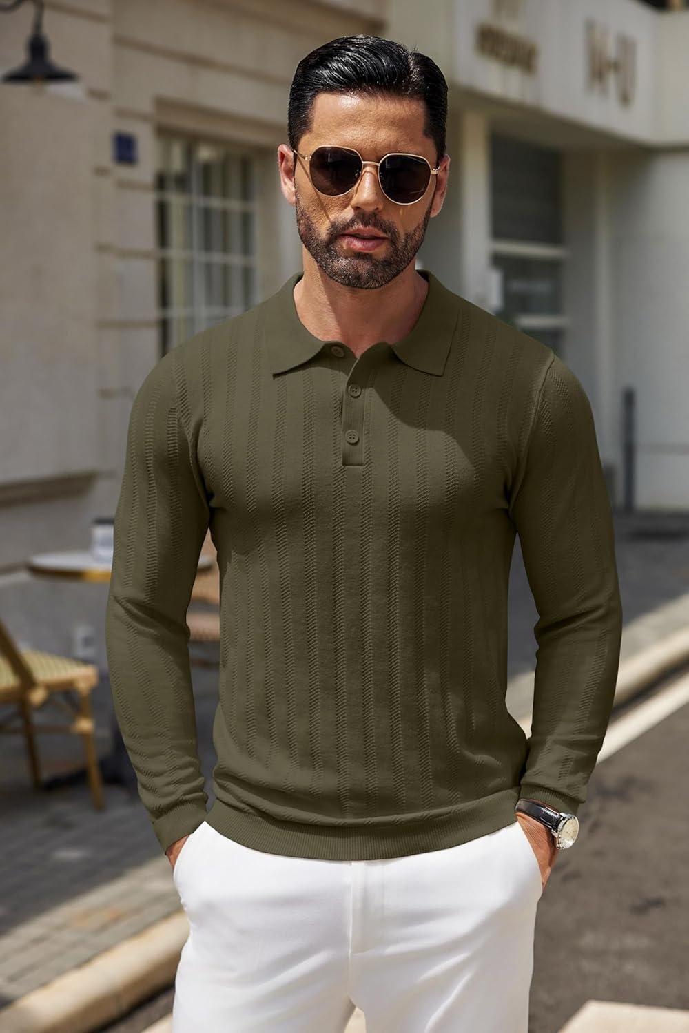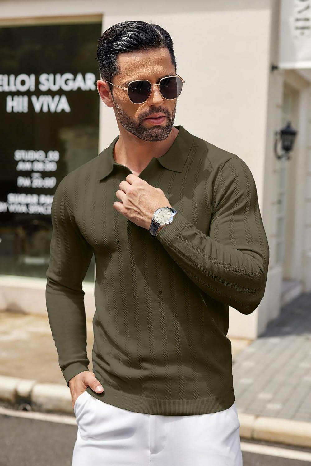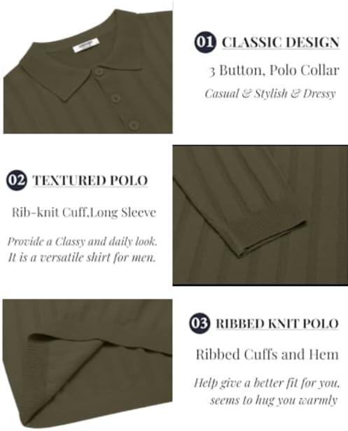 COOFANDY Men Knit Long Sleeve Polo Shirts Casual Dress Collared Sweater Pullover Button Down Golf Polo Shirts(Olive Green)