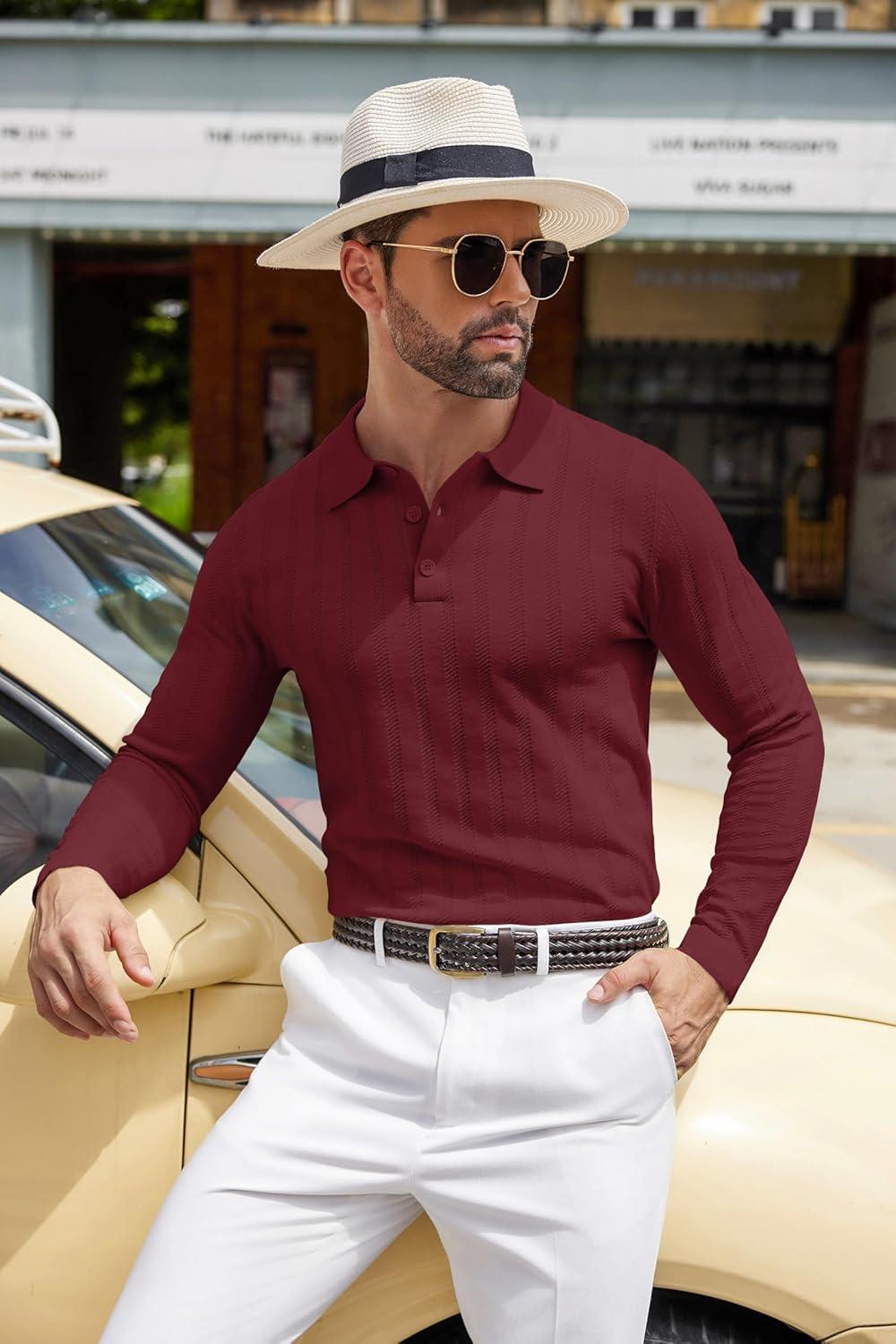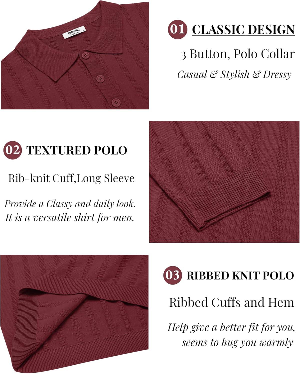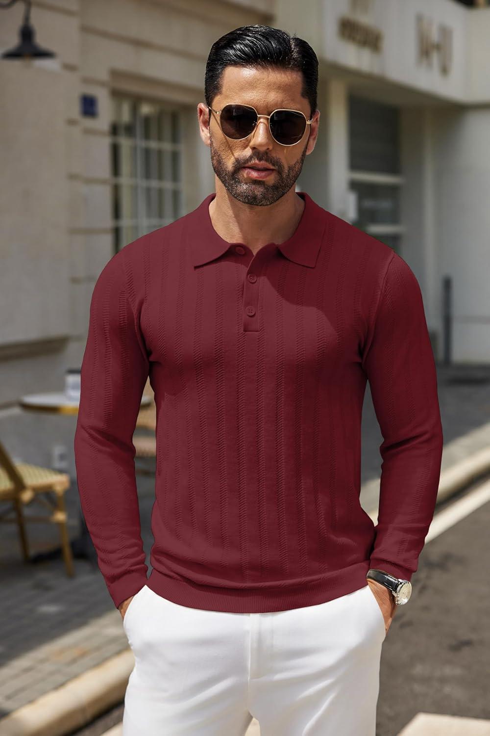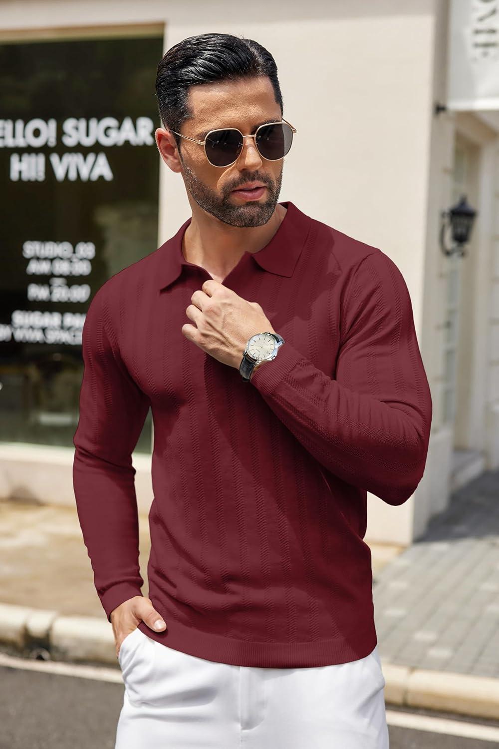 COOFANDY Men Knit Long Sleeve Polo Shirts Casual Dress Collared Sweater Pullover Button Down Golf Polo Shirts(Wine Red)
