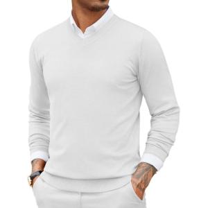COOFANDY Men Casual V Neck Sweater Ribbed Knit Slim Fit Long Sleeve Pullover Top(White)