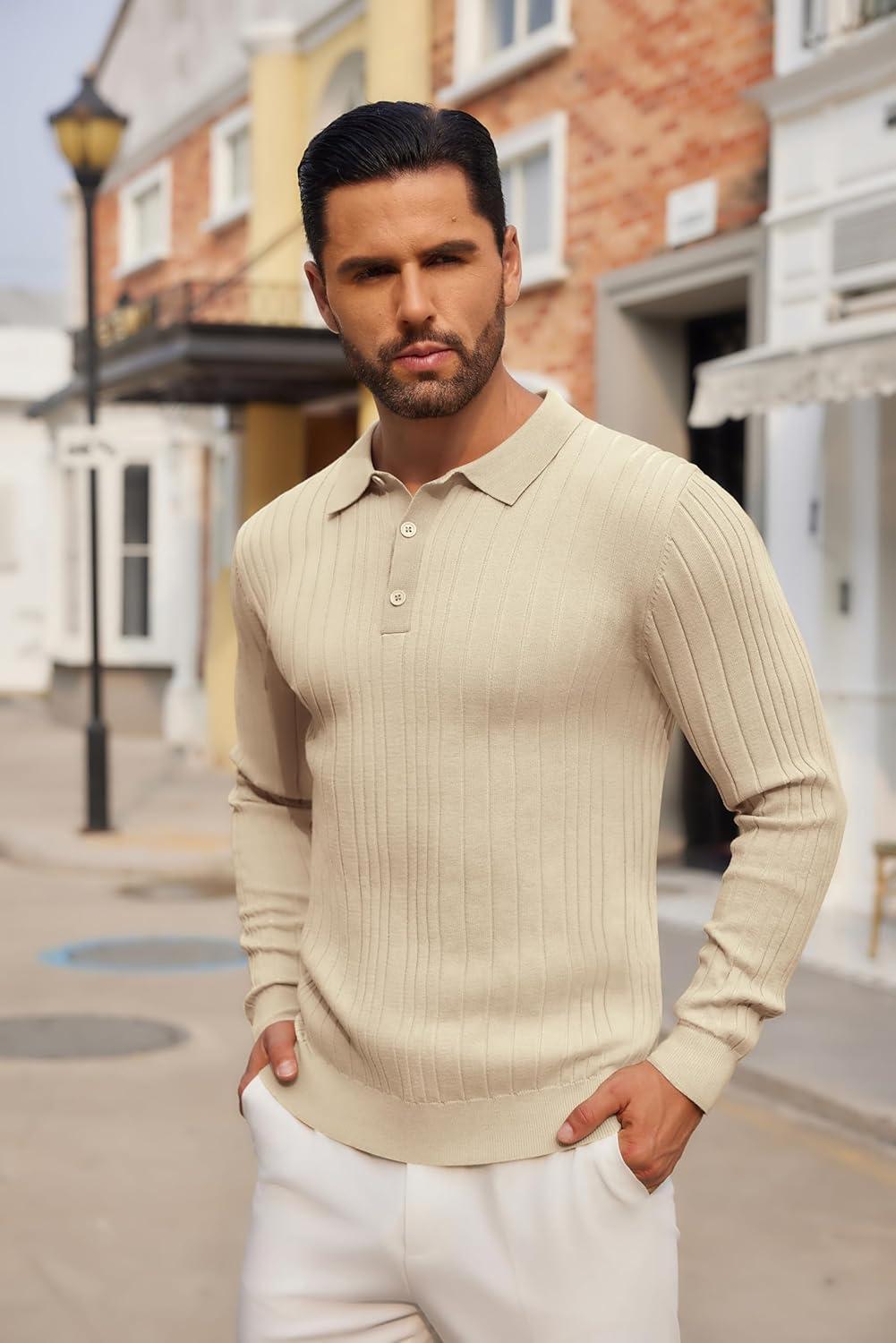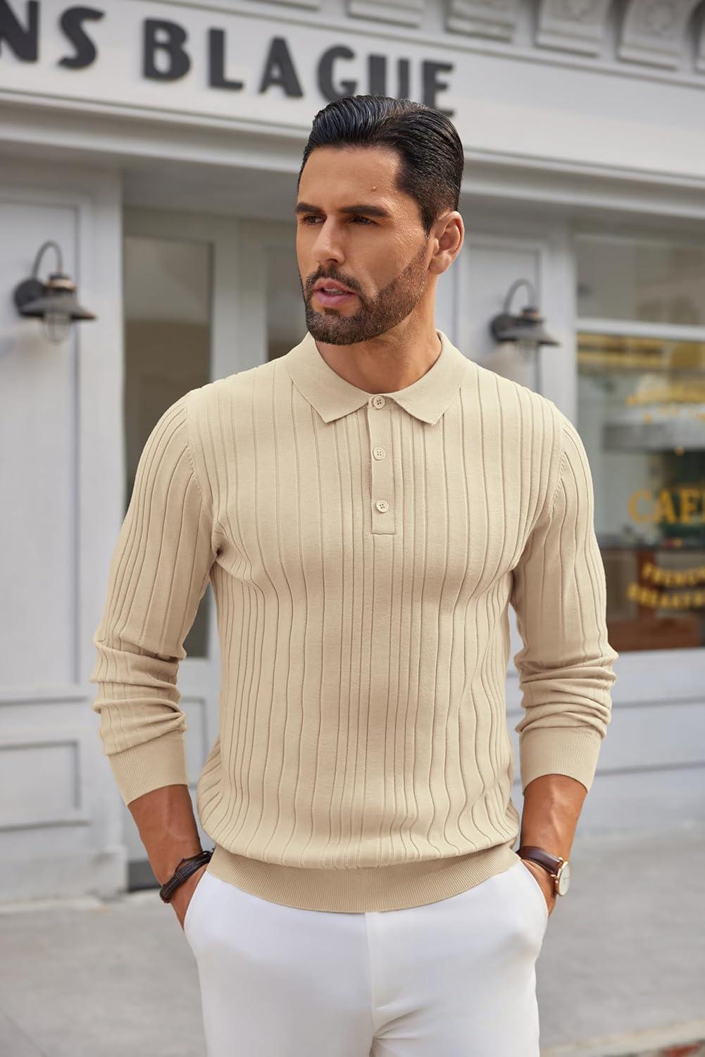 • COOFANDY Men’s Knitted Polo Neck Long Sleeve Winter Thermal Casual Sweater(Light Khaki)