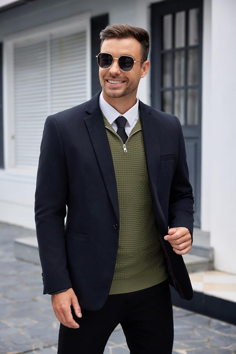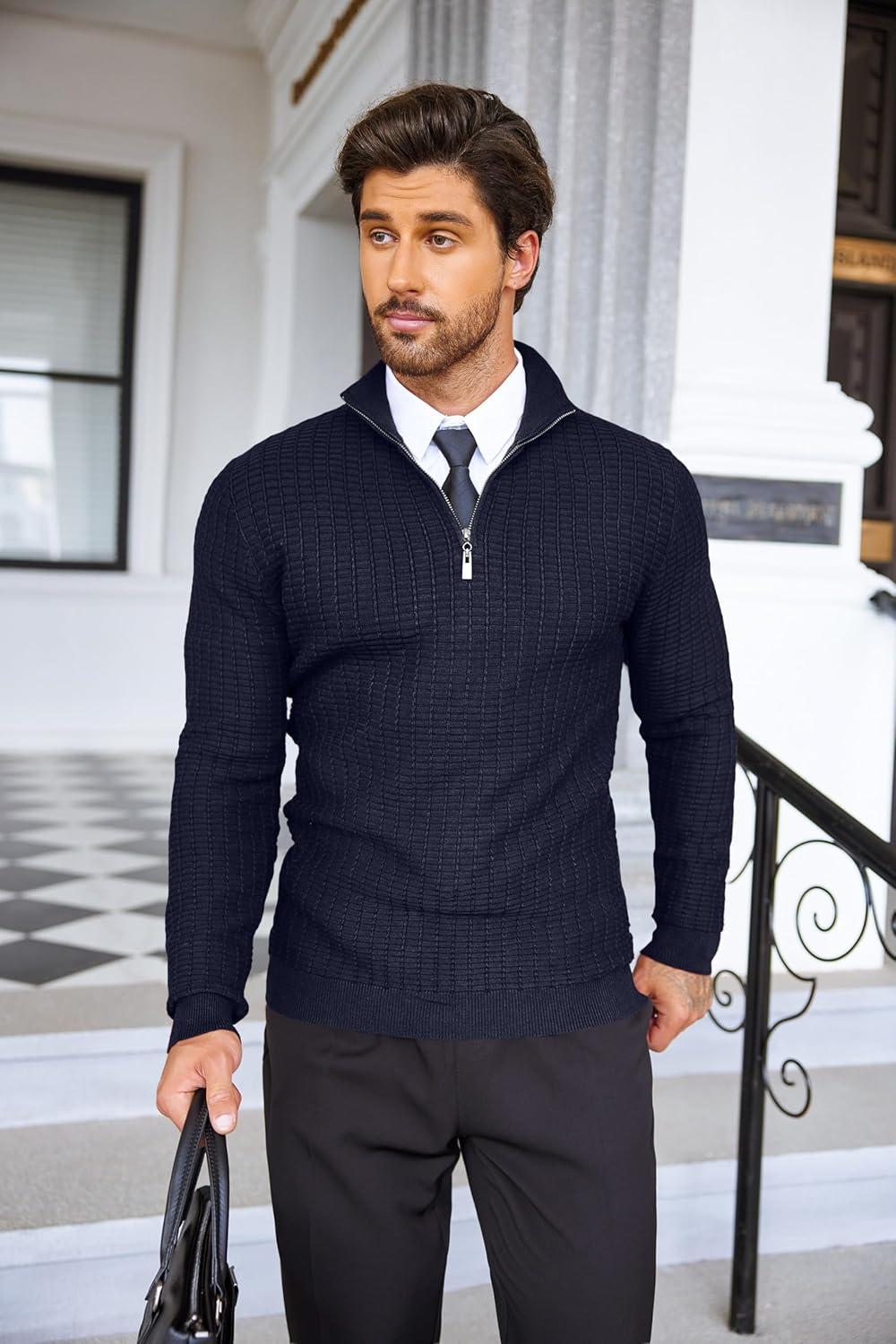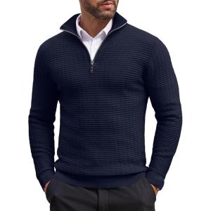 COOFANDY Men’s Quarter Zip Sweaters Slim Fit Lightweight Knitted Mock Neck Pullover Casual Polo Sweaters(Navy Blue)
