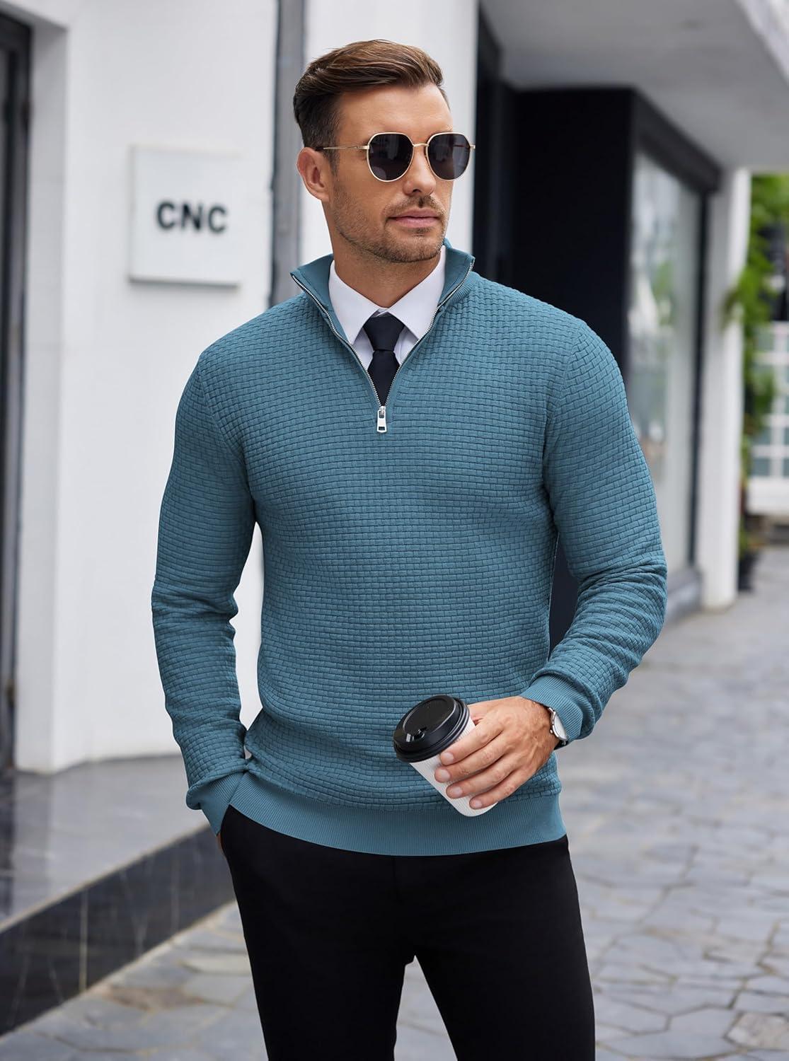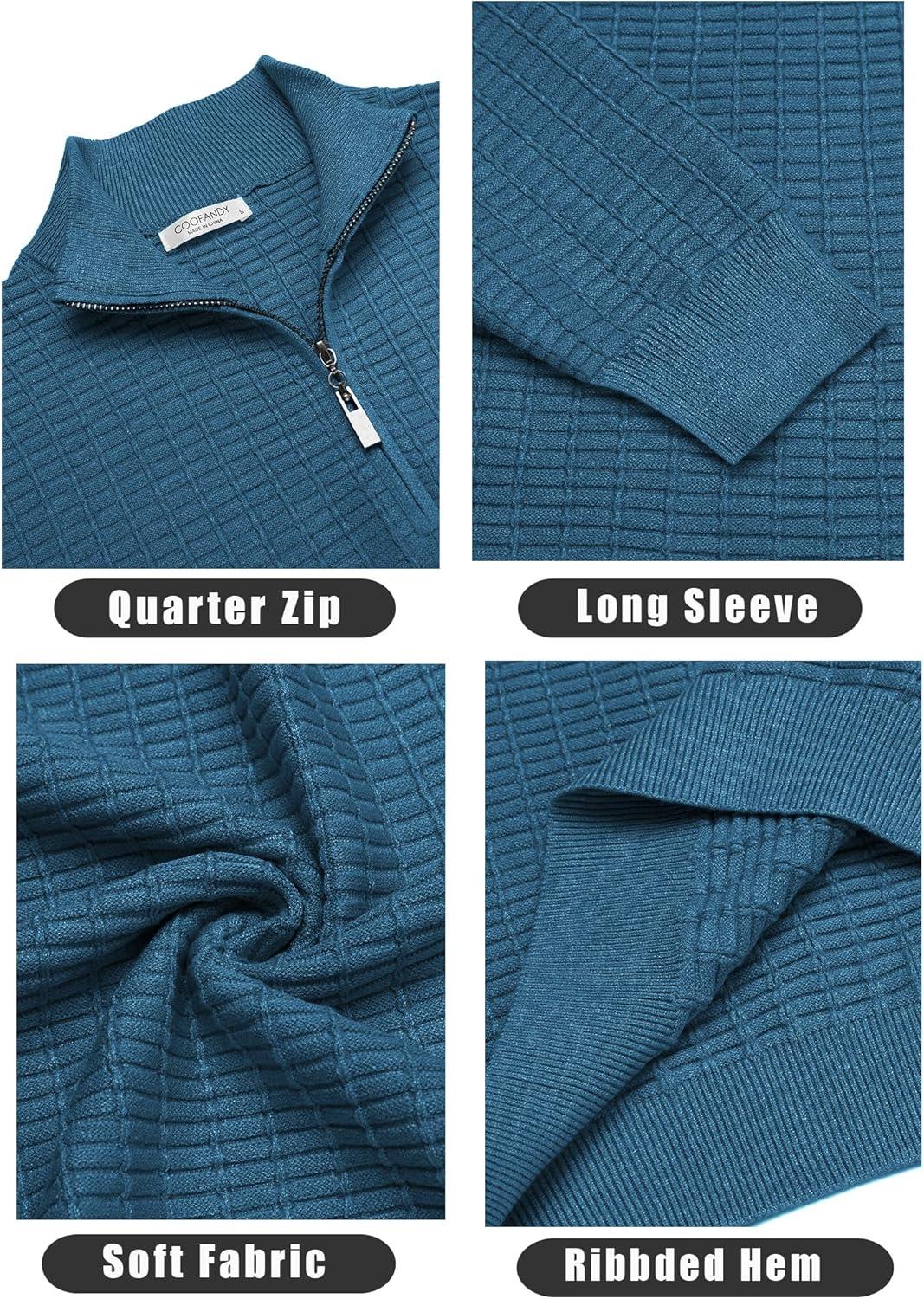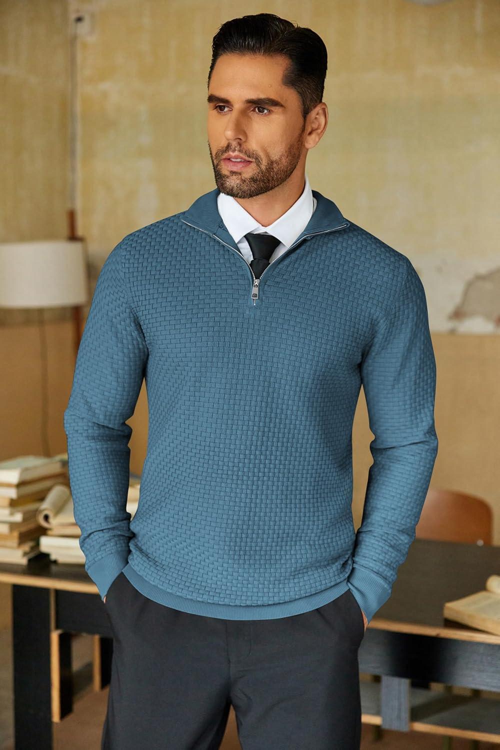 COOFANDY Men’s Quarter Zip Sweaters Slim Fit Lightweight Knitted Mock Neck Pullover Casual Polo Sweaters(Denim Blue)