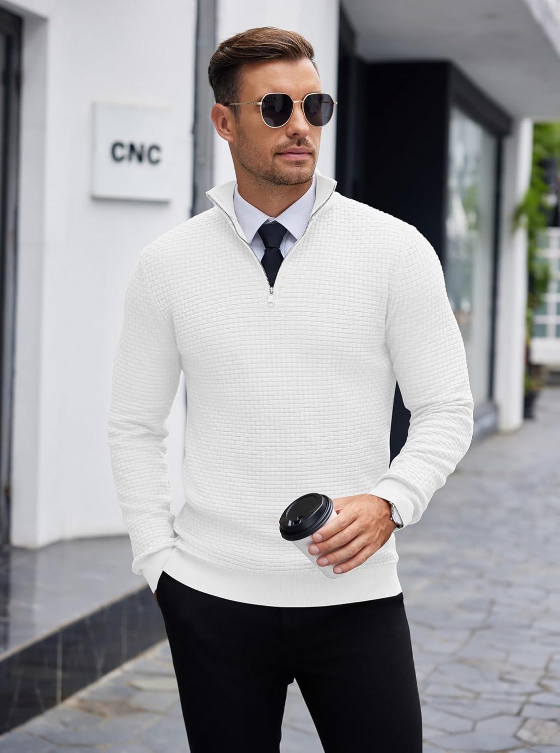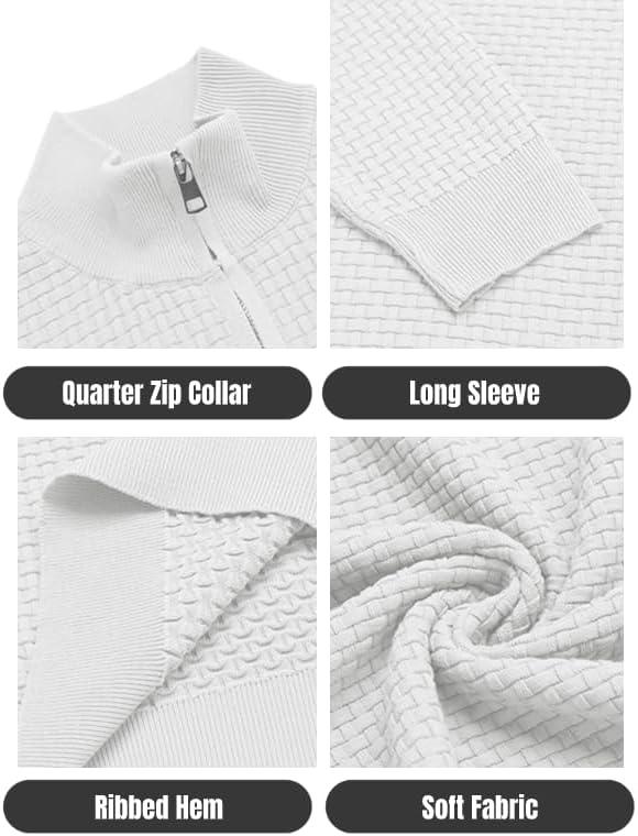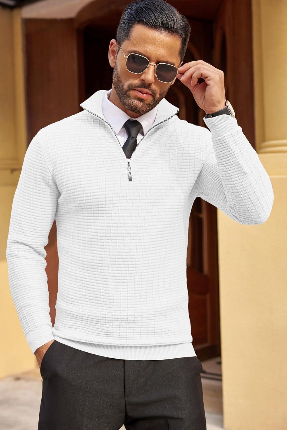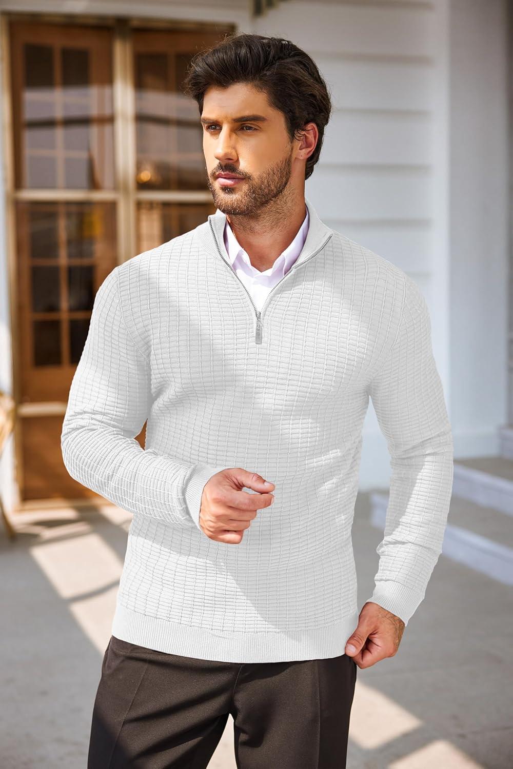 COOFANDY Men’s Quarter Zip Sweaters Slim Fit Lightweight Knitted Mock Neck Pullover Casual Polo Sweaters(White)