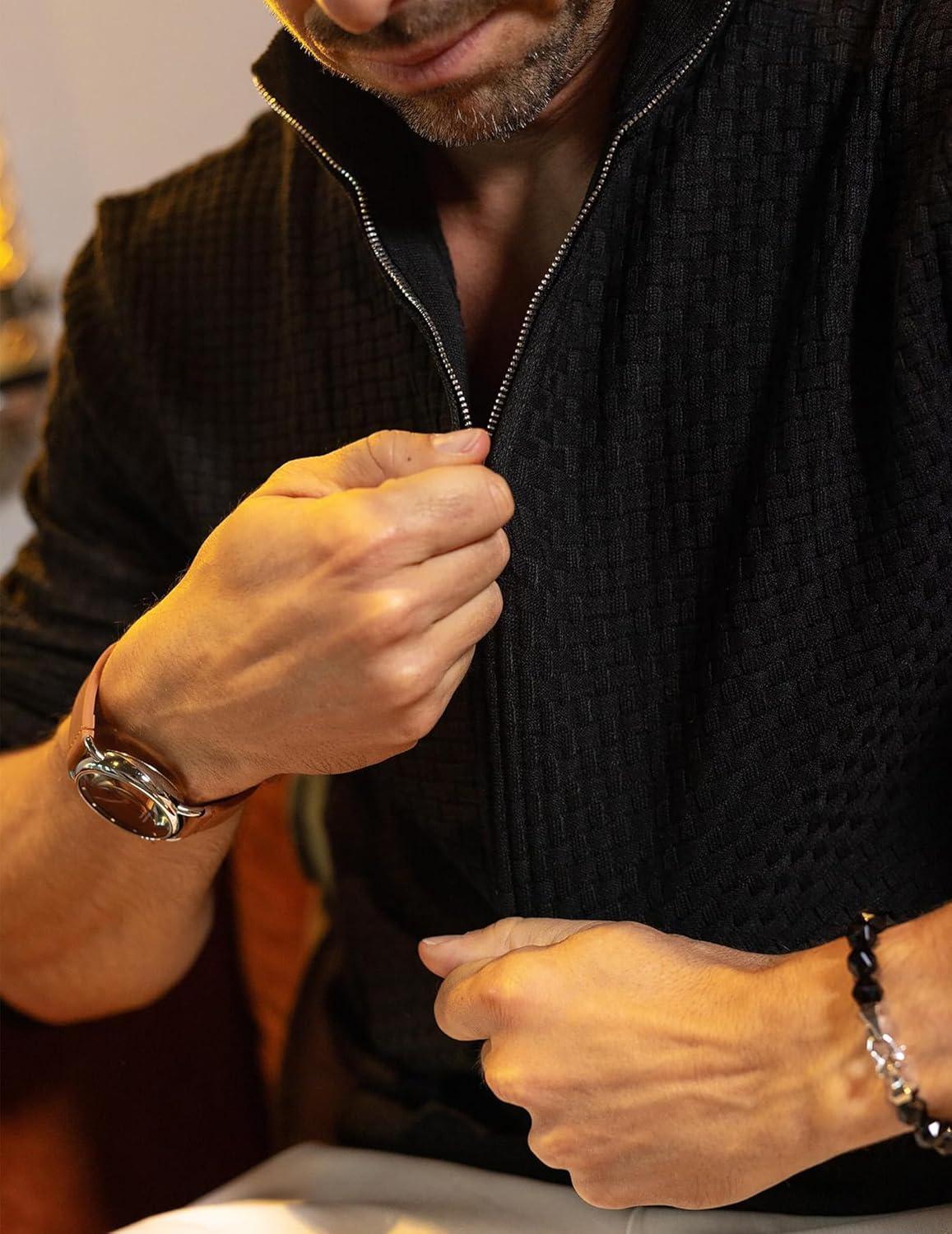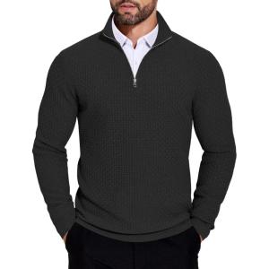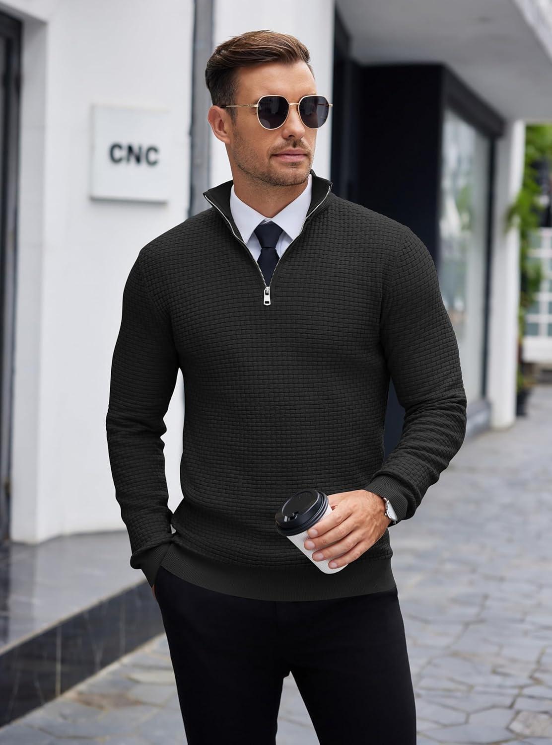 COOFANDY Men’s Quarter Zip Sweaters Slim Fit Lightweight Knitted Mock Neck Pullover Casual Polo Sweaters(All Black)