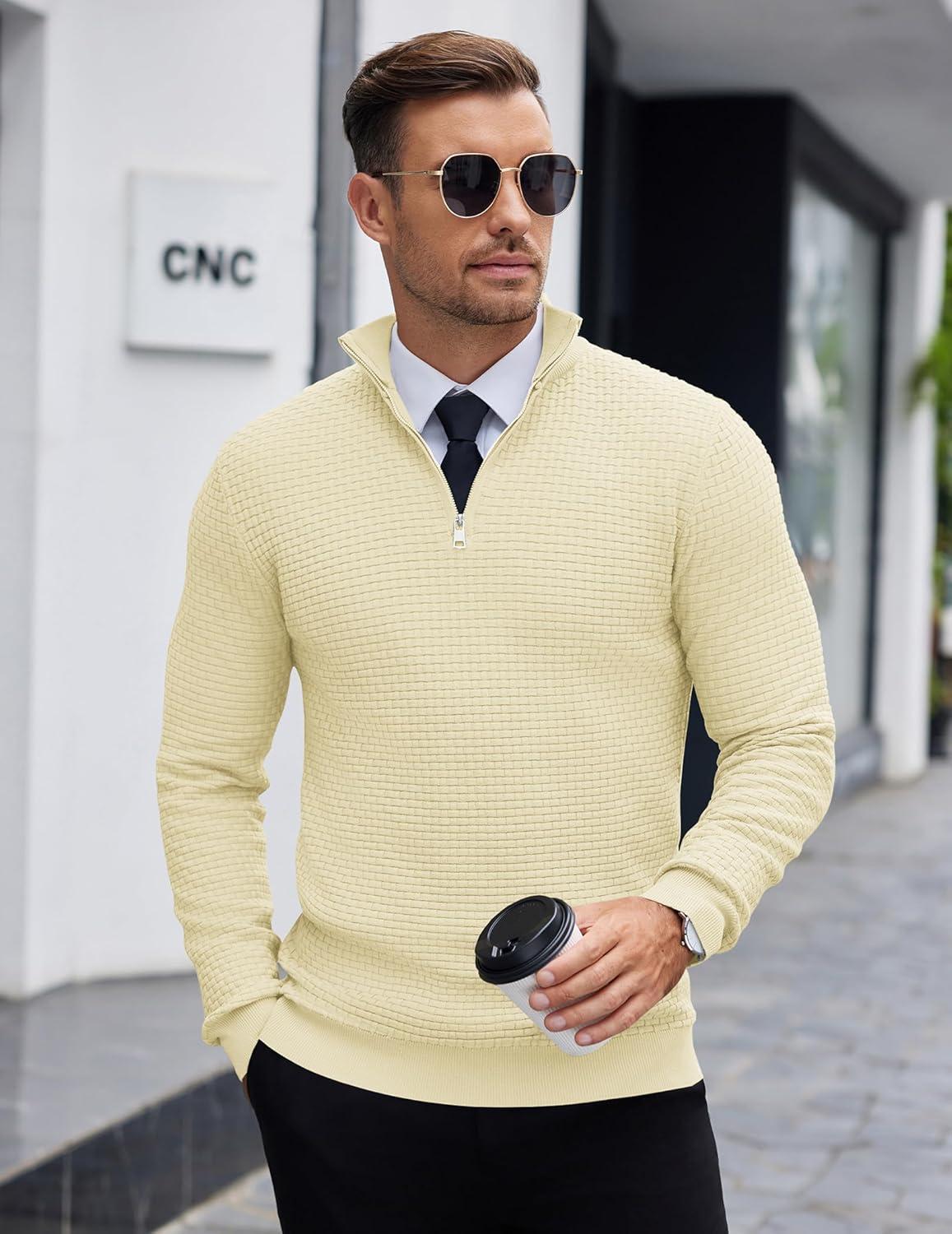 COOFANDY Men’s Quarter Zip Sweaters Slim Fit Lightweight Knitted Mock Neck Pullover Casual Polo Sweaters(Beige)