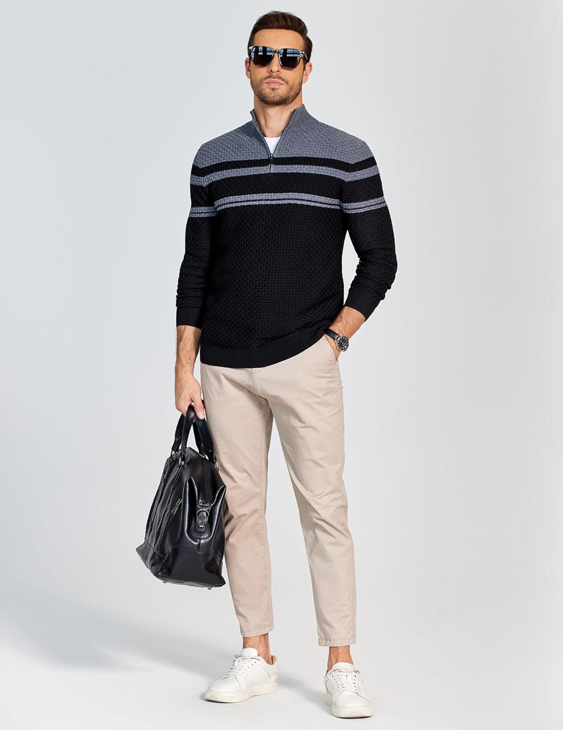 COOFANDY Men’s Quarter Zip Sweaters Slim Fit Lightweight Knitted Mock Neck Pullover Casual Polo Sweaters(Gray Stripes/Black Background)