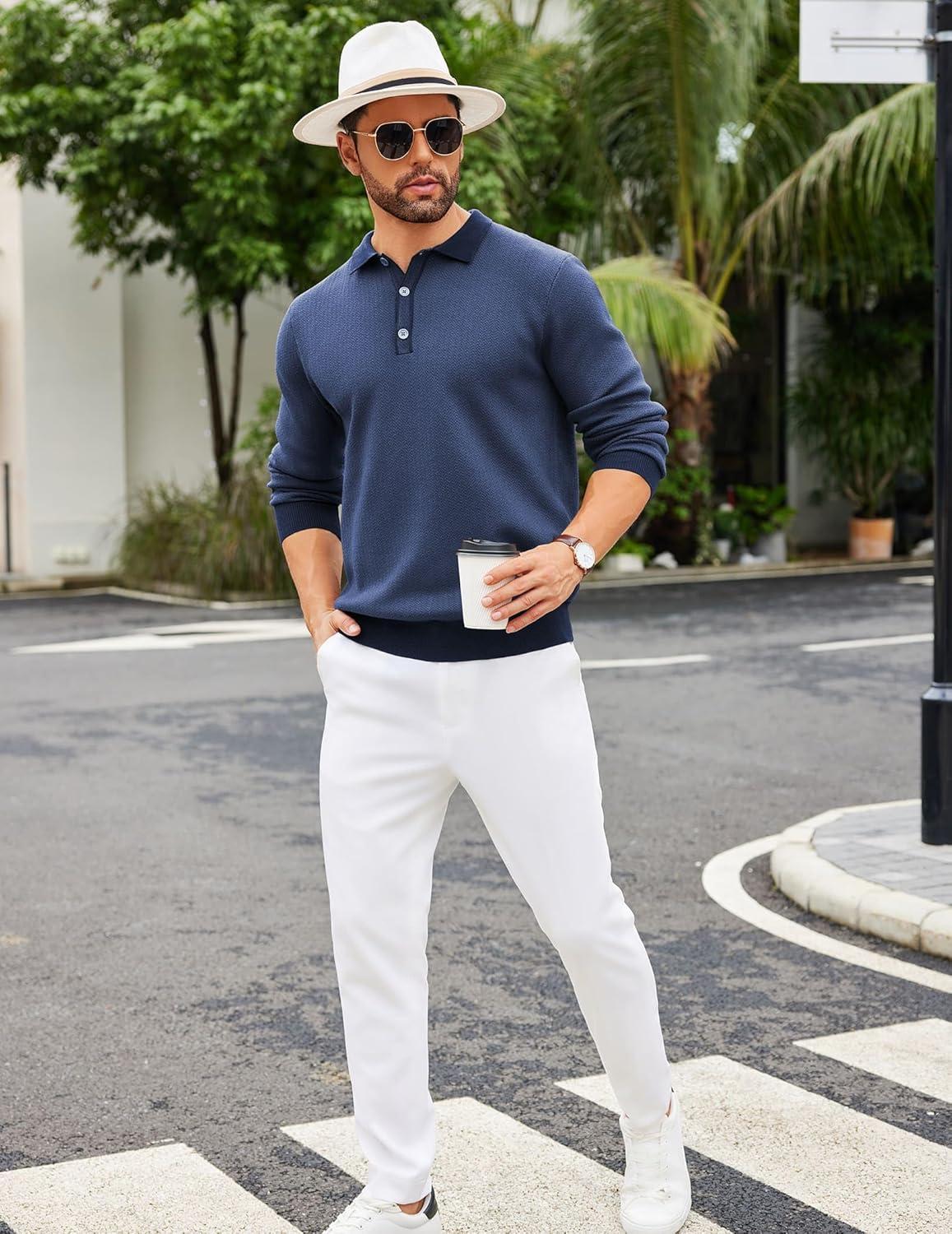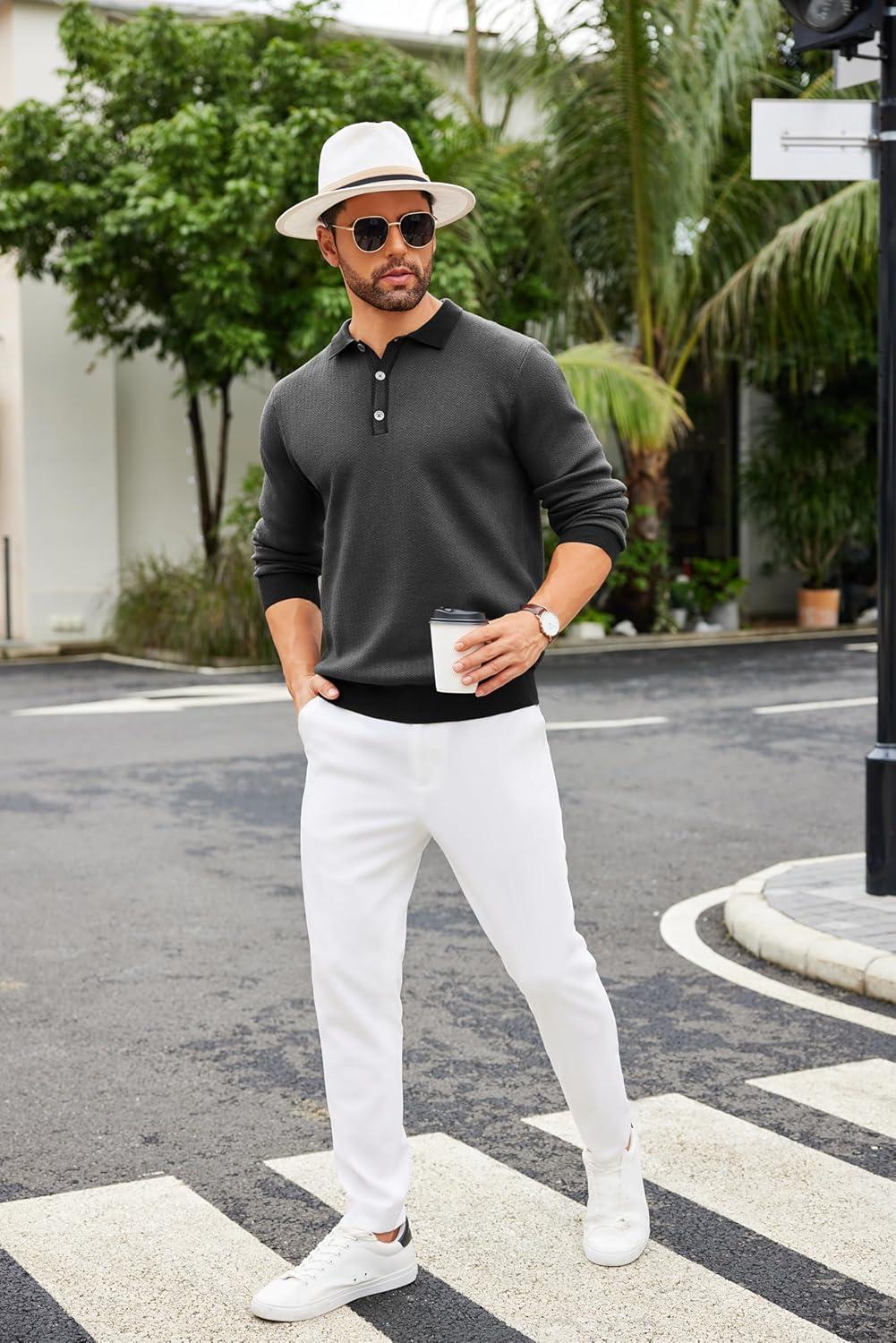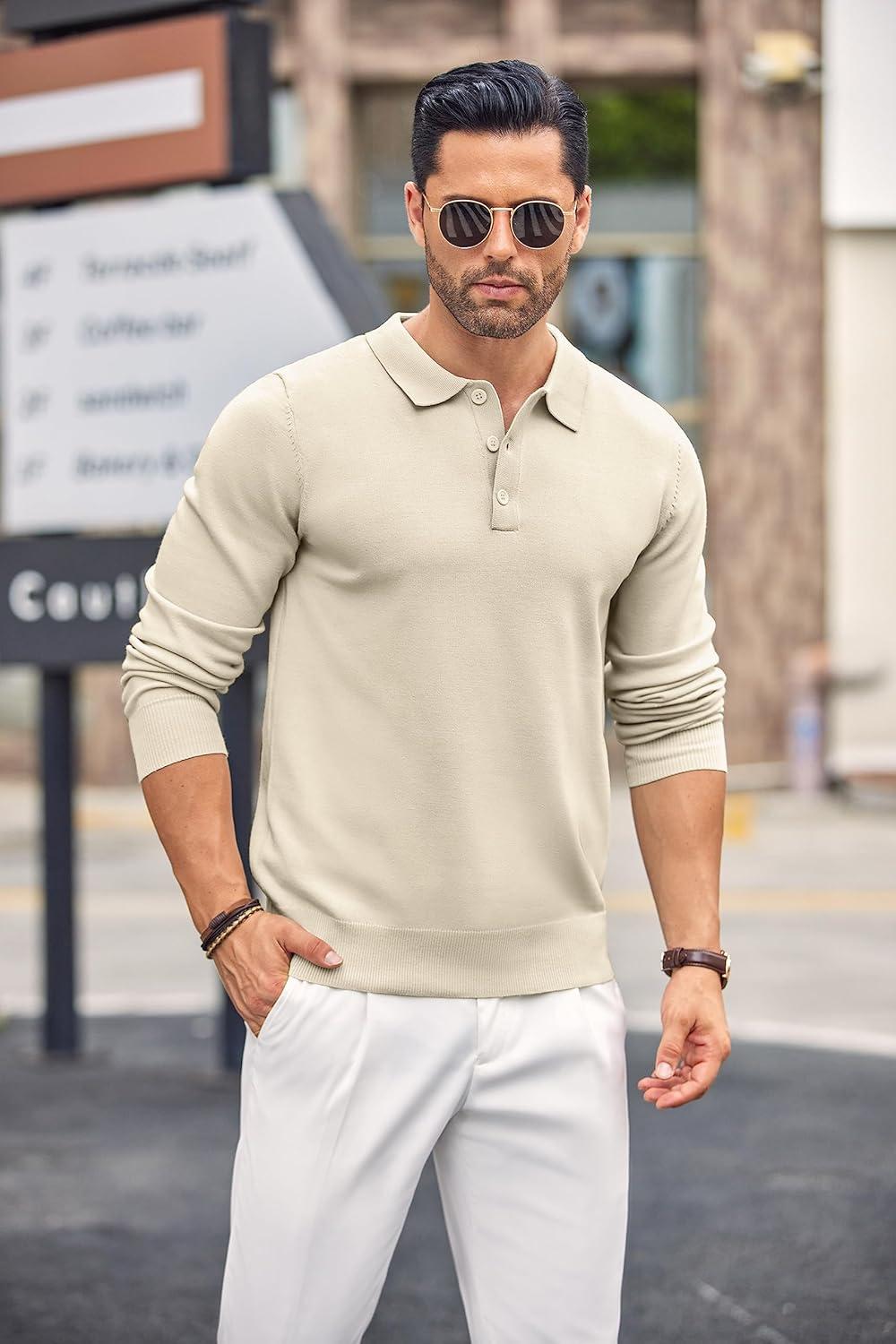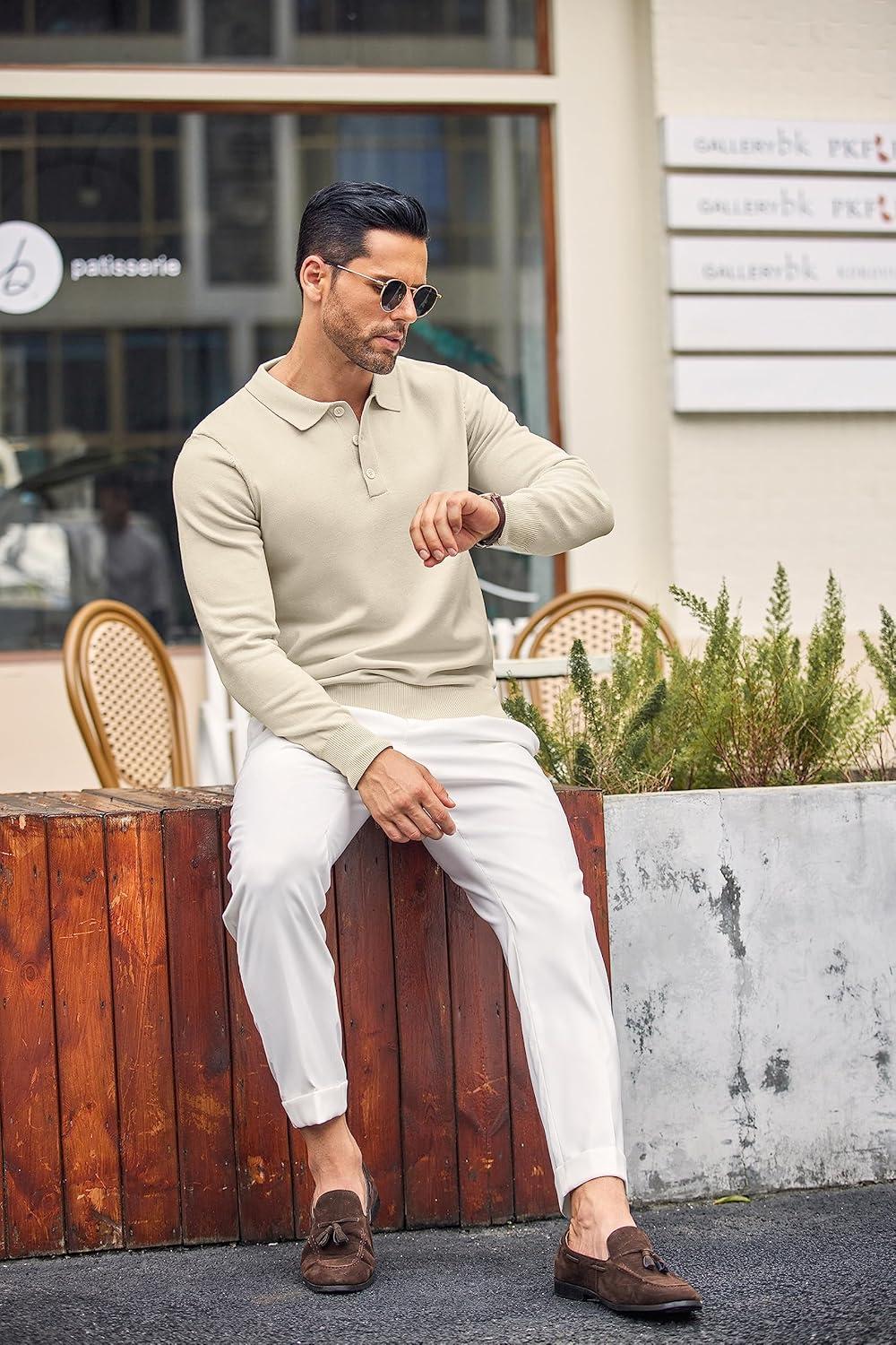 COOFANDY Mens Knit Polo Shirts Long Sleeve Sweater Casual Polo Shirts Lightweight Collared T Shirts(White)