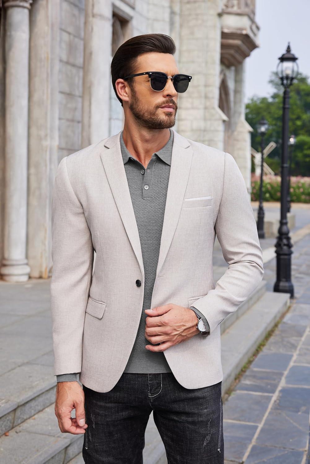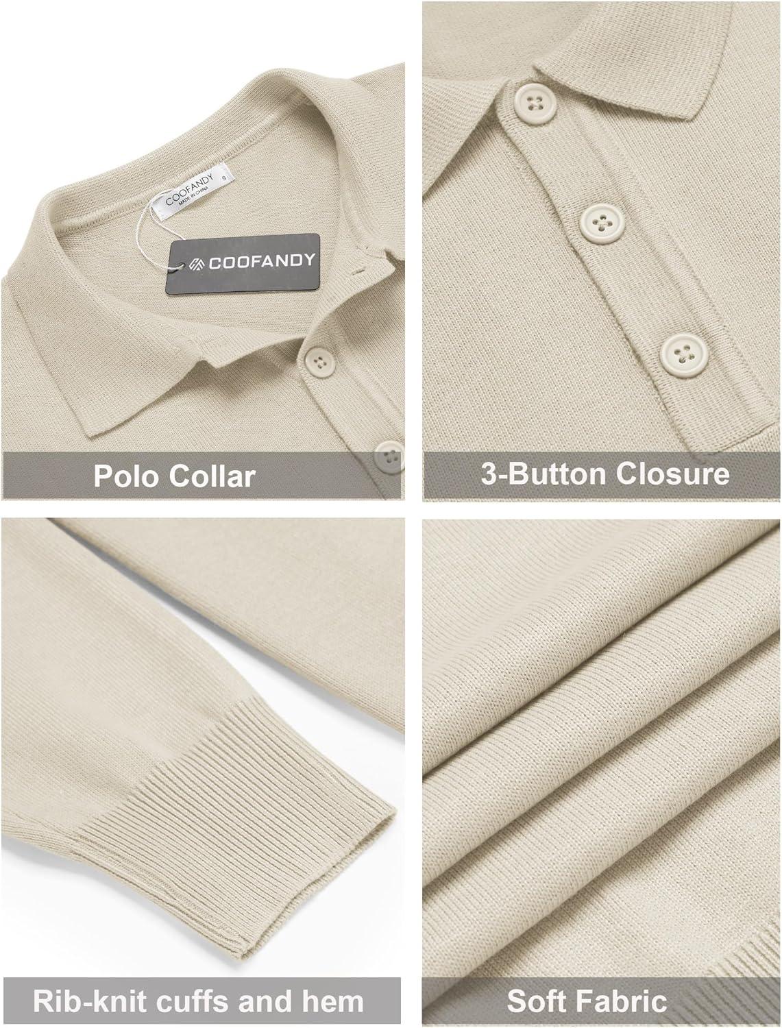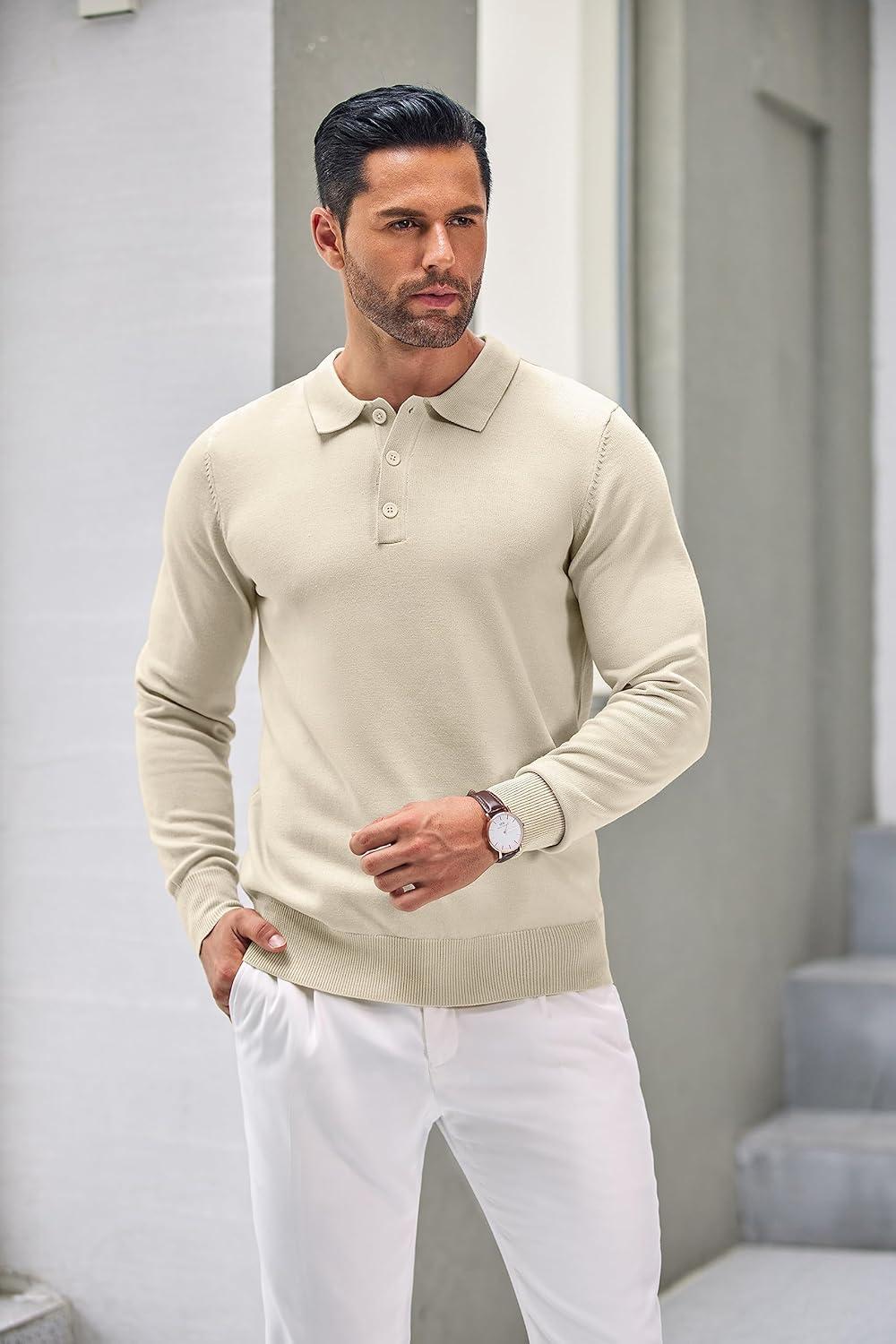 COOFANDY Mens Knit Polo Shirts Casual Long Sleeve Classic Polo Shirts Button Down Golf Shirts(Cream)