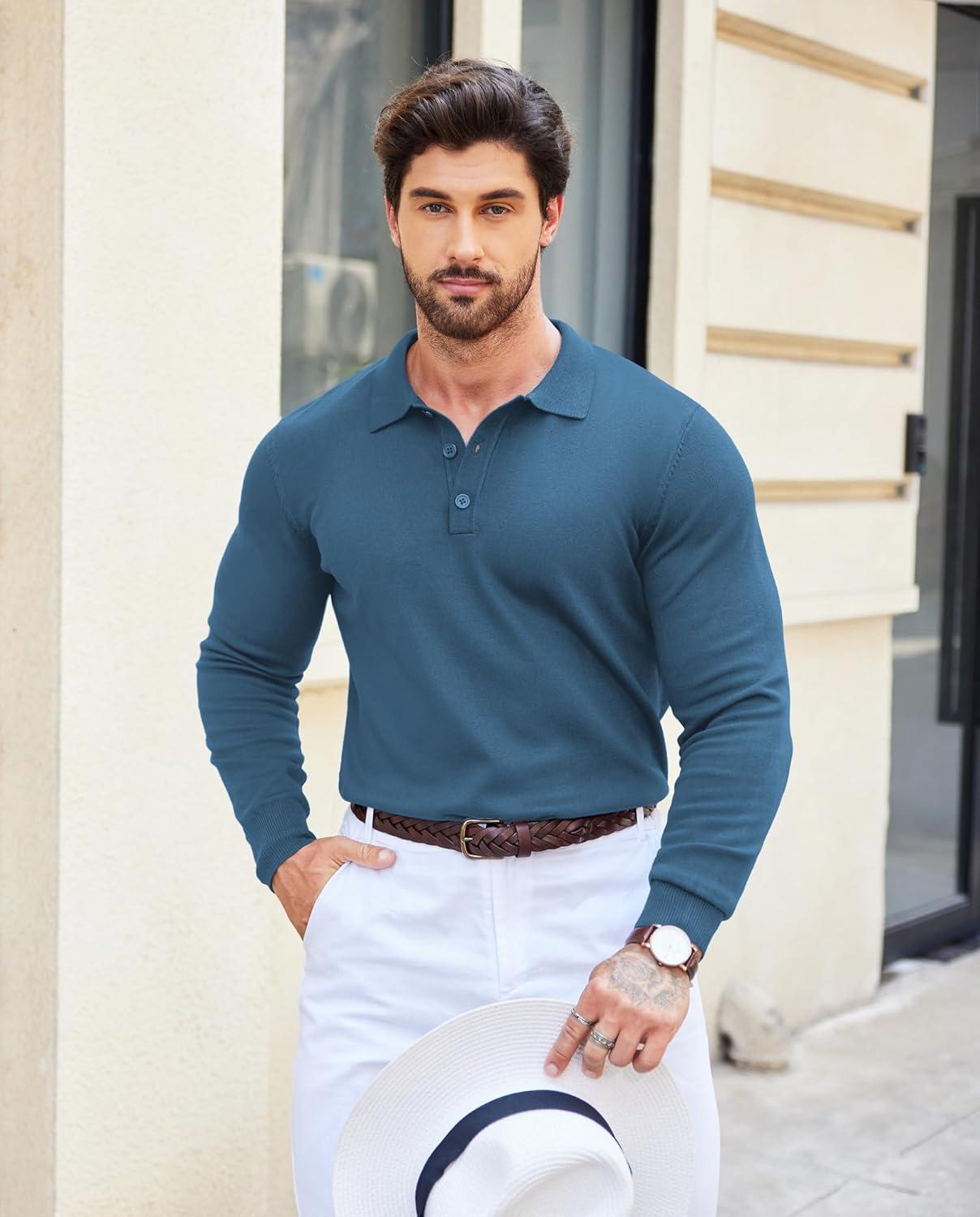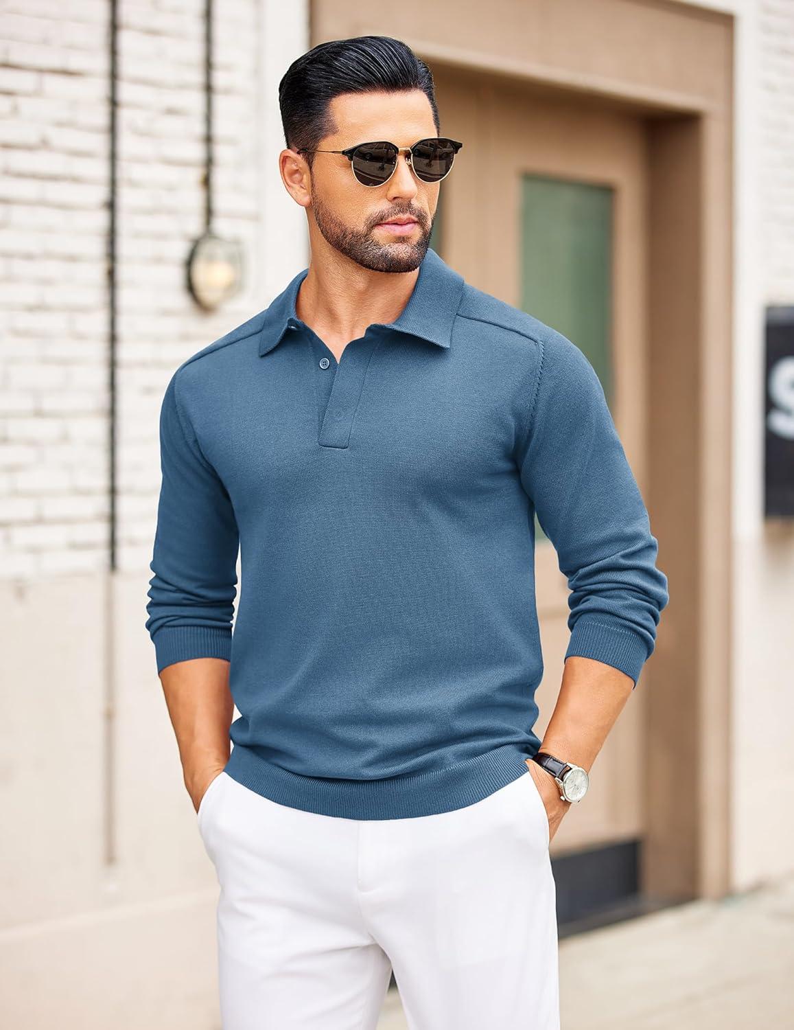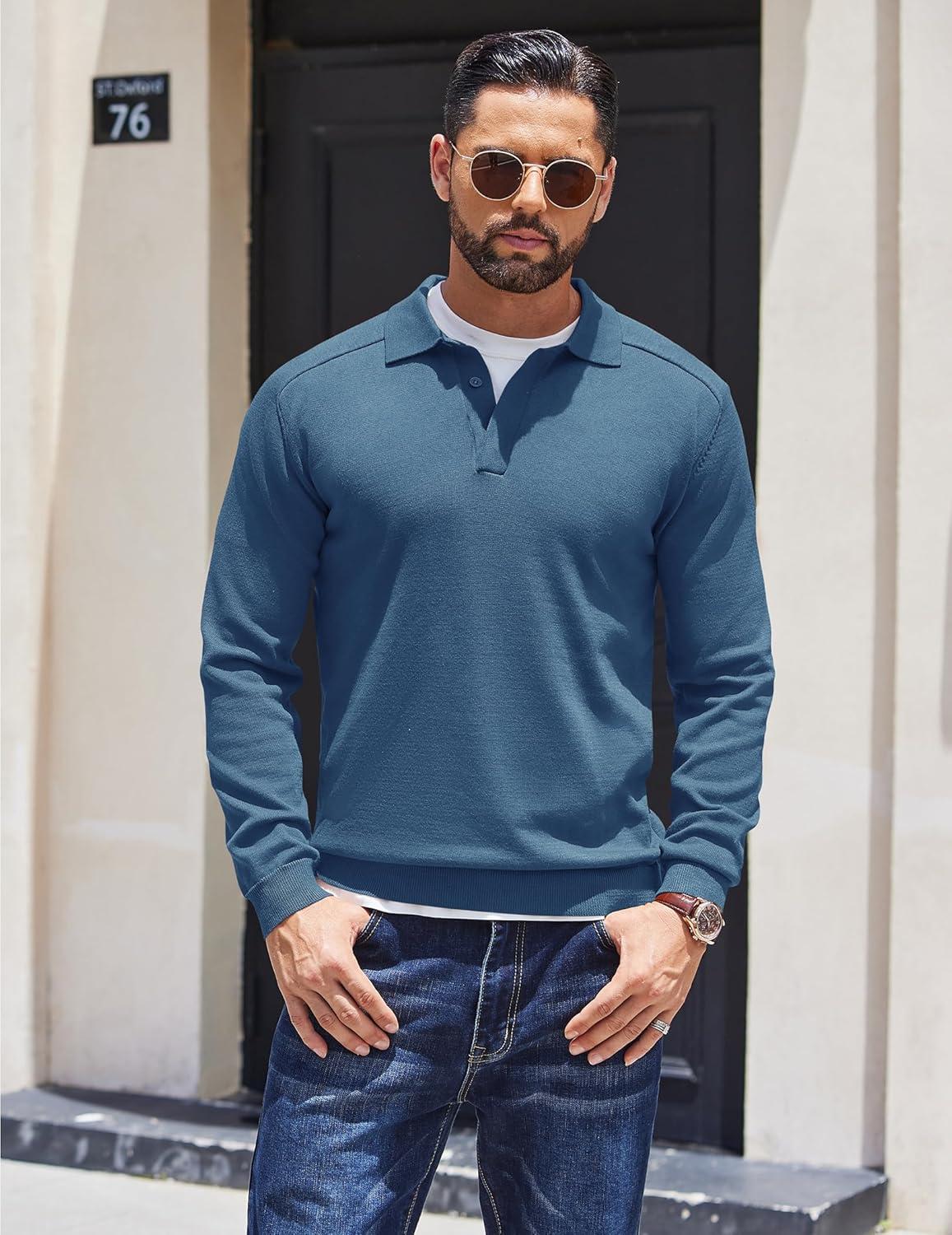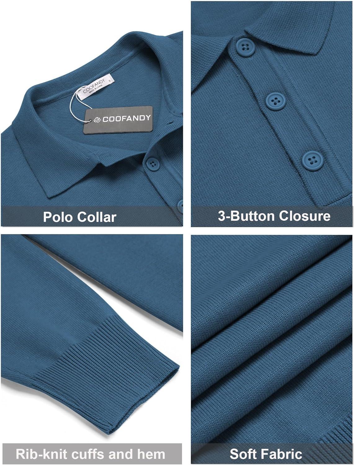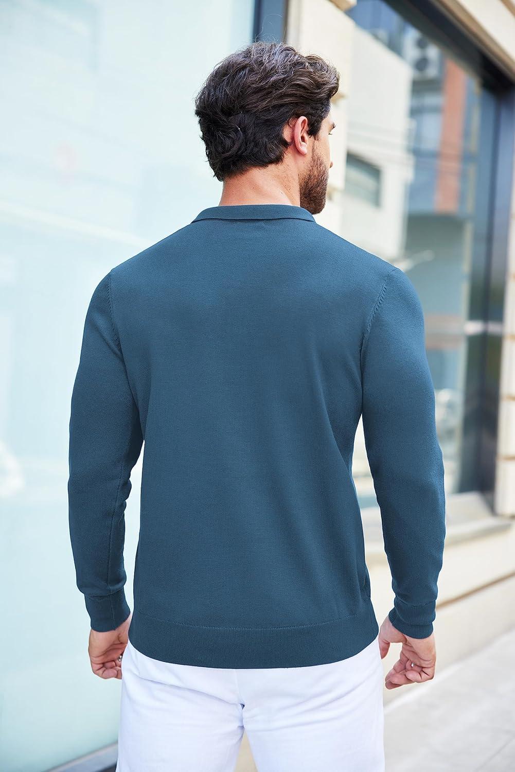COOFANDY Mens Knit Polo Shirts Casual Long Sleeve Classic Polo Shirts Button Down Golf Shirts(Denim Blue)