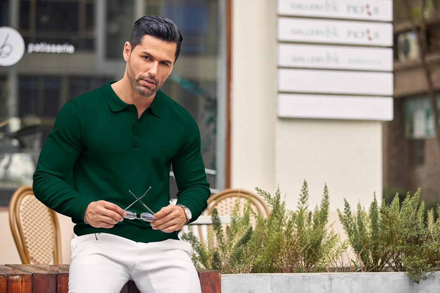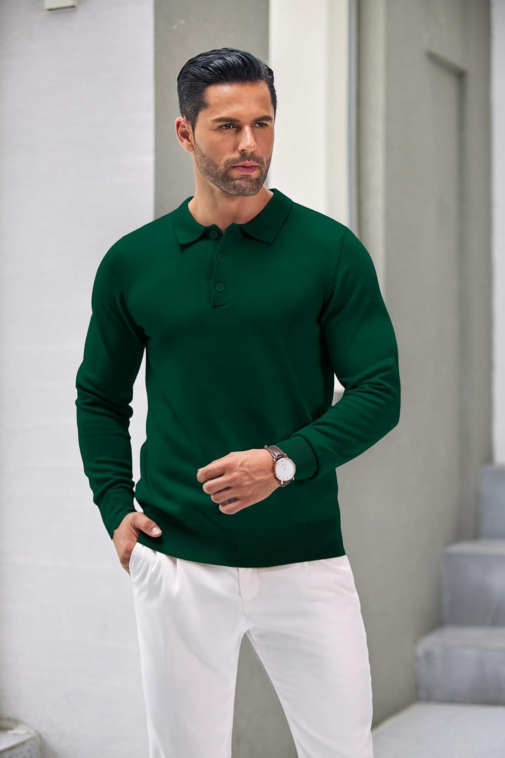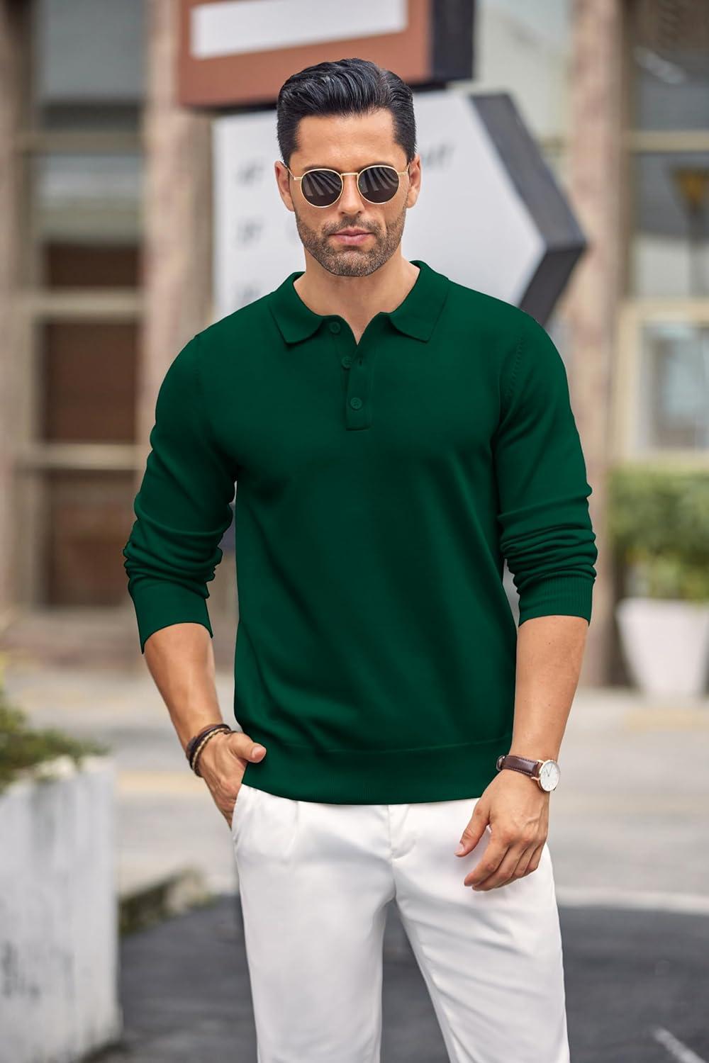 COOFANDY Mens Knit Polo Shirts Casual Long Sleeve Classic Polo Shirts Button Down Golf Shirts(Dark Green)