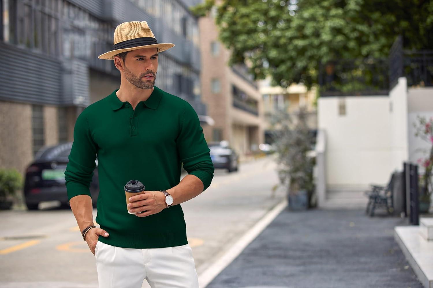 COOFANDY Mens Knit Polo Sweater Long Sleeve Polo Collared Sweaters Hidden Button Casual Pullover Sweater(Dark Green)