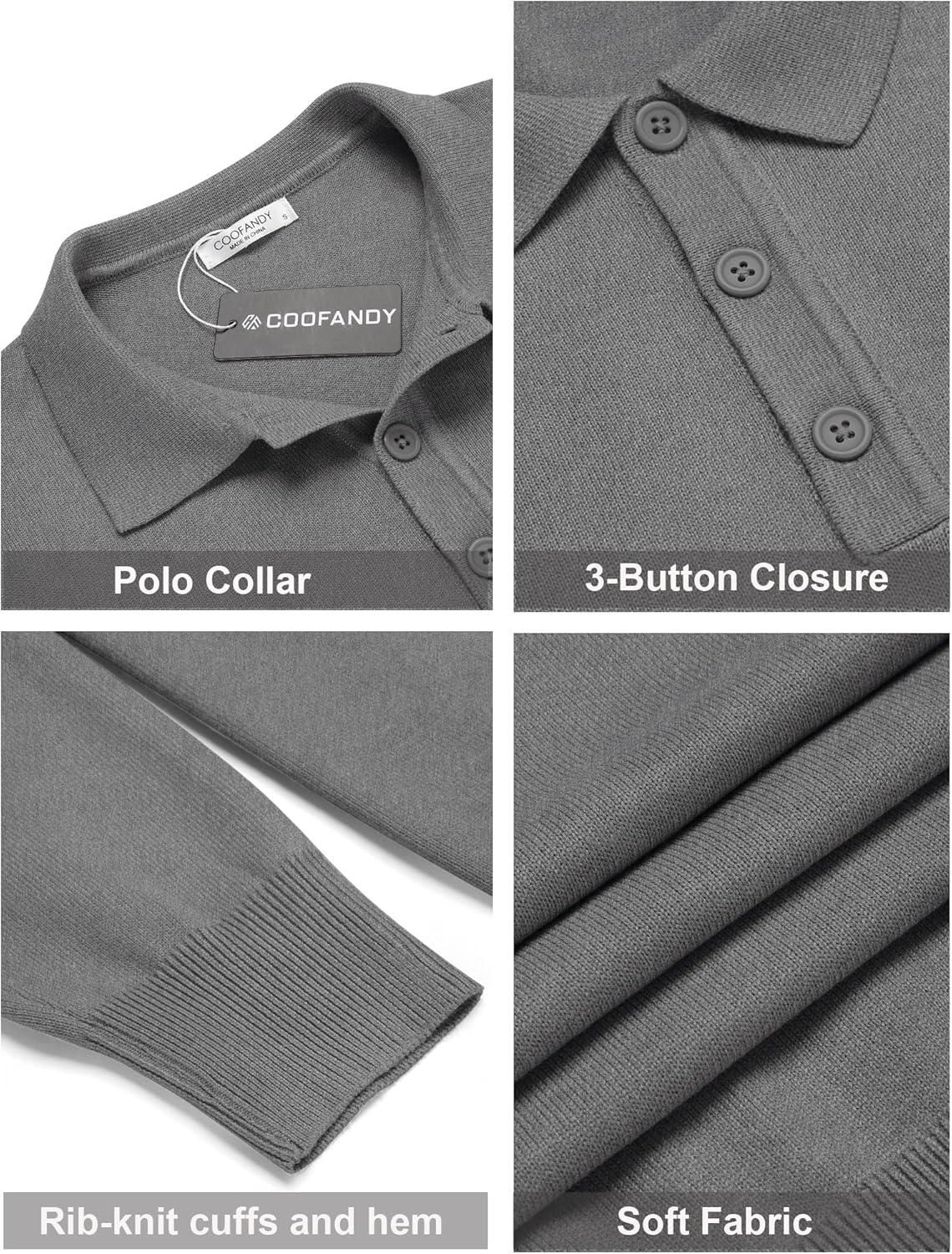 COOFANDY Mens Knit Polo Shirts Casual Long Sleeve Classic Polo Shirts Button Down Golf Shirts(Grey)