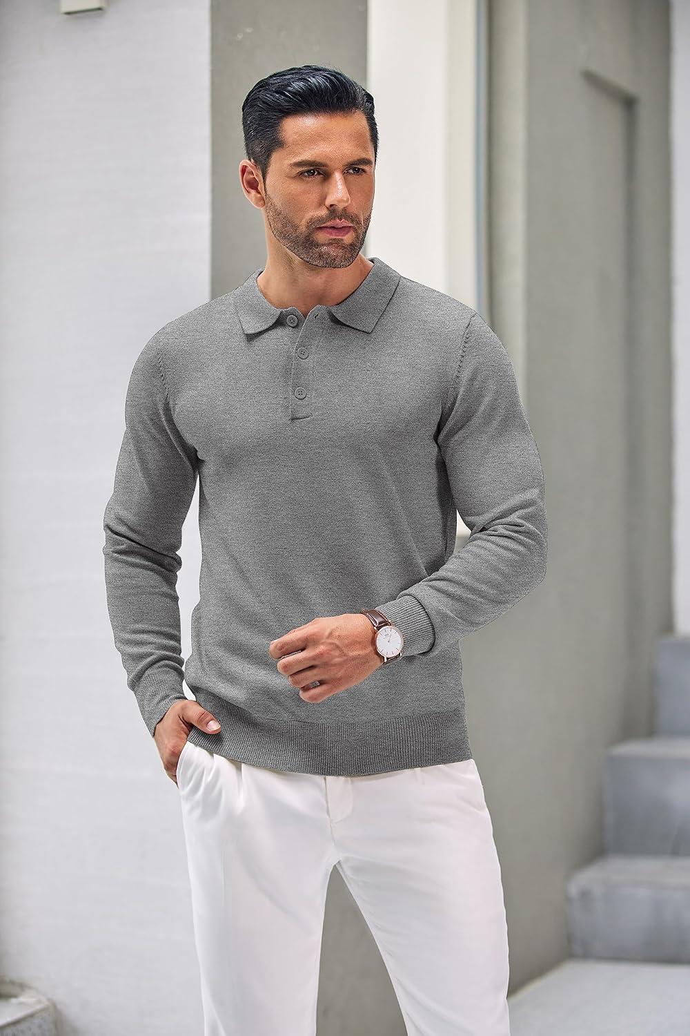 COOFANDY Mens Knit Polo Sweater Long Sleeve Polo Collared Sweaters Hidden Button Casual Pullover Sweater(A- Light Grey)