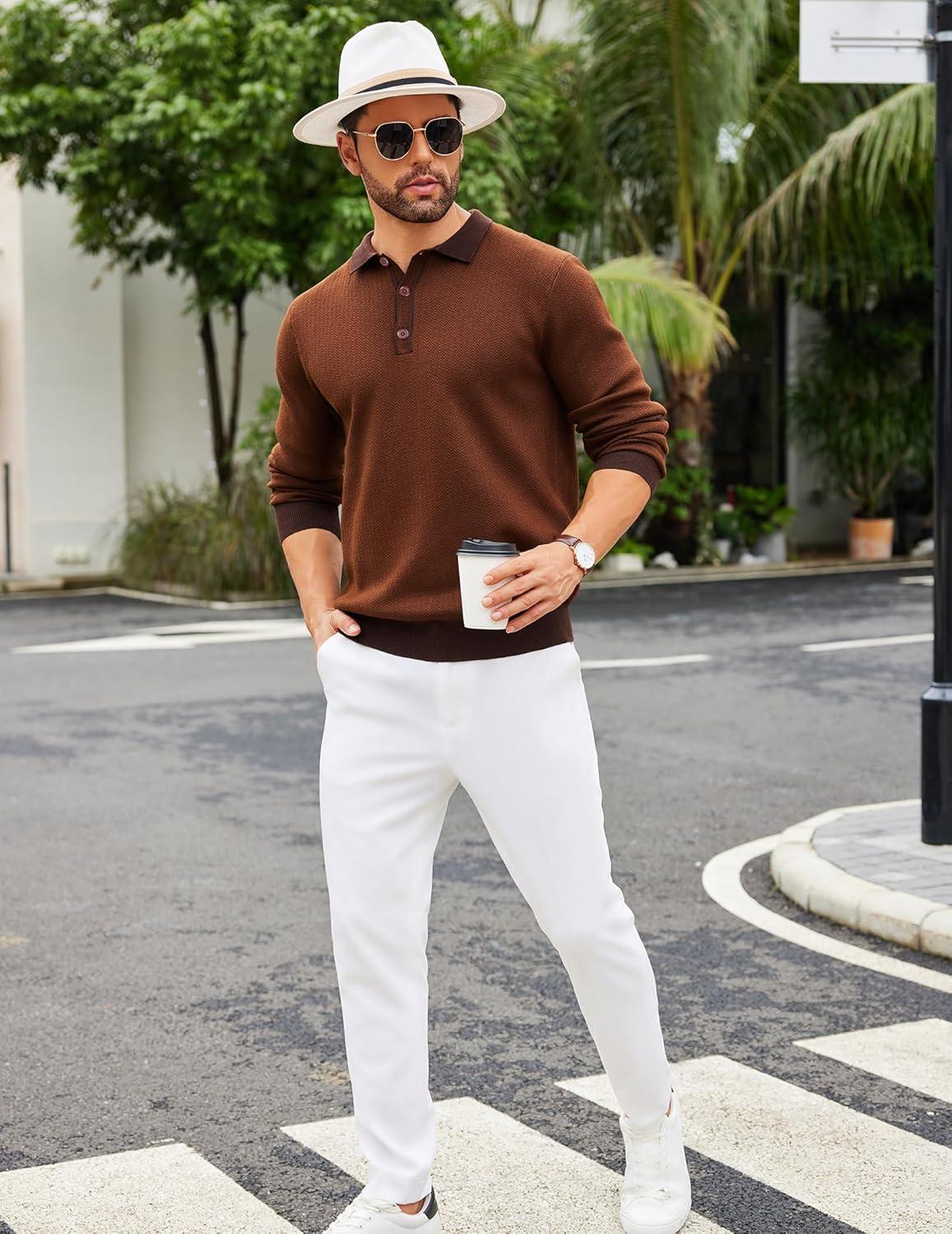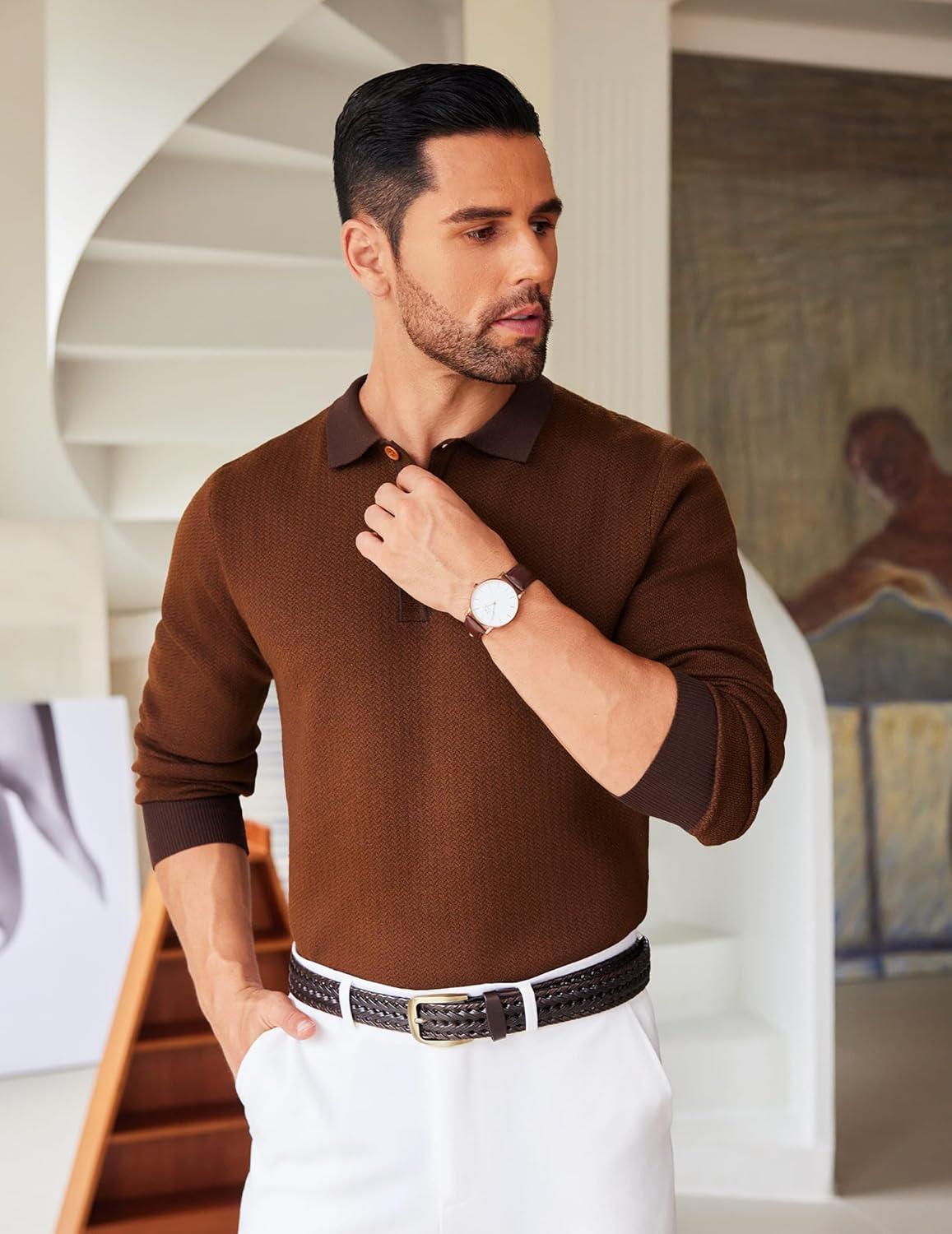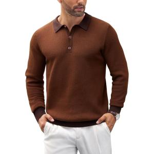 COOFANDY Mens Knit Polo Sweater Long Sleeve Polo Collared Sweaters Hidden Button Casual Pullover Sweater(Brown)