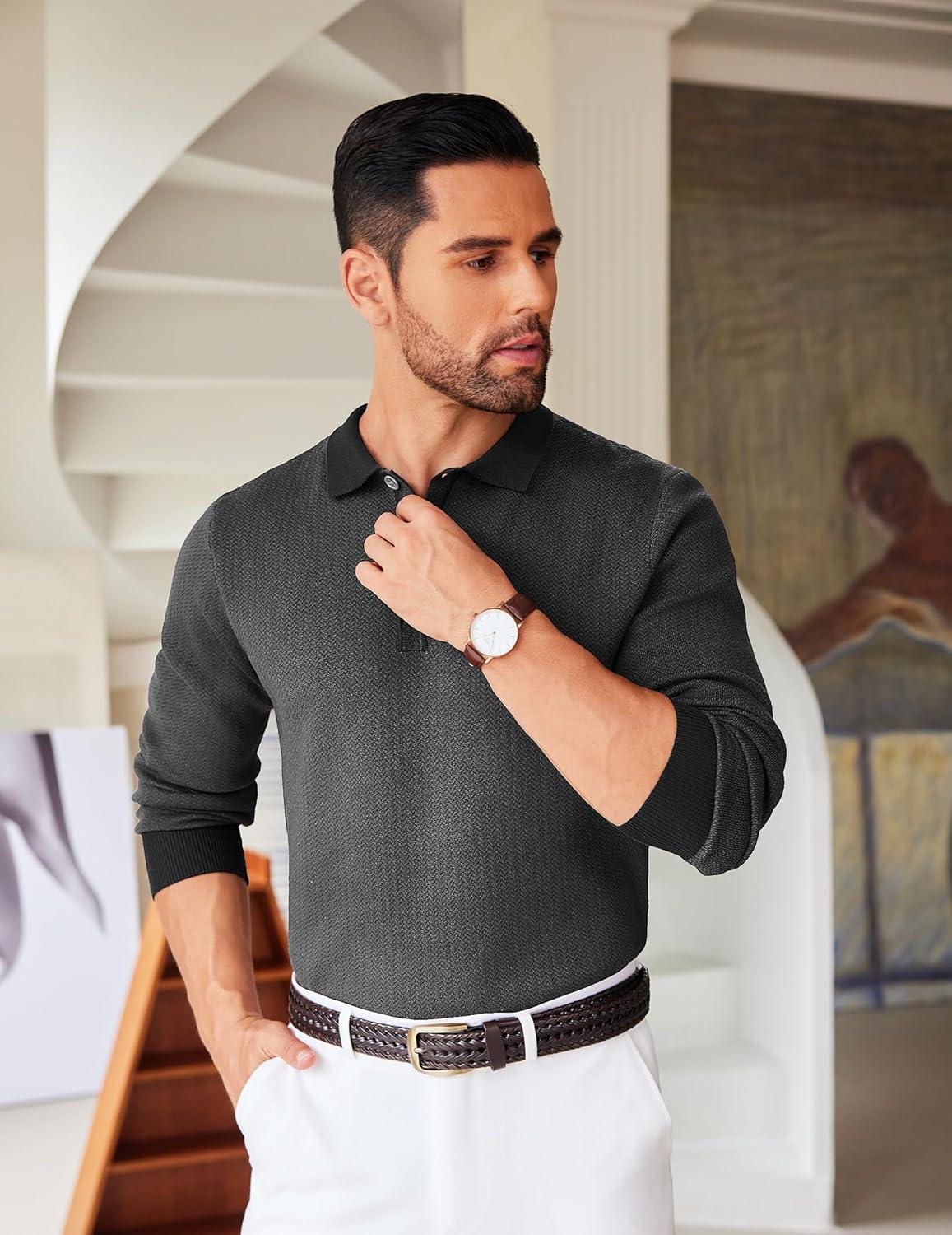 COOFANDY Mens Knit Polo Shirts Casual Long Sleeve Classic Polo Shirts Button Down Golf Shirts(Herringbone Grey)