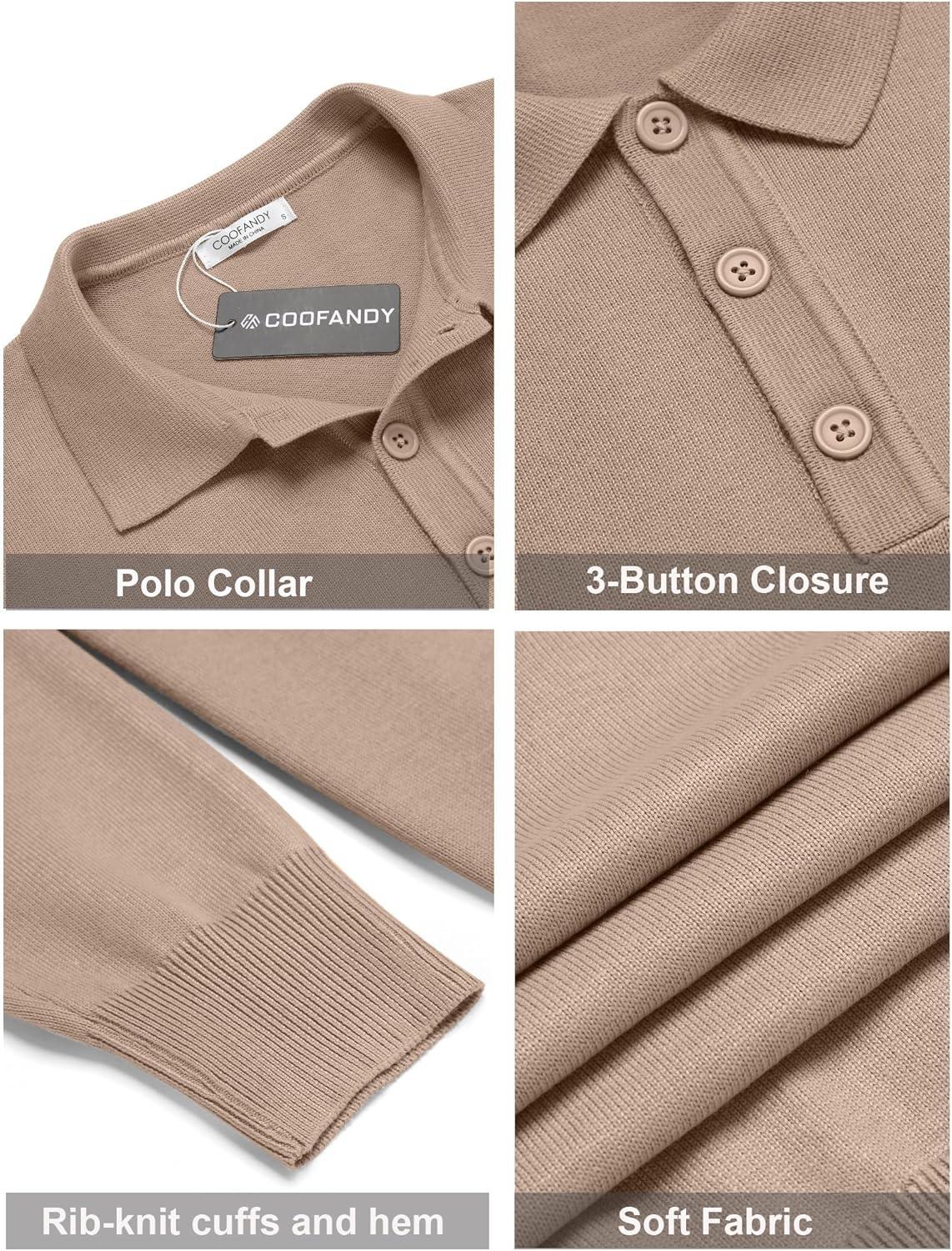 COOFANDY Mens Knit Polo Shirts Casual Long Sleeve Classic Polo Shirts Button Down Golf Shirts(Khaki)