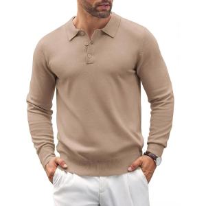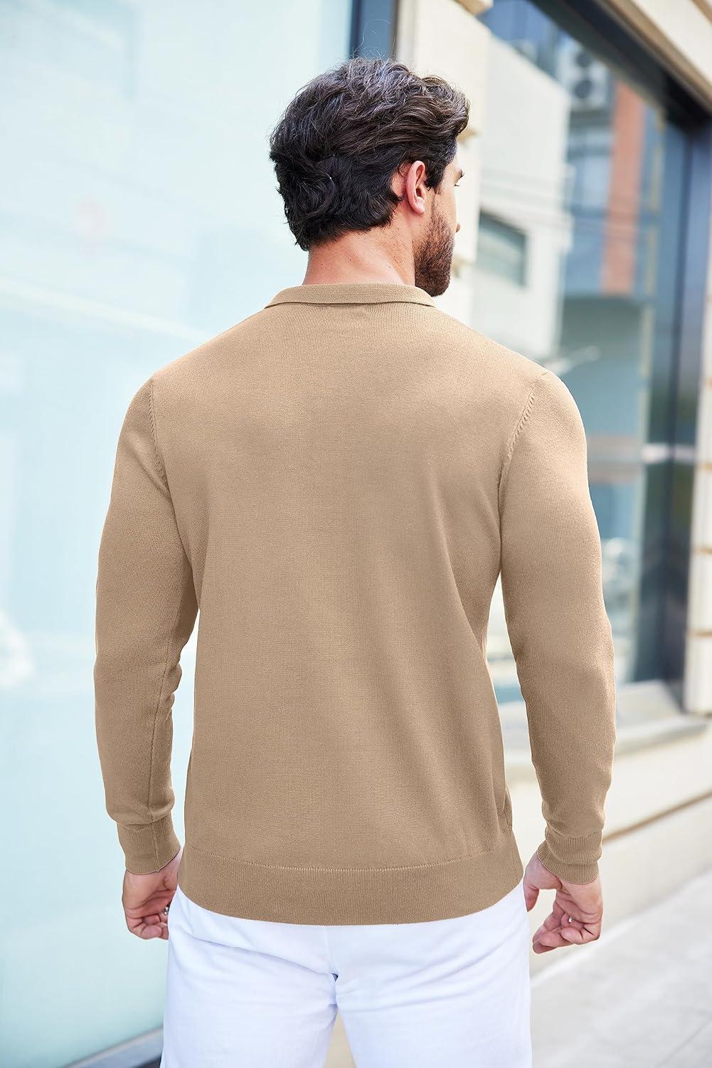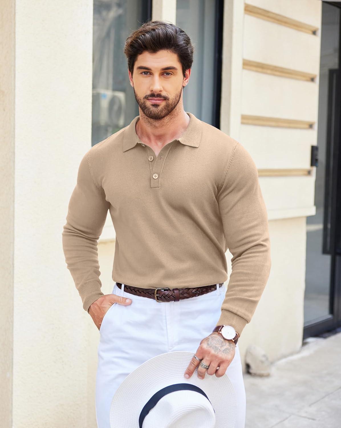 COOFANDY Mens Knit Polo Shirts Long Sleeve Sweater Casual Polo Shirts Lightweight Collared T Shirts(Khaki)