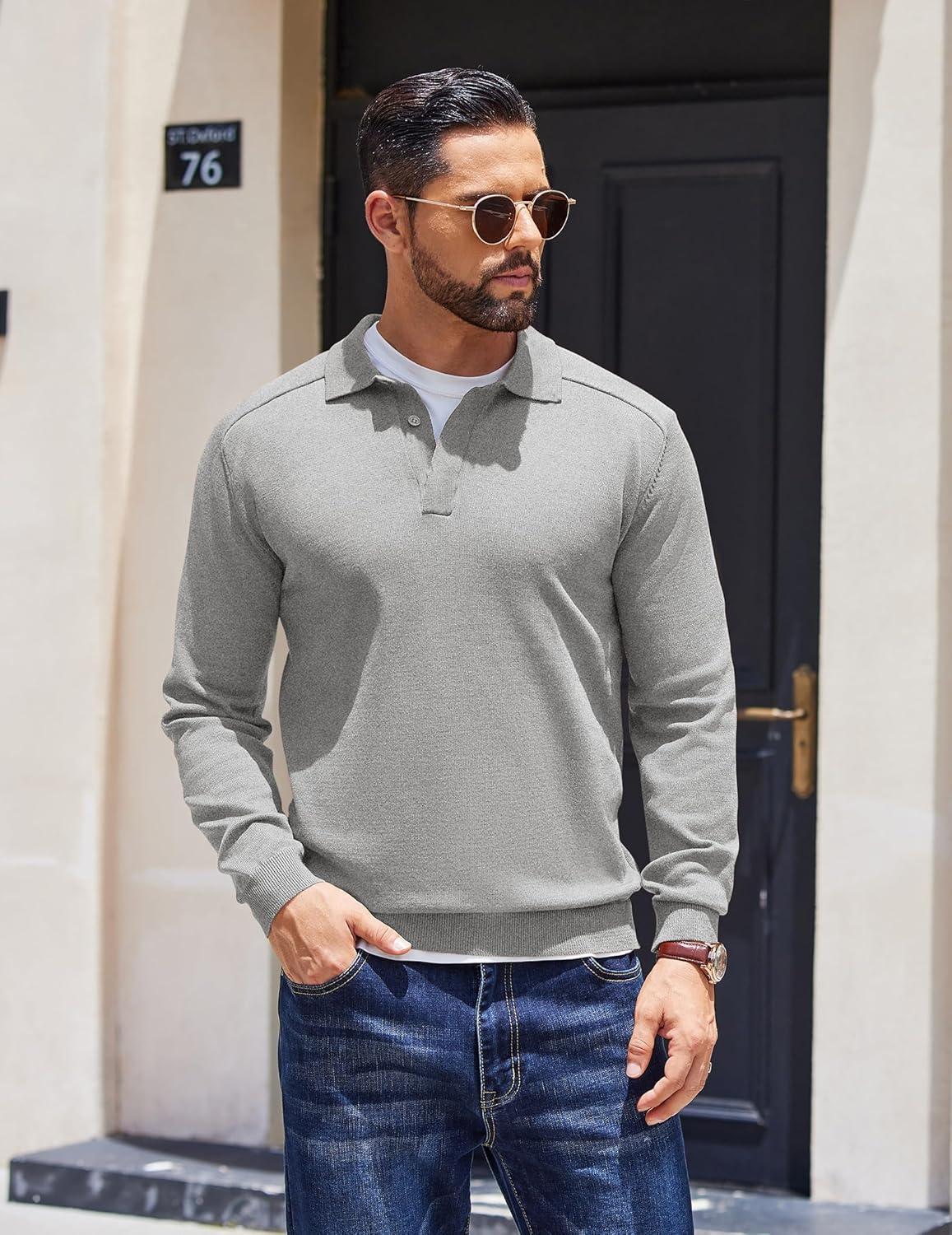 COOFANDY Mens Knit Polo Sweater Long Sleeve Polo Collared Sweaters Hidden Button Casual Pullover Sweater(Light Grey)