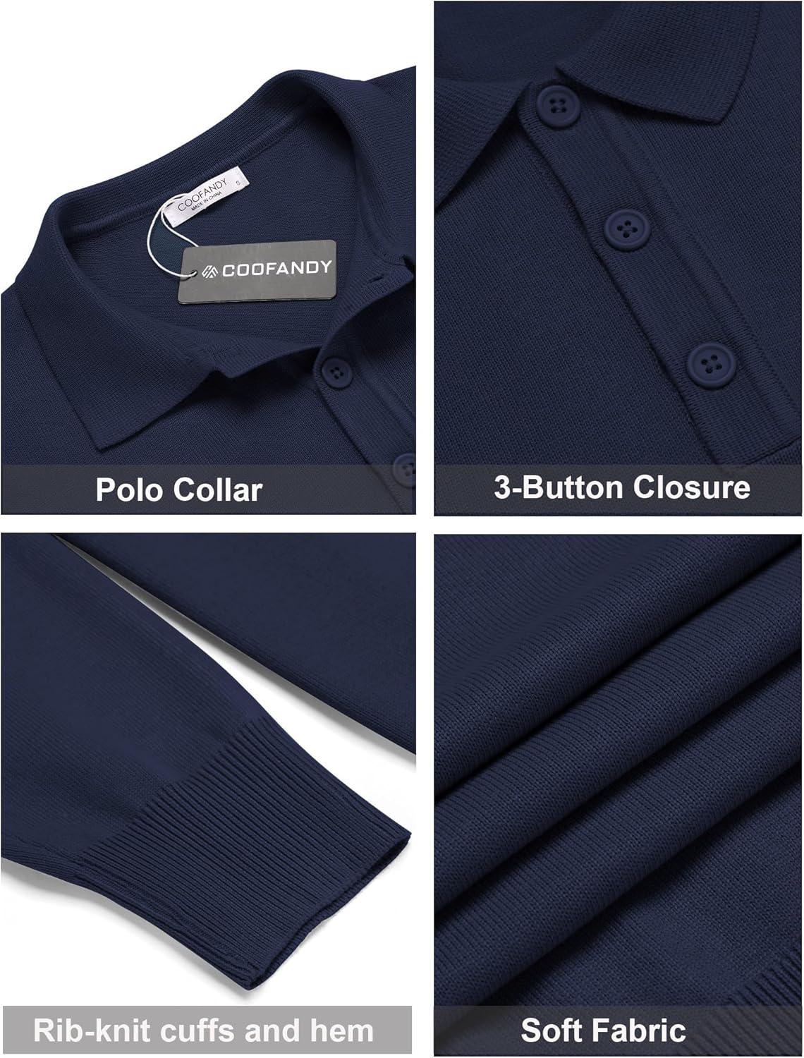 COOFANDY Mens Knit Polo Shirts Casual Long Sleeve Classic Polo Shirts Button Down Golf Shirts(Navy Blue)