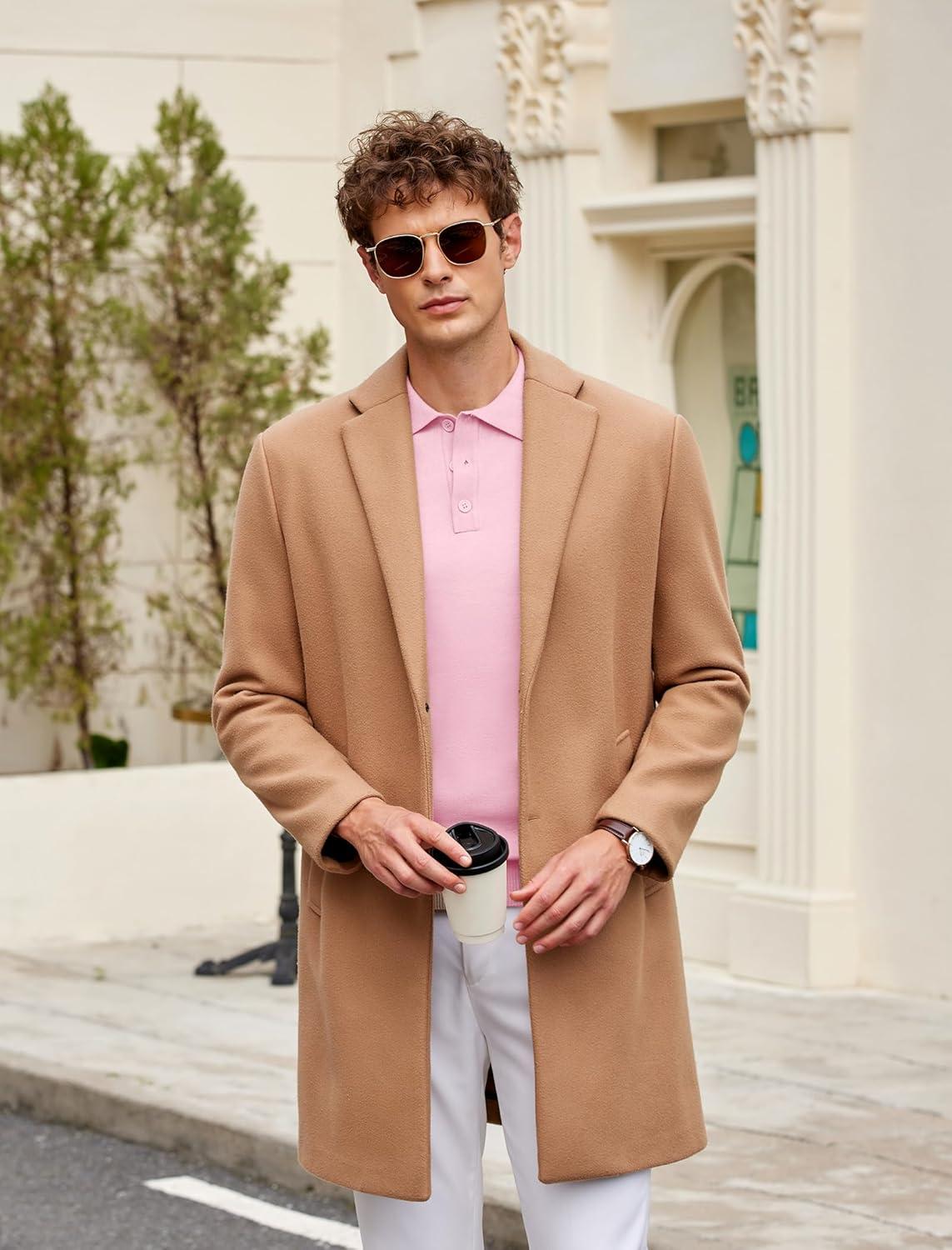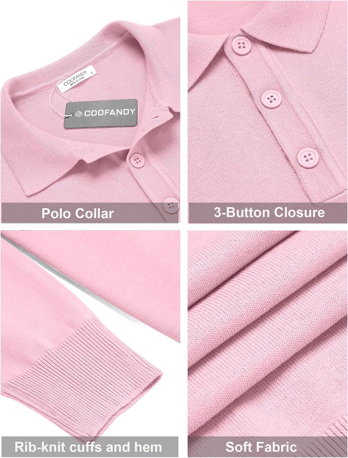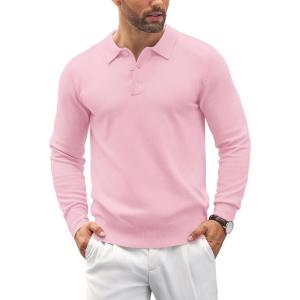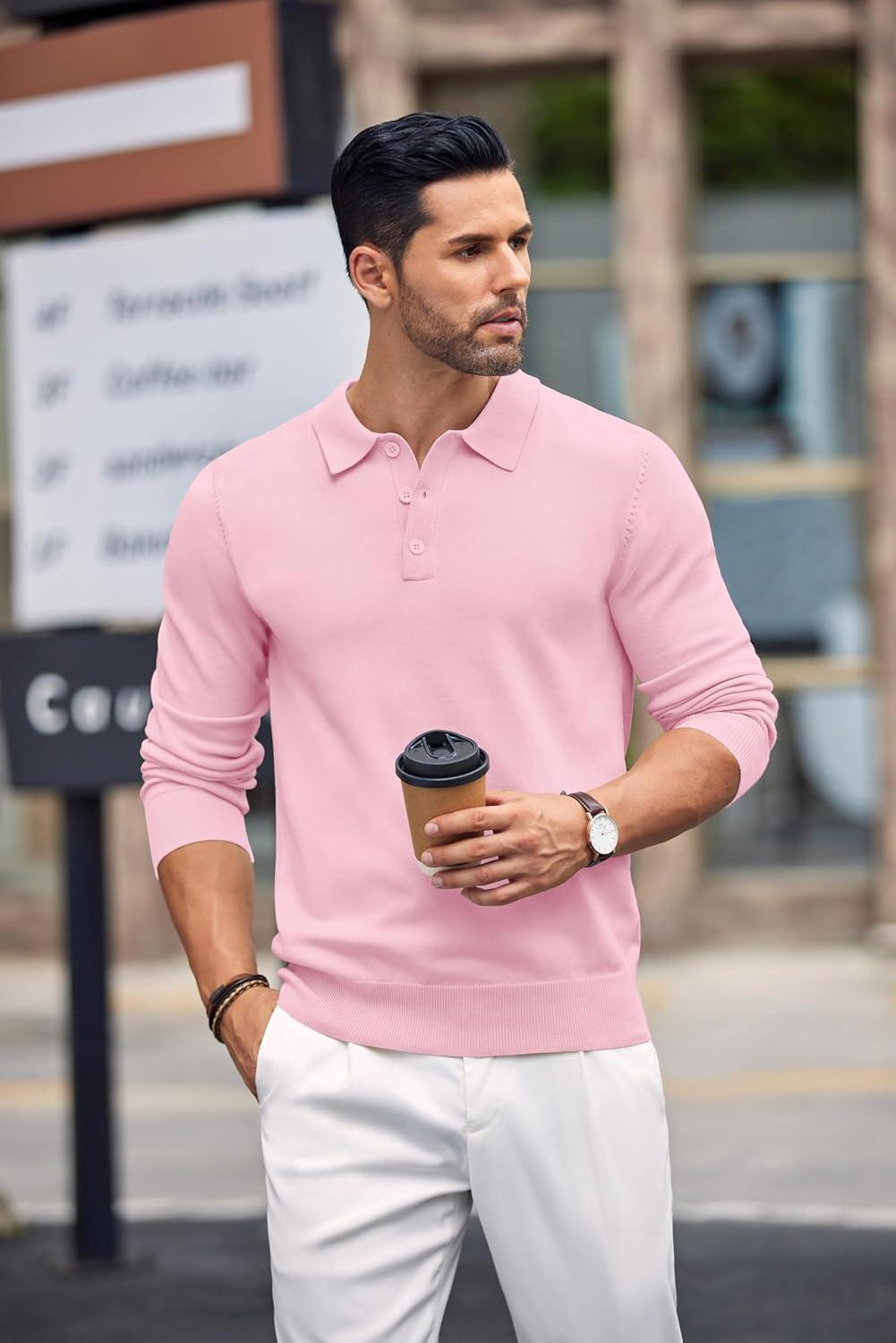 COOFANDY Mens Knit Polo Shirts Casual Long Sleeve Classic Polo Shirts Button Down Golf Shirts(Pink)