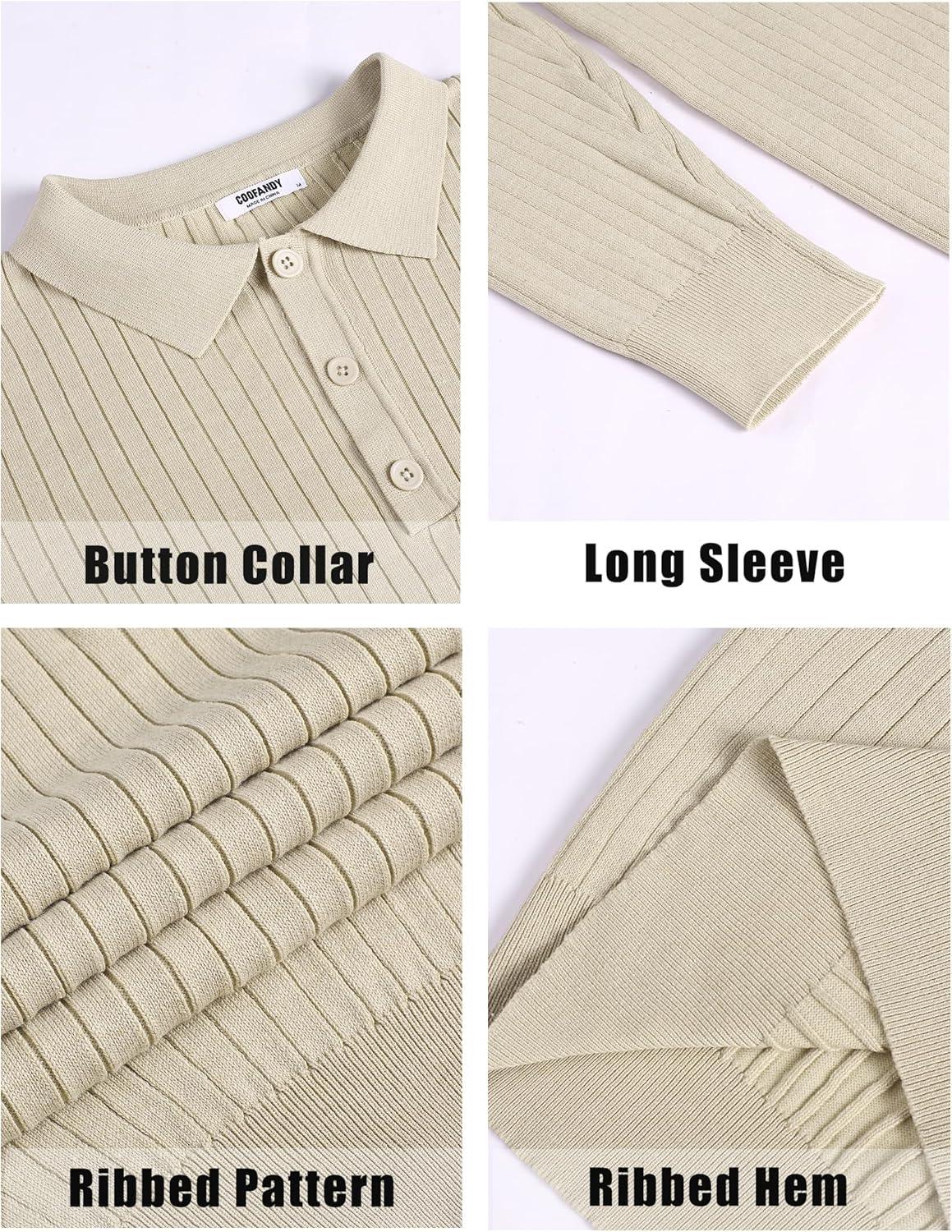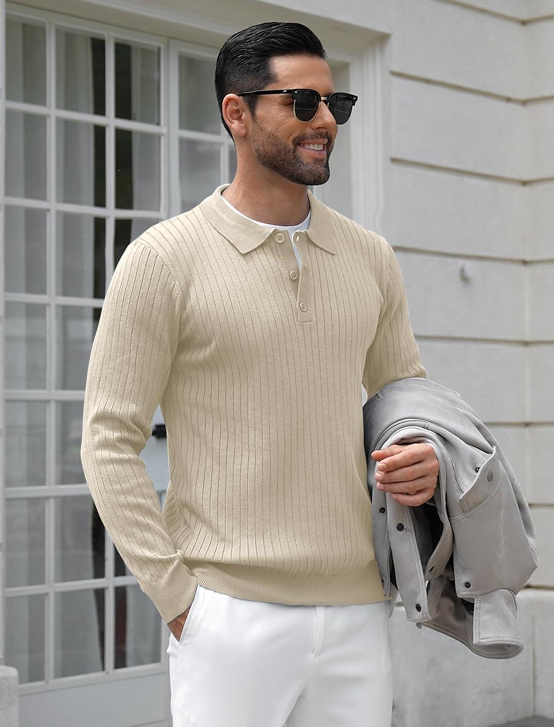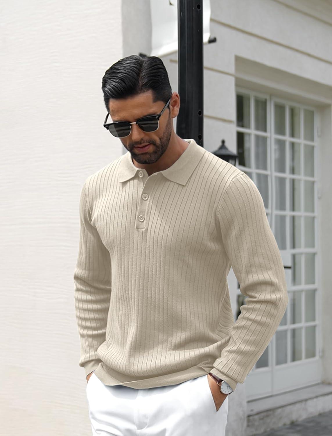 COOFANDY Mens Knit Polo Shirts Casual Long Sleeve Classic Polo Shirts Button Down Golf Shirts(Ribbed Cream)