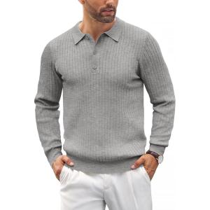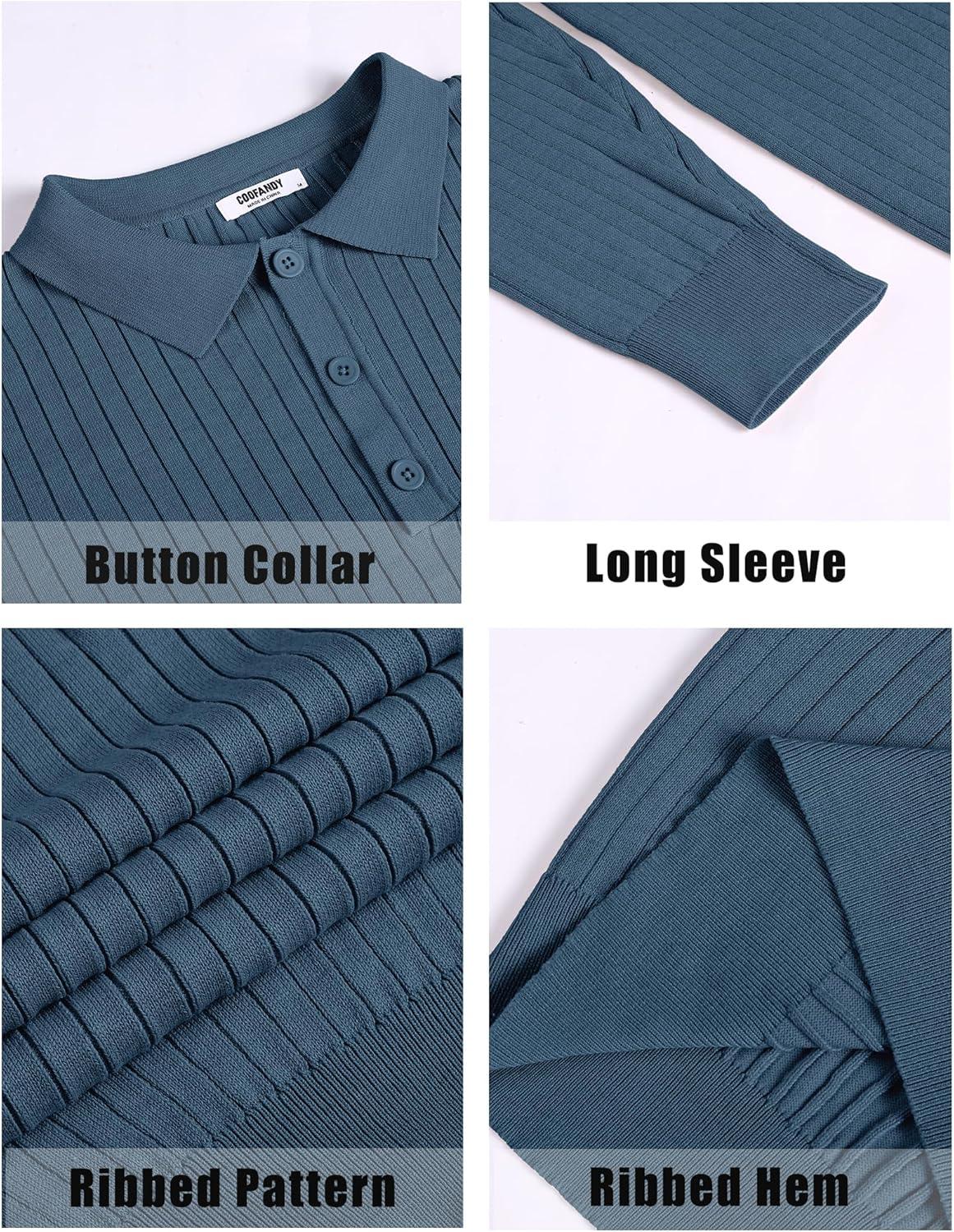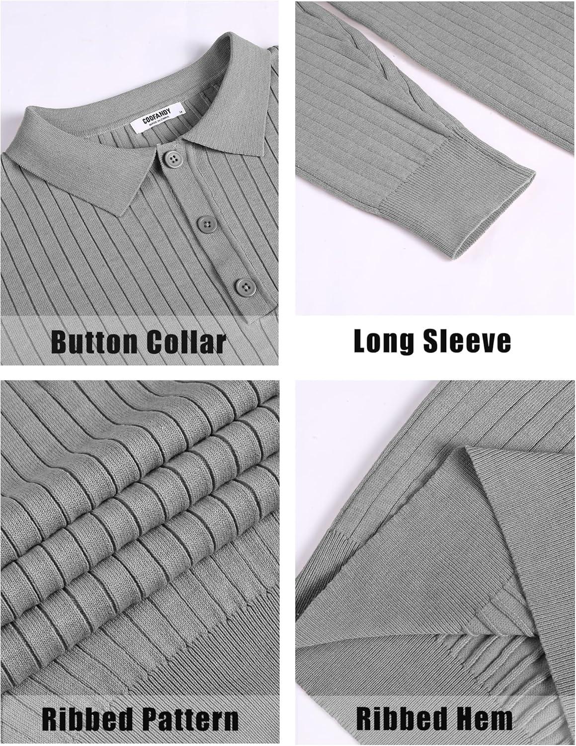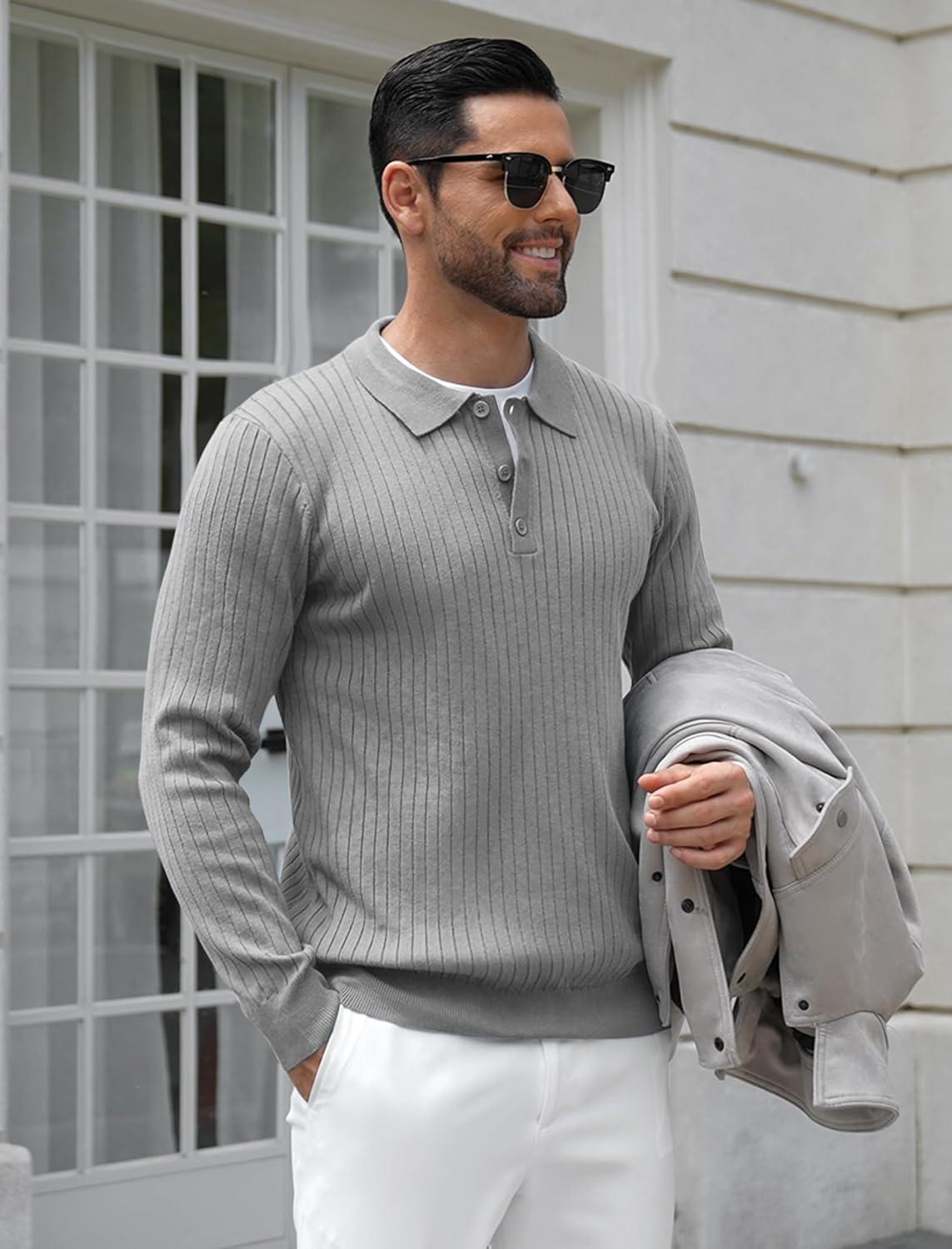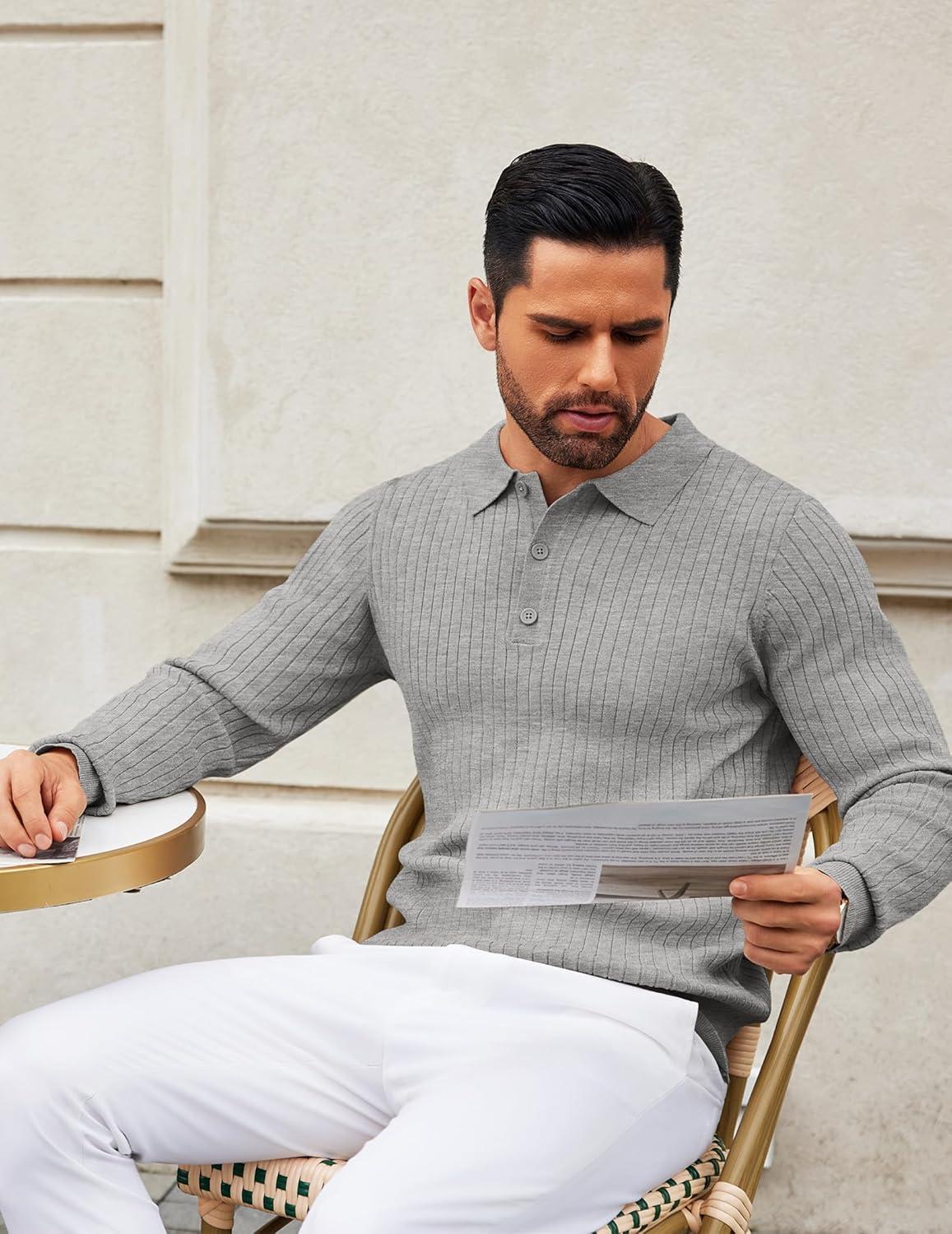 COOFANDY Mens Knit Polo Shirts Casual Long Sleeve Classic Polo Shirts Button Down Golf Shirts(Ribbed Grey)
